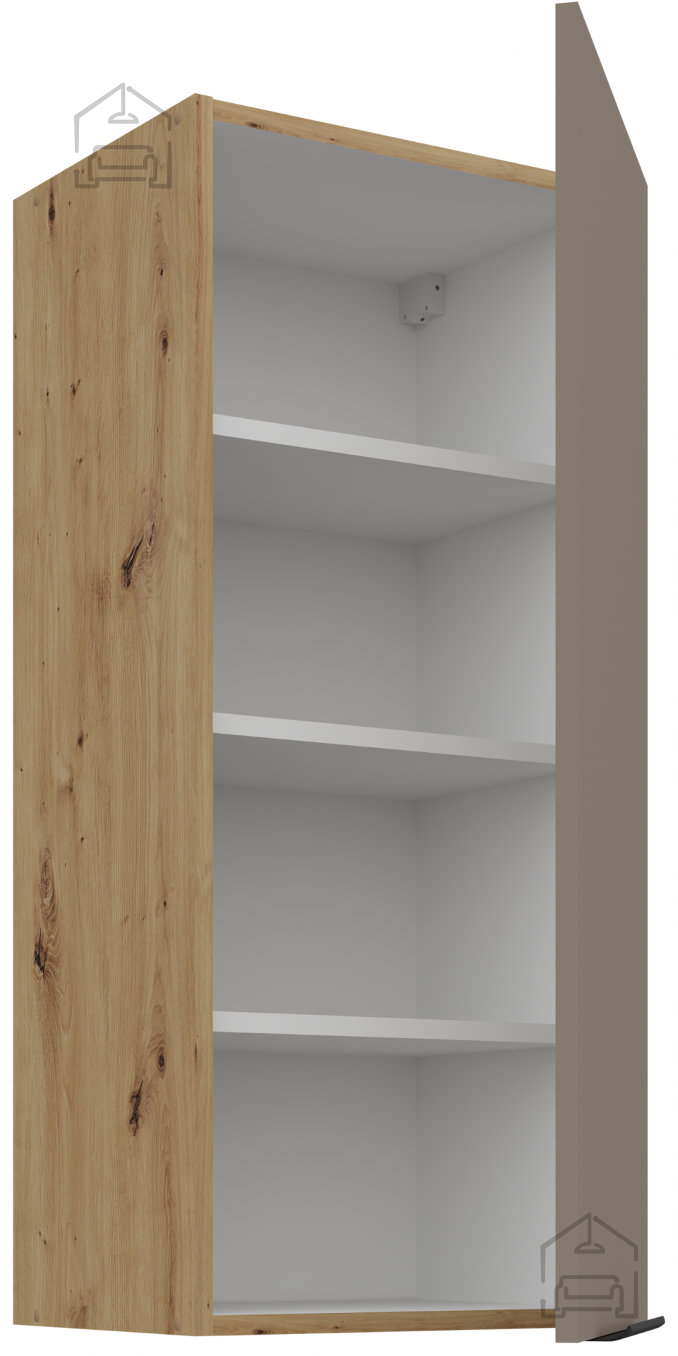 Die Kombination der Farbtöne Kaschmir, Sandgrau und Eiche Artisan schafft einen angenehmen visuellen Kontrast, der dem Raum Wärme und Eleganz verleiht. Eine solche Farbkombination ist besonders in modernen Interieurs beliebt, in denen eine ruhige Palette natürlicher Töne vorherrscht. Die Oberflächen sind pflegeleicht – regelmäßiges Abwischen mit einem weichen Tuch und mildem Reinigungsmittel genügt, damit die Küche ihr Aussehen über Jahre hinweg behält.