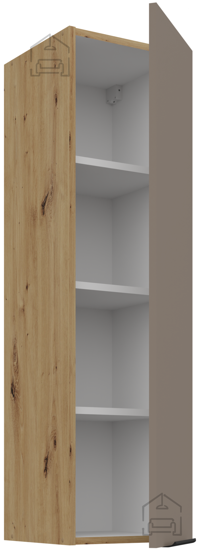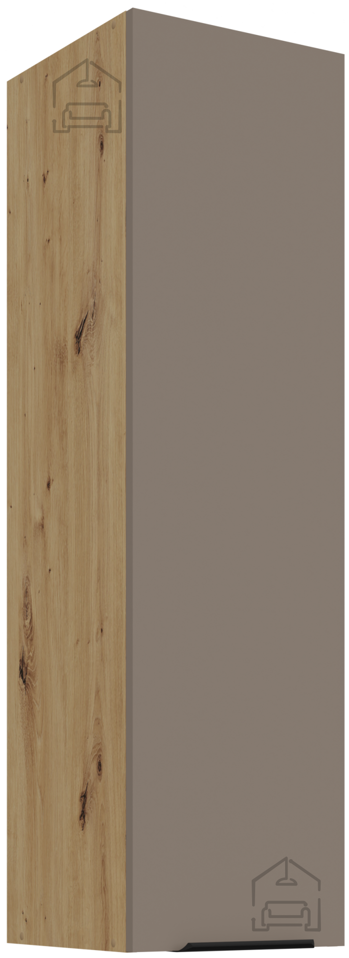 Das Grundmaterial der Küchenzeile Aria ist eine laminierte Platte mit einer Stärke von 16 mm, die sich durch hervorragende Stabilität und Abriebfestigkeit auszeichnet. Die Oberfläche im Farbton Sandgrau/Artisan Eiche vereint moderne Grautöne mit der Wärme von natürlichem Holz und schafft so einen ausgewogenen ästhetischen Eindruck. Die Kanten sind präzise bearbeitet und geschützt, was zusätzlich zur Langlebigkeit der Elemente beiträgt. Der Rahmen besteht aus Spanplatte, die strukturelle Stabilität und ästhetische Vollendung des Ganzen gewährleistet.