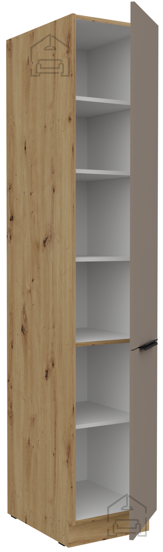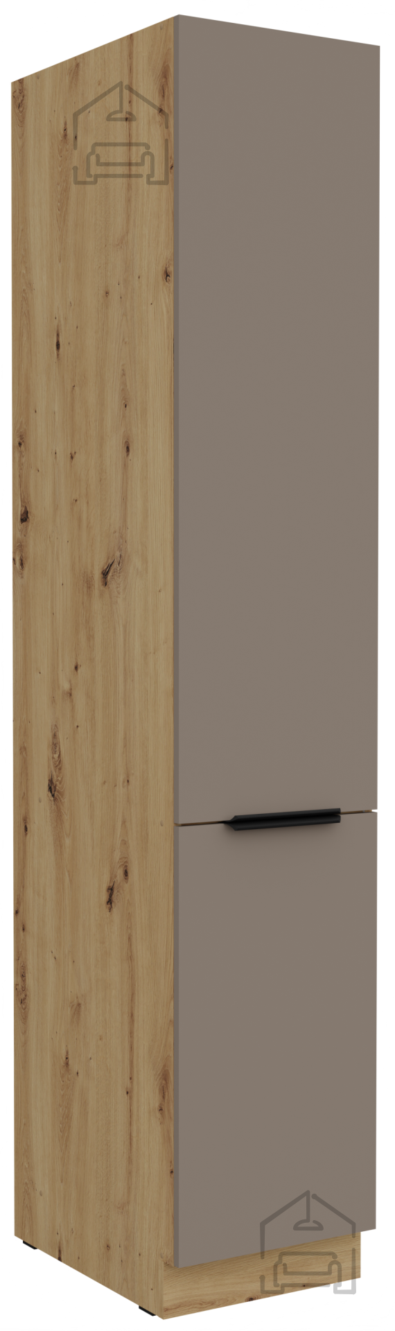 Das Grundmaterial des Küchenensembles Aria ist eine laminierte Platte mit einer Stärke von 16 mm, die sich durch hervorragende Stabilität und Abriebfestigkeit auszeichnet. Die Oberfläche im Farbton Sandgrau/Eiche Artisan vereint modernes Grau und die Wärme von Naturholz, wodurch ein ausgewogener ästhetischer Eindruck entsteht. Die Kanten sind präzise bearbeitet und geschützt, was zusätzlich zur Langlebigkeit der Elemente beiträgt. Der Rahmen besteht aus Spanplatte, die strukturelle Stabilität und ästhetische Vollendung des Ganzen gewährleistet.