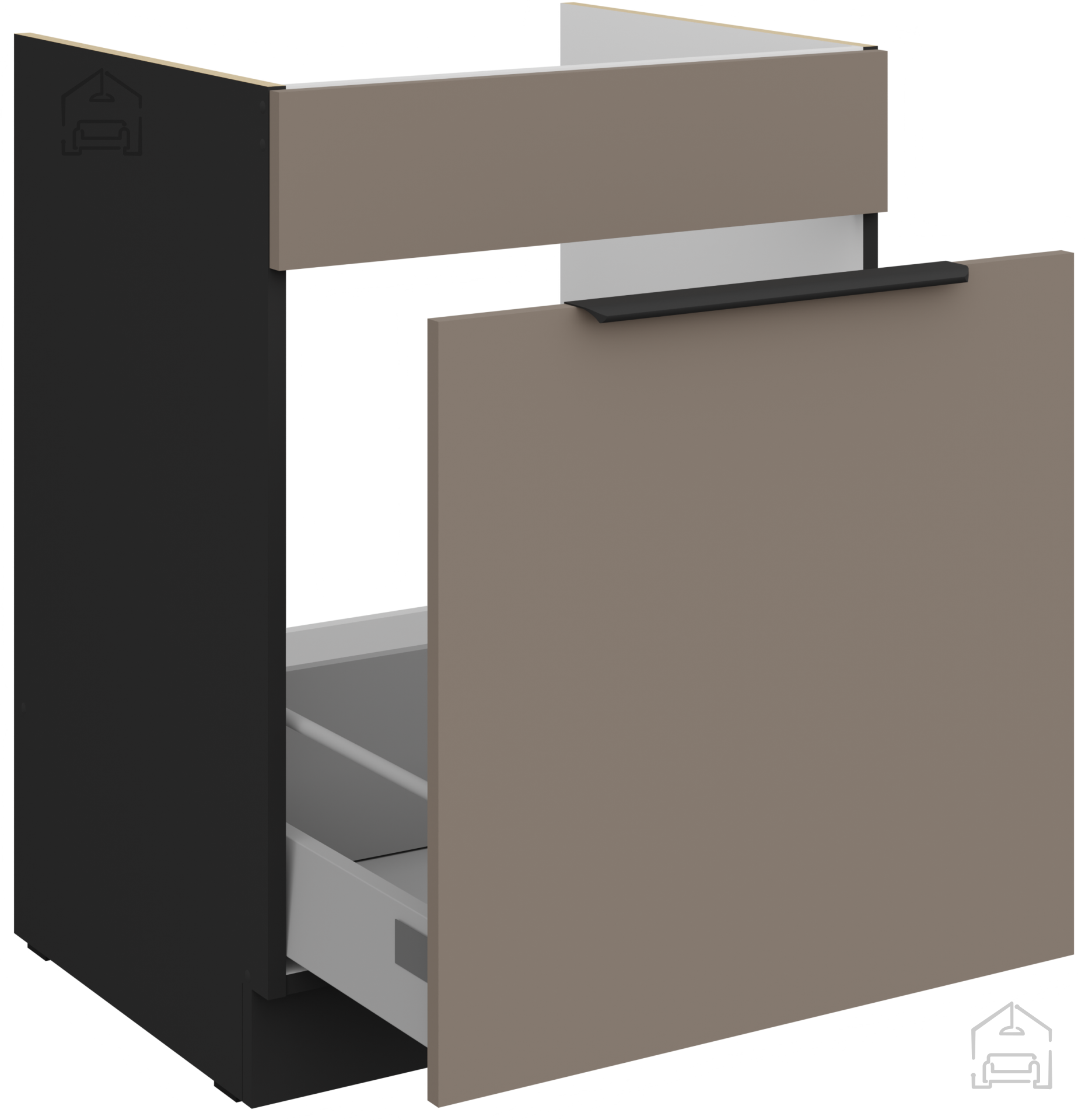Die Farbkombination Sandgrau/Schwarz schafft ein modernes, aber zugleich warmes Erscheinungsbild der Küche. Der hellere Farbton „Sandgrau“ vermittelt ein Gefühl von Geräumigkeit und Frische, während die schwarzen Akzente einen raffinierten Kontrast und Eleganz hinzufügen. Eine solche Kombination passt hervorragend zu verschiedenen Arten von Bodenbelägen und Küchenaccessoires und ermöglicht daher eine breite Palette an Innenraumgestaltungen und persönlichen Anpassungen.