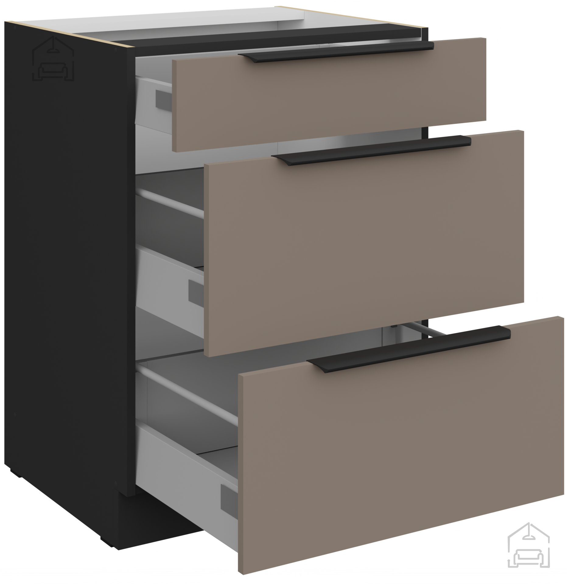 Die Farbkombination Sandgrau/Schwarz schafft ein modernes, aber gleichzeitig warmes Erscheinungsbild der Küche. Der hellere Farbton „Sandgrau“ vermittelt ein Gefühl von Geräumigkeit und Frische, während schwarze Akzente einen raffinierten Kontrast und Eleganz hinzufügen. Eine solche Kombination passt hervorragend zu verschiedenen Bodenbelägen und Küchenausstattungen und ermöglicht daher eine breite Palette an Innenraumgestaltungen und individuellen Anpassungen.