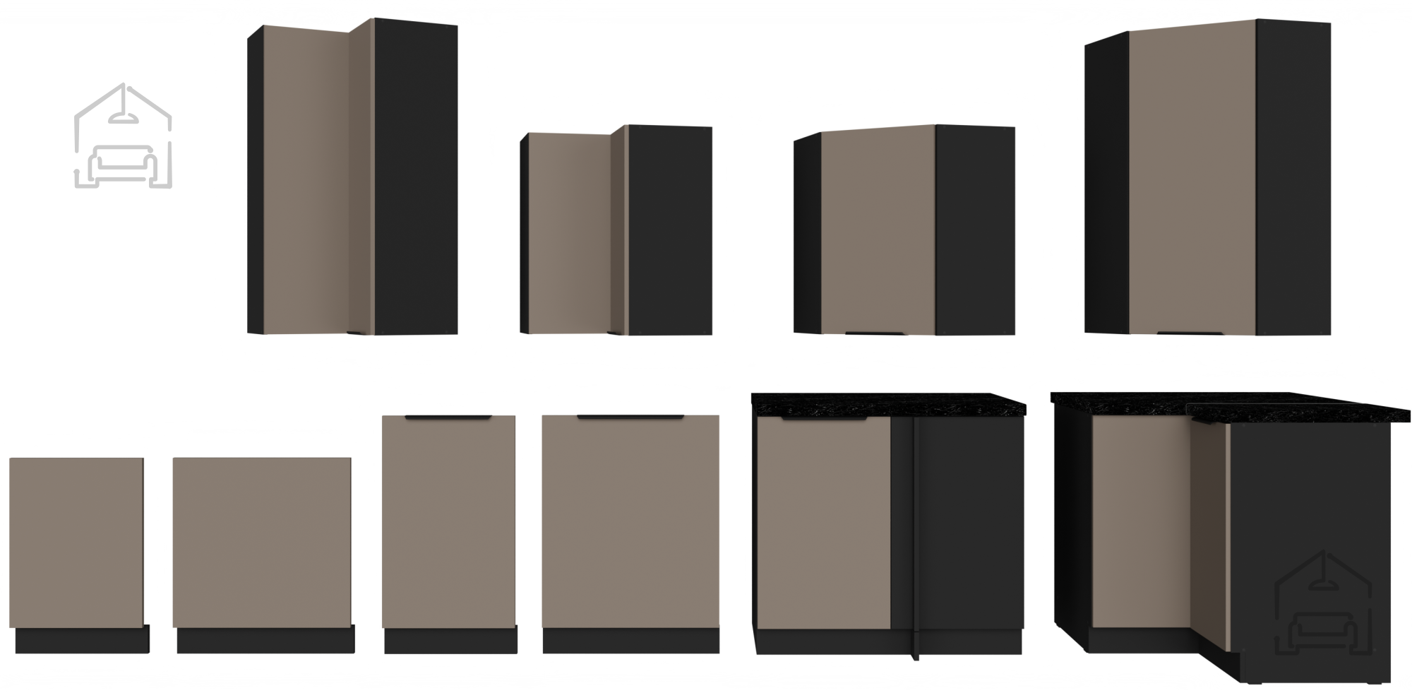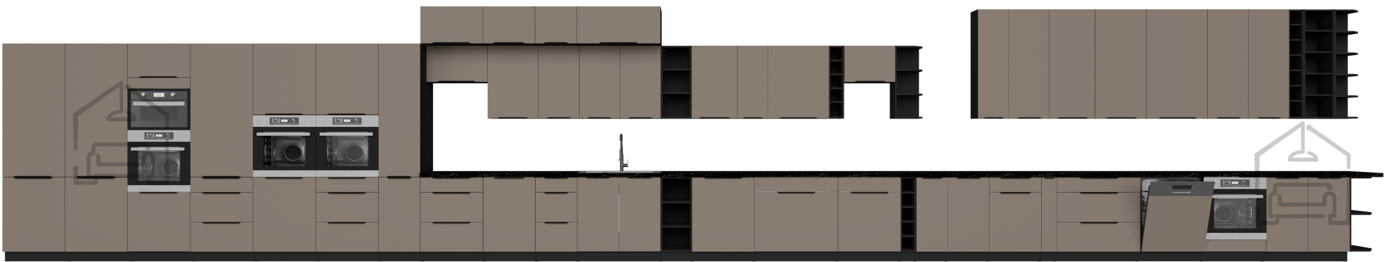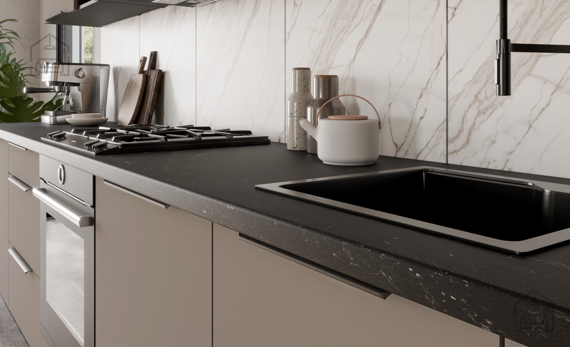 Die Farbkombination Sandgrau/Schwarz schafft ein modernes, aber gleichzeitig warmes Erscheinungsbild der Küche. Der hellere Farbton „Sandgrau“ vermittelt ein Gefühl von Geräumigkeit und Frische, während die schwarzen Akzente einen raffinierten Kontrast und Eleganz hinzufügen. Eine solche Kombination harmoniert hervorragend mit verschiedenen Bodenbelägen und Küchenergänzungen und ermöglicht daher eine breite Palette an Innenraumgestaltungen und persönlichen Anpassungen.