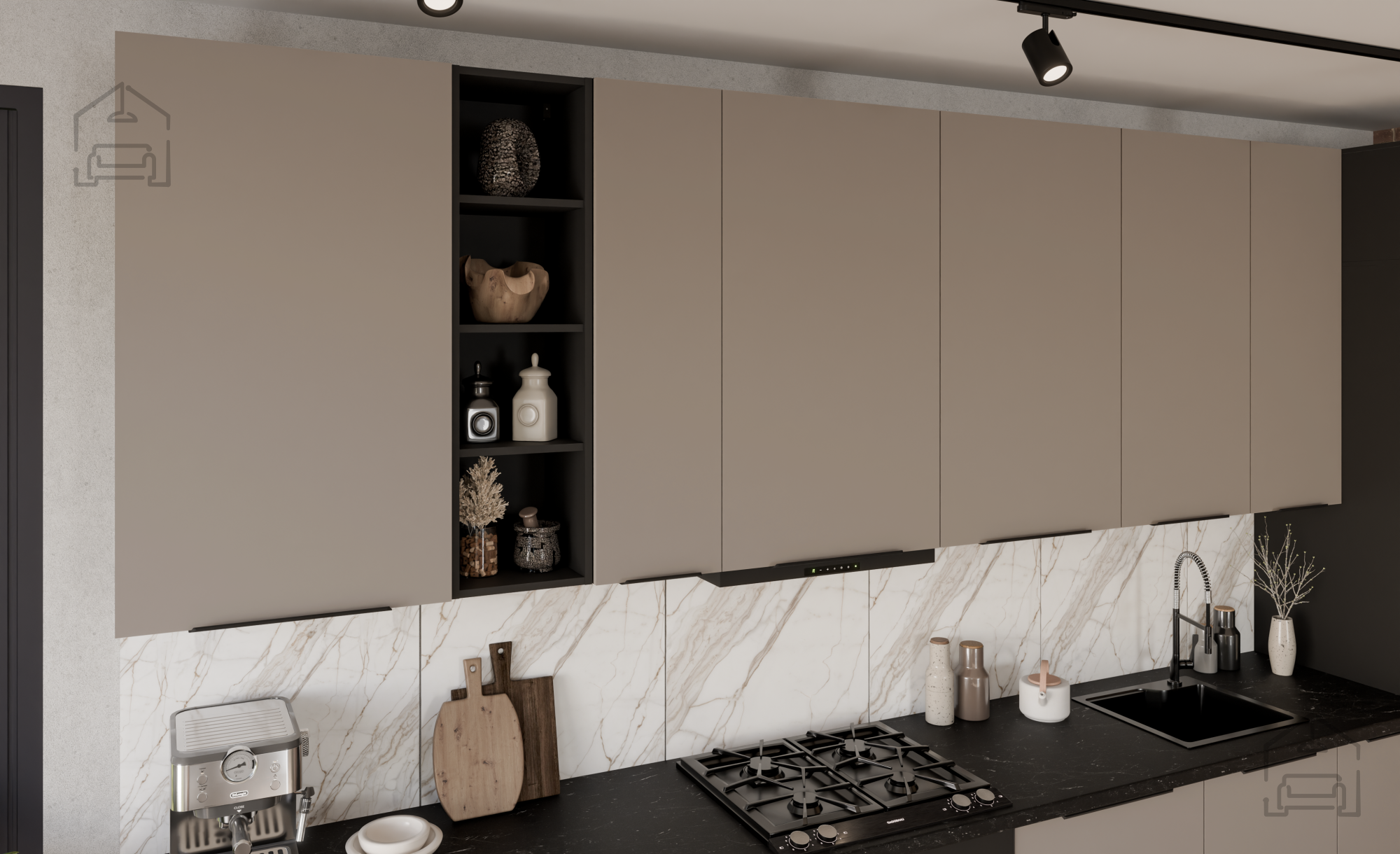 Besondere Aufmerksamkeit wurde den Details gewidmet, wie zum Beispiel den Griffen Edge UA-HEXA in schwarz-aluminiumfarbener Ausführung. Diese Griffe ergänzen nicht nur das moderne Erscheinungsbild des Ensembles, sondern sind auch ergonomisch für eine komfortable Nutzung gestaltet. Der Abstand zwischen den Griffen liegt zwischen 64 mm und 320 mm, was eine ästhetisch ausgewogene Platzierung an verschiedenen Elementen ermöglicht und ein einfaches Öffnen von Türen und Schubladen gewährleistet.