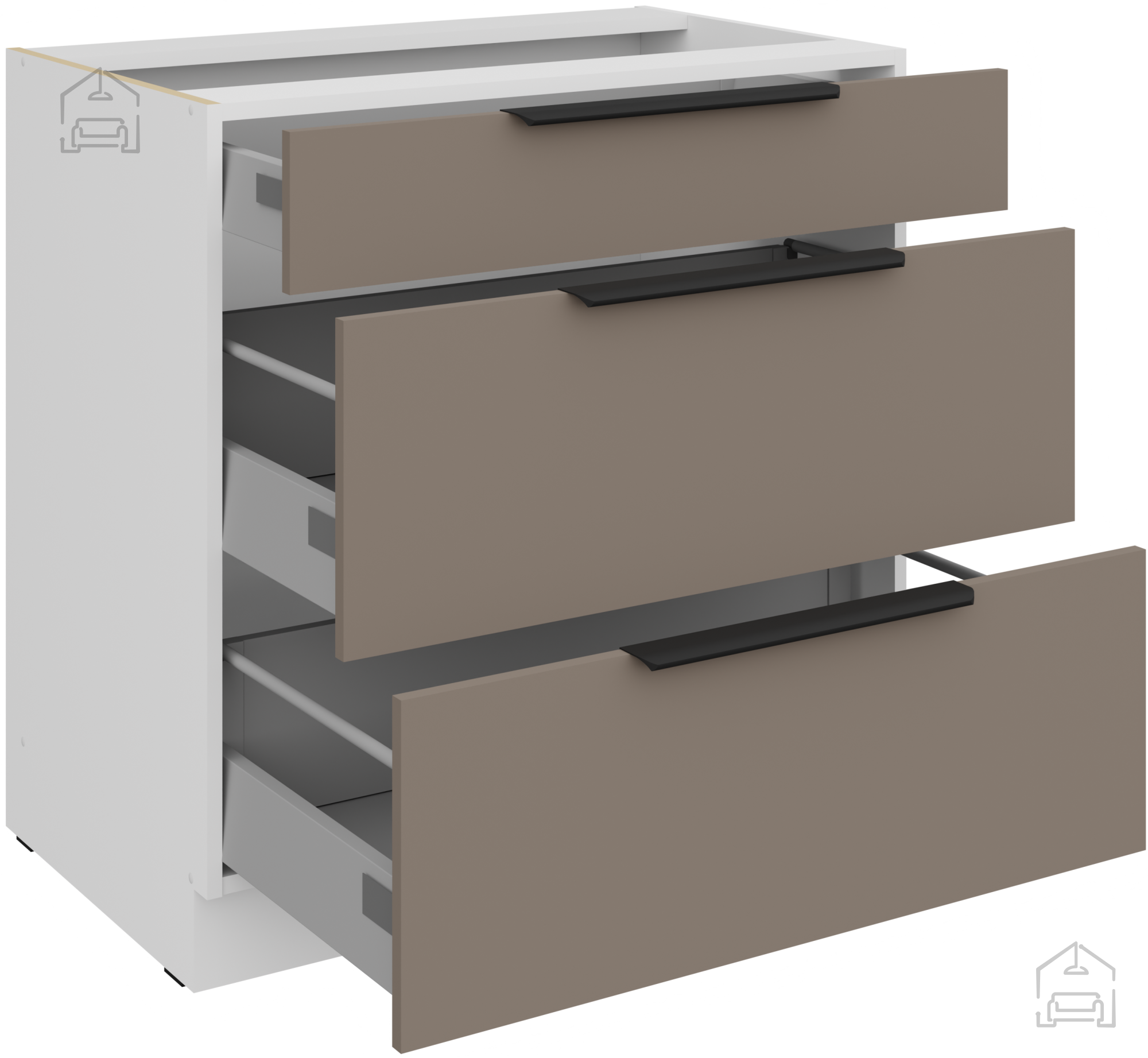 Die Farbkombination sandgrau/weiß (sandgrau und weiß) schafft einen hellen, luftigen Eindruck und vermittelt zugleich ein Gefühl von Wärme und Reinheit. Ein solches Design ermöglicht eine einfache Kombination mit verschiedenen Dekorarten, Bodenbelägen und Accessoires. Die weiße Farbe vergrößert den Raum optisch und vermittelt ein Gefühl von Ordnung, während die sandgrauen Töne einen modernen Touch und Eleganz verleihen. Griffe edge UA‑HEXA in schwarz‑aluminiumfarbener Ausführung sind minimalistisch, aber zugleich markant, da sie Ästhetik und Praktikabilität vereinen. Der Griffabstand beträgt 64 mm bis 320 mm, was eine bequeme Nutzung aller Türen und Schubladen ermöglicht.