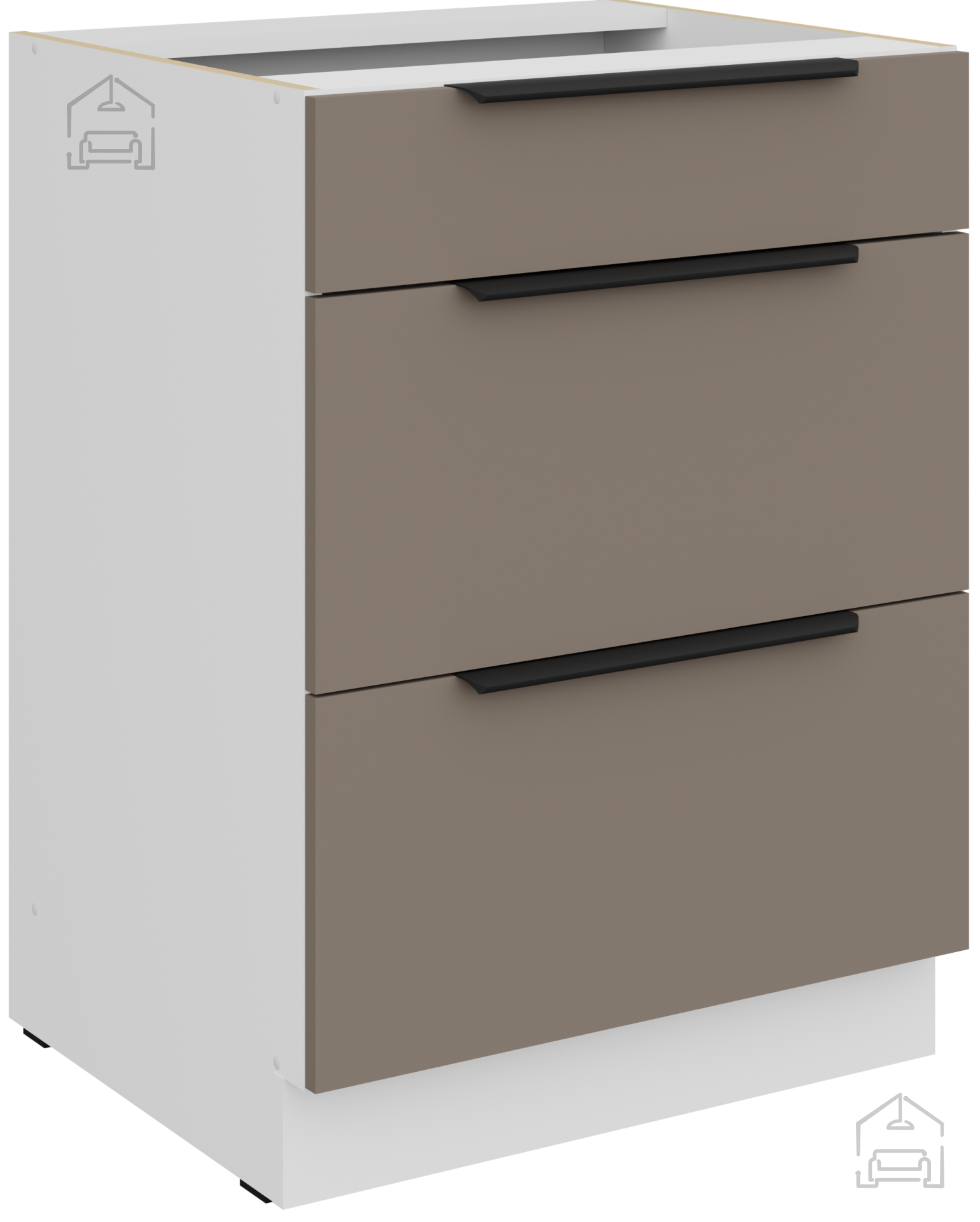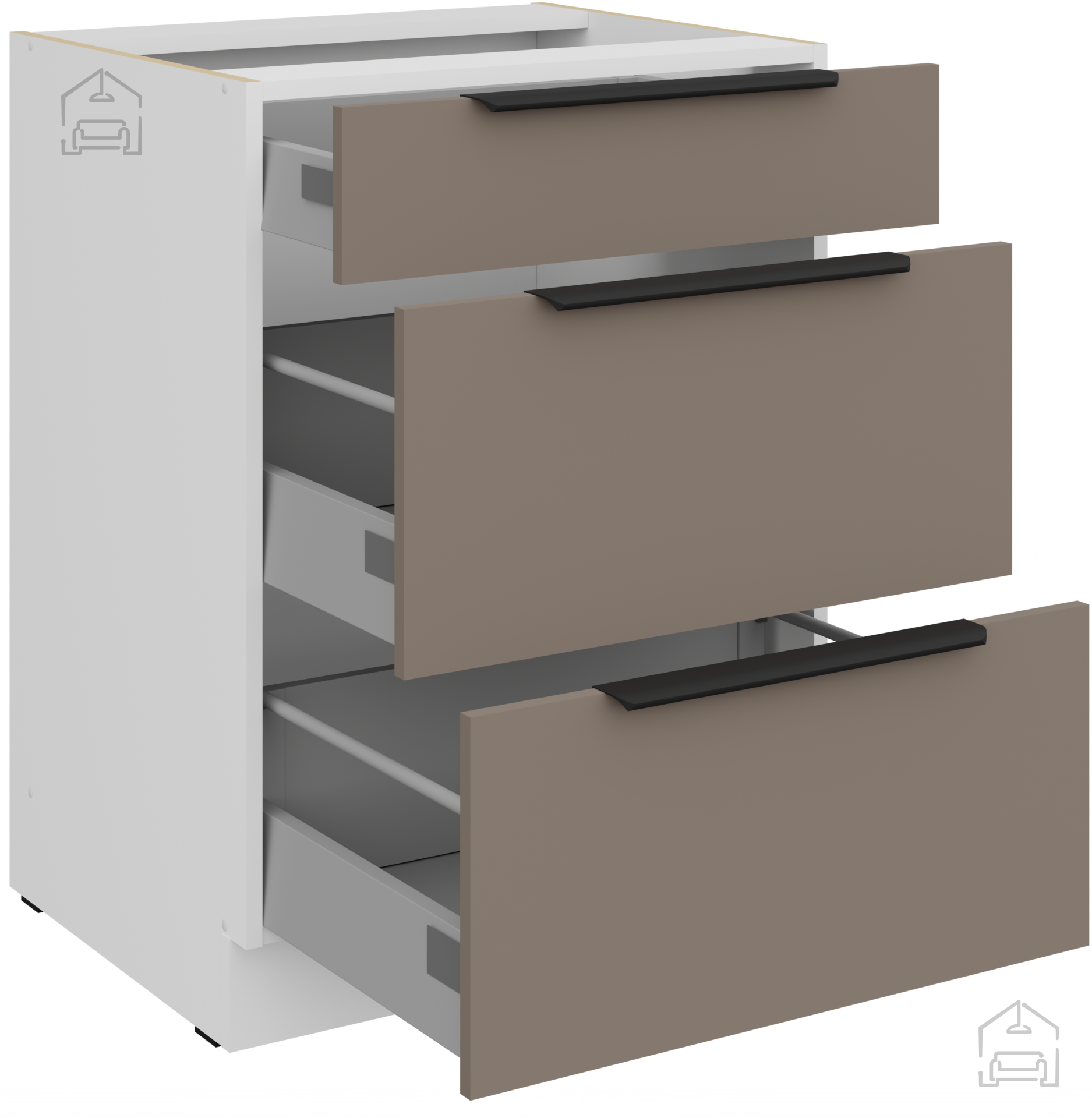Die Farbkombination sandgrau/weiß (sandgrau und weiß) schafft einen hellen, luftigen Eindruck und vermittelt gleichzeitig ein Gefühl von Wärme und Reinheit. Ein solches Design ermöglicht eine einfache Kombination mit verschiedenen Arten von Dekor, Bodenbelägen und Accessoires. Die weiße Farbe vergrößert den Raum optisch und vermittelt ein Gefühl von Ordnung, während die sandgrauen Töne einen modernen Touch und Eleganz hinzufügen. Griffe edge UA‑HEXA in schwarz‑aluminiumfarbener Ausführung sind minimalistisch, aber zugleich markant, da sie Ästhetik und Praktikabilität vereinen. Der Griffabstand beträgt 64 mm bis 320 mm, was eine bequeme Nutzung aller Türen und Schubladen ermöglicht.