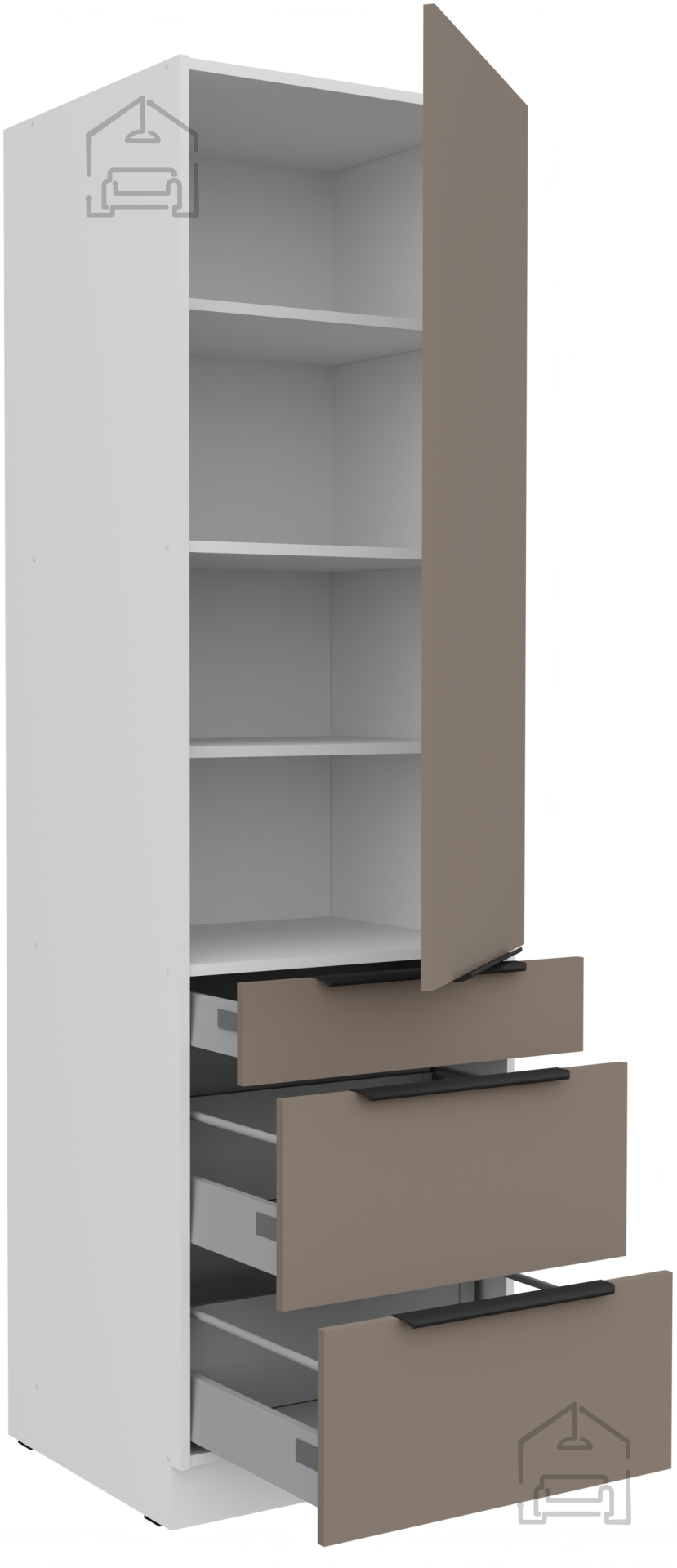 Die Farbkombination Sandgrau/Weiß (sandgrau und weiß) schafft einen hellen, luftigen Eindruck und verleiht gleichzeitig ein Gefühl von Wärme und Reinheit. Ein solches Design ermöglicht eine einfache Kombination mit verschiedenen Dekorarten, Bodenbelägen und Accessoires. Die weiße Farbe vergrößert den Raum optisch und vermittelt ein Gefühl von Ordnung, während sandgraue Töne einen modernen Hauch und Eleganz hinzufügen. Griffe Edge UA‑HEXA in schwarz‑aluminiumfarbener Ausführung sind minimalistisch, aber dennoch markant, da sie Ästhetik und Praktikabilität vereinen. Der Griffabstand beträgt 64 mm bis 320 mm, was eine komfortable Nutzung aller Türen und Schubladen ermöglicht.