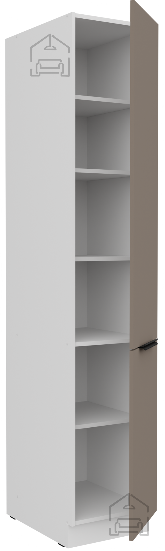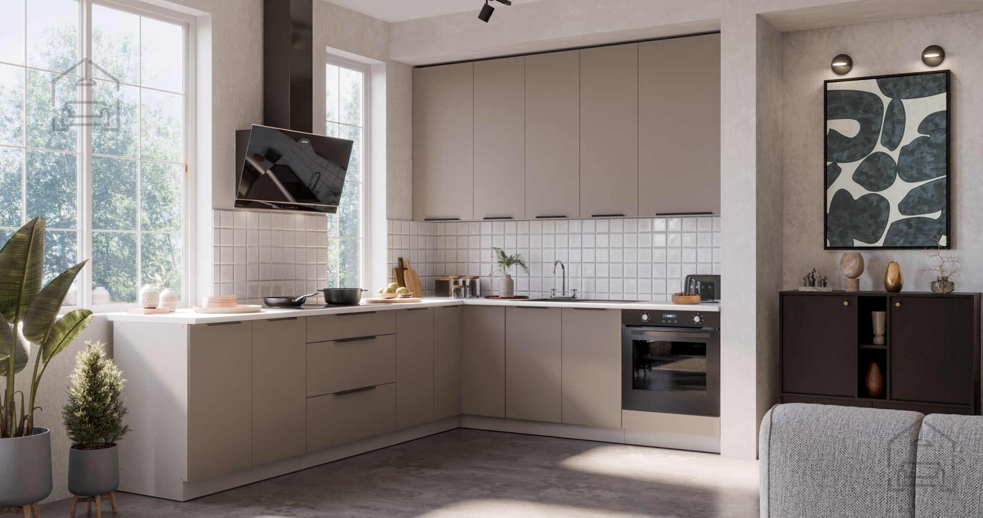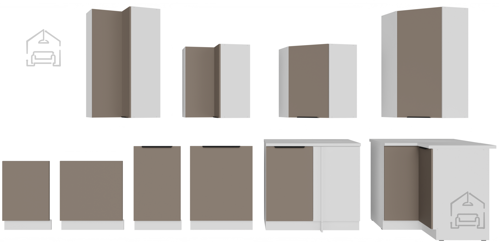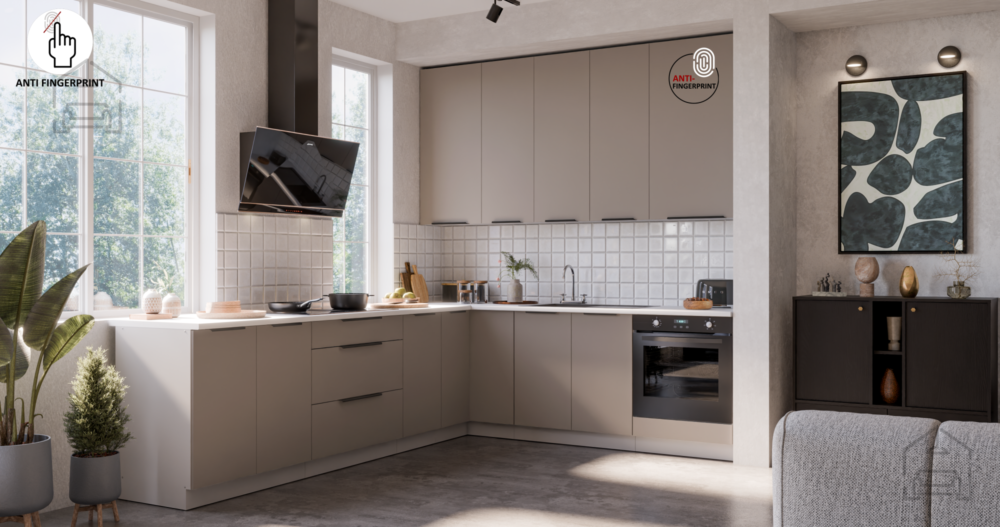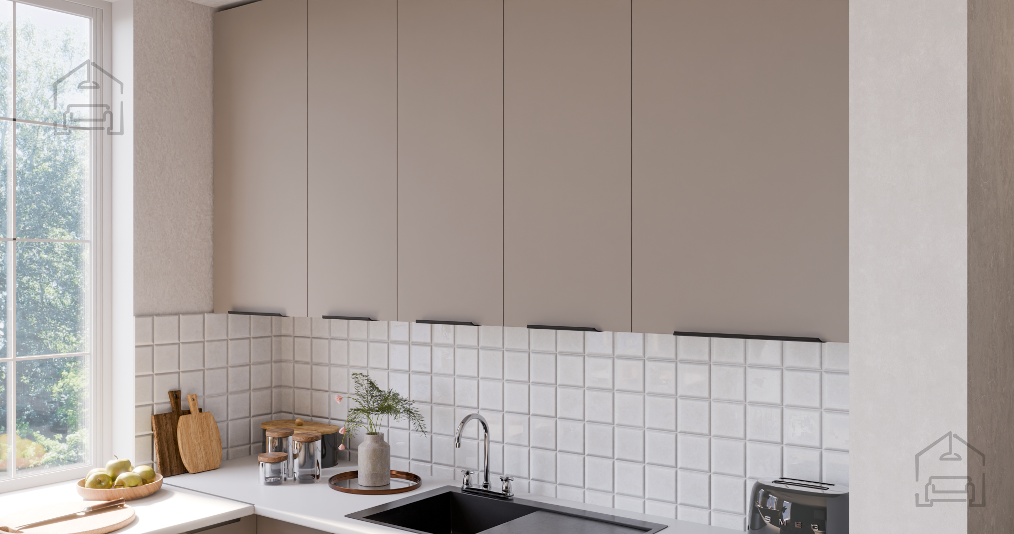 Die Farbkombination sandgrau/weiß (sandgrau und weiß) schafft einen hellen, luftigen Eindruck und vermittelt gleichzeitig ein Gefühl von Wärme und Reinheit. Ein solches Design ermöglicht eine einfache Kombination mit verschiedenen Arten von Dekor, Bodenbelägen und Accessoires. Die weiße Farbe vergrößert optisch den Raum und vermittelt Ordnung, während die sandgrauen Töne einen modernen Touch und Eleganz verleihen. Die Griffe edge UA‑HEXA in schwarz‑aluminiumfarbener Ausführung sind minimalistisch, aber markant, da sie Ästhetik und Praktikabilität vereinen. Der Griffabstand beträgt 64 mm bis 320 mm, was eine bequeme Nutzung aller Türen und Schubladen ermöglicht.