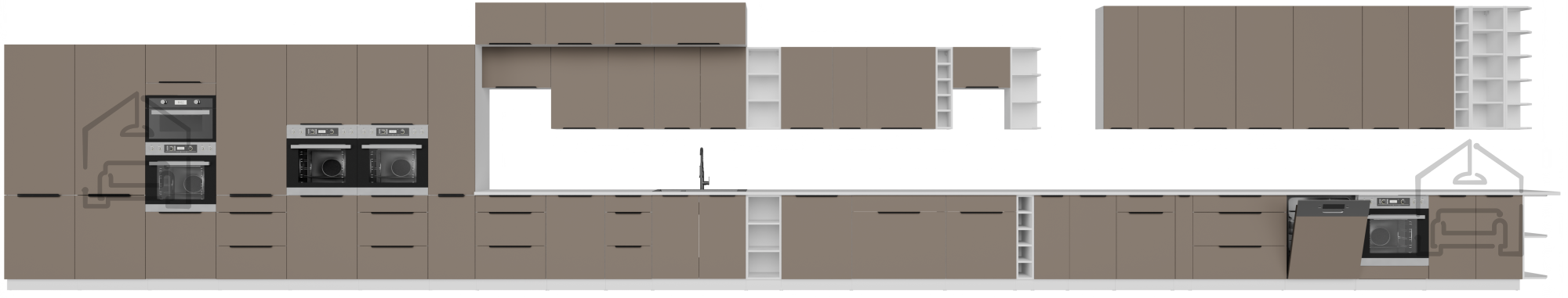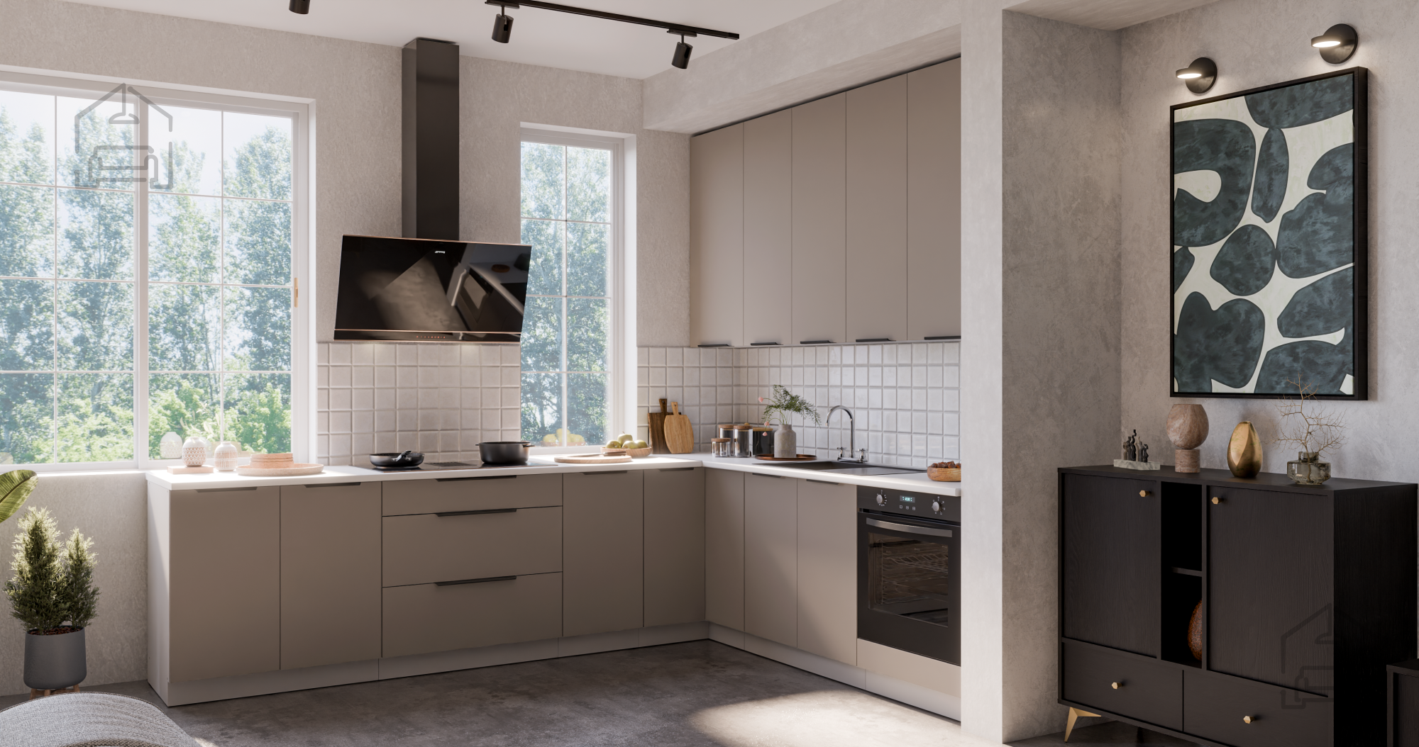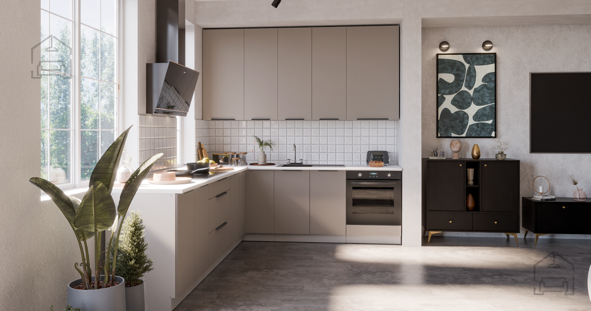 Die Küchenzeile Aria ermöglicht vielfältige gestalterische Kombinationen. Aufgrund der neutralen Farbgebung kann sie mit Holz-, Metall- oder Glaselementen ergänzt werden. In Kombination mit natürlichen Materialien wie hellem Holz oder Steinoberflächen schafft sie eine gemütliche Wohnatmosphäre. In modernen Interieurs harmoniert sie hervorragend mit matten Oberflächen und schwarzen Details. Aufgrund ihrer universellen Farbkombination eignet sie sich sowohl für klassische als auch moderne Küchenräume.