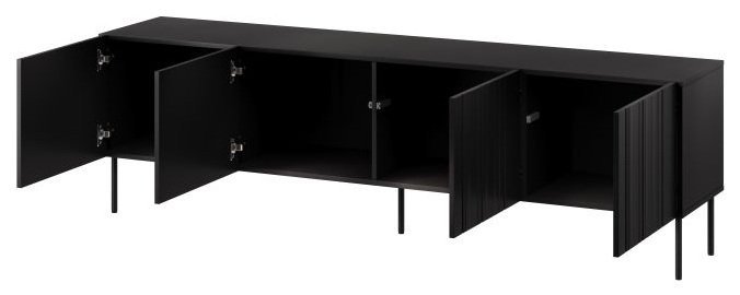 Die Innenaufteilung ermöglicht eine effiziente Aufbewahrung. Mit einer Länge von 200,5 cm und einer Höhe von 60 cm bietet die Kommode ausreichend Platz für größere Geräte wie Spielkonsolen, Verstärker oder zusätzliche Multimediaelemente. Die Tiefe von 40 cm ermöglicht eine stabile Aufstellung von Fernsehern verschiedener Größen, während die kompakte Form beibehalten wird, die sich schön an die Wand oder in die Mitte des Wohnraums einfügt.
