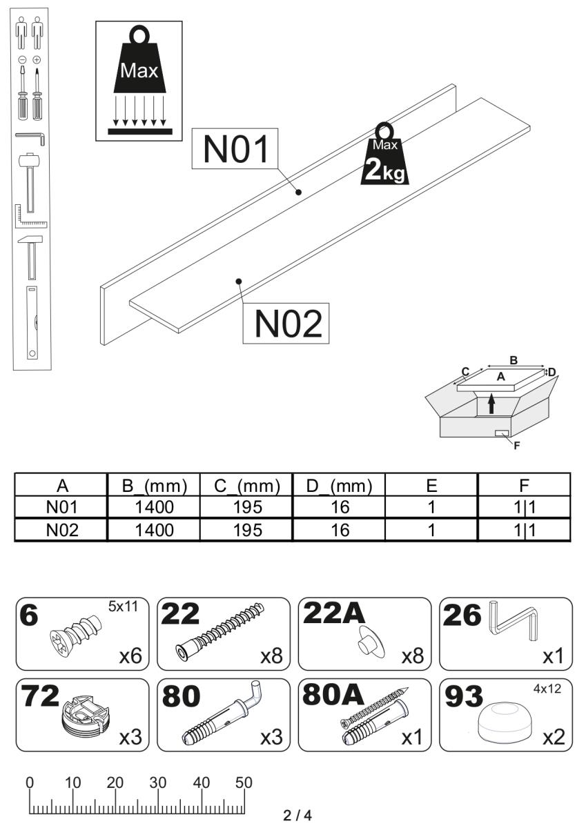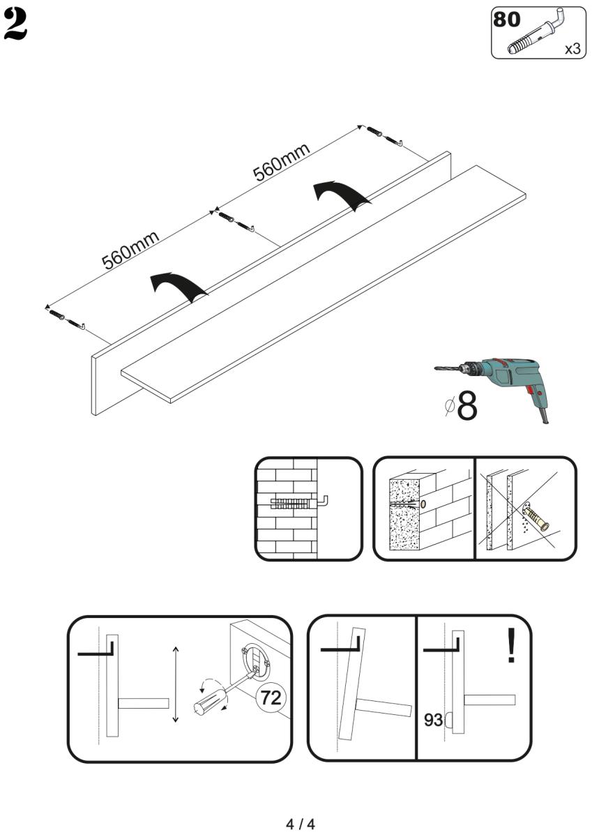 Diese Abmessungen ermöglichen, dass das Regal Justine nicht zu viel Platz einnimmt und gleichzeitig genügend Fläche zum Ablegen bietet. Aufgrund seiner Länge eignet es sich auch für längere Wände, wo es Leerräume füllt und ein ausgewogenes Erscheinungsbild des Raumes schafft. Die Montage ist einfach, da die grundlegenden Befestigungselemente für die Wandmontage beiliegen. Nach der Installation ist das Regal stabil und einsatzbereit.