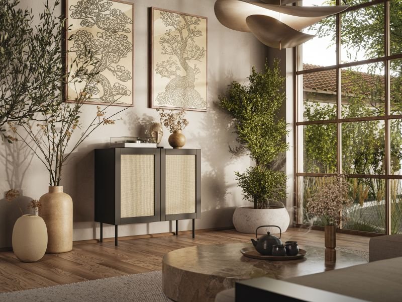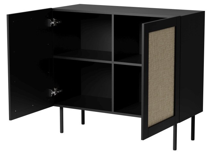 Die schwarze Oberfläche verleiht der Kommode Juta ein elegantes und universelles Erscheinungsbild. Eine solche Farbgestaltung ermöglicht eine einfache Kombination mit anderen Farbtönen und Materialien im Raum – von warmen Holztönen bis zu kühlen Metalldetails. Die schwarze Farbe sorgt für ein Gefühl von Ordnung und optischer Tiefe, sodass die Kommode gut mit matten wie auch mit hochglänzenden Oberflächen harmoniert.