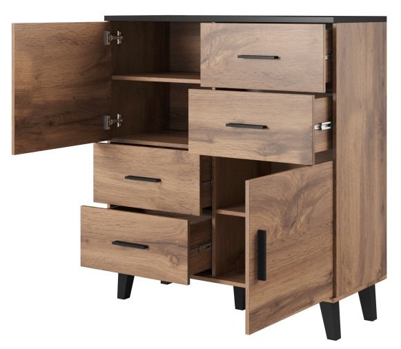 Die Kommode Lotta 110 cm 2D4S – Halmar vereint Funktionalität, ansprechendes Design und solide Verarbeitung. Die Kombination aus warmem Eichenholz und modernem Schwarz schafft einen angenehmen Kontrast, der sich besonders gut in minimalistische oder skandinavische Einrichtungen einfügt. Durch die durchdachte Fußhöhe und die robusten Materialien ist dieses Möbelstück alltagstauglich, aber zugleich elegant genug, um den Raum stilvoll zu ergänzen. Wenn Sie eine Kommode suchen, die Beständigkeit, Stauraum und zeitloses Design verbindet, ist das Modell Lotta 110 cm 2D4S von Moebelundmoebel.at eine hervorragende Wahl für Ihr Zuhause.