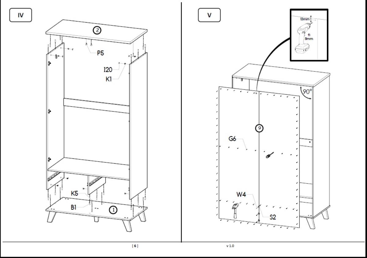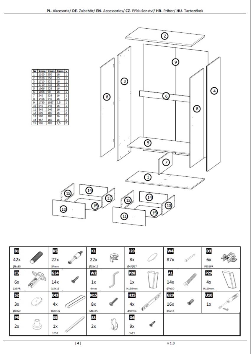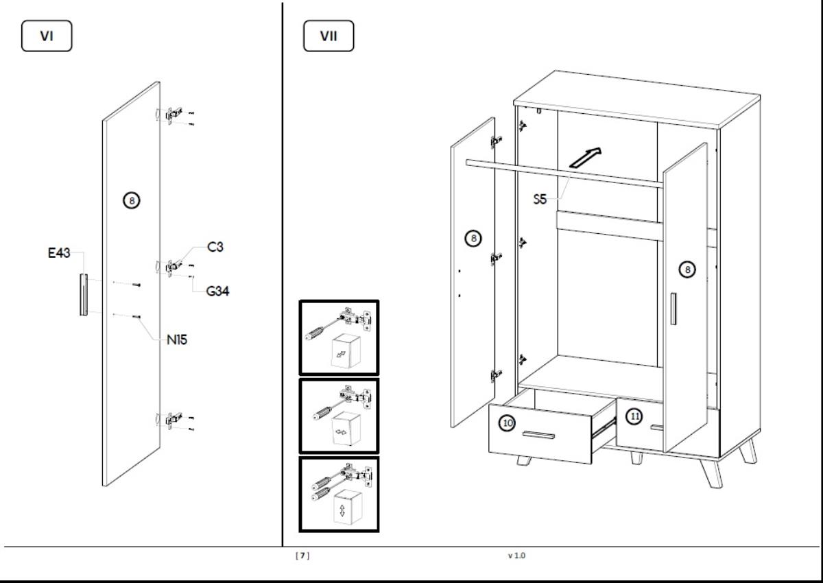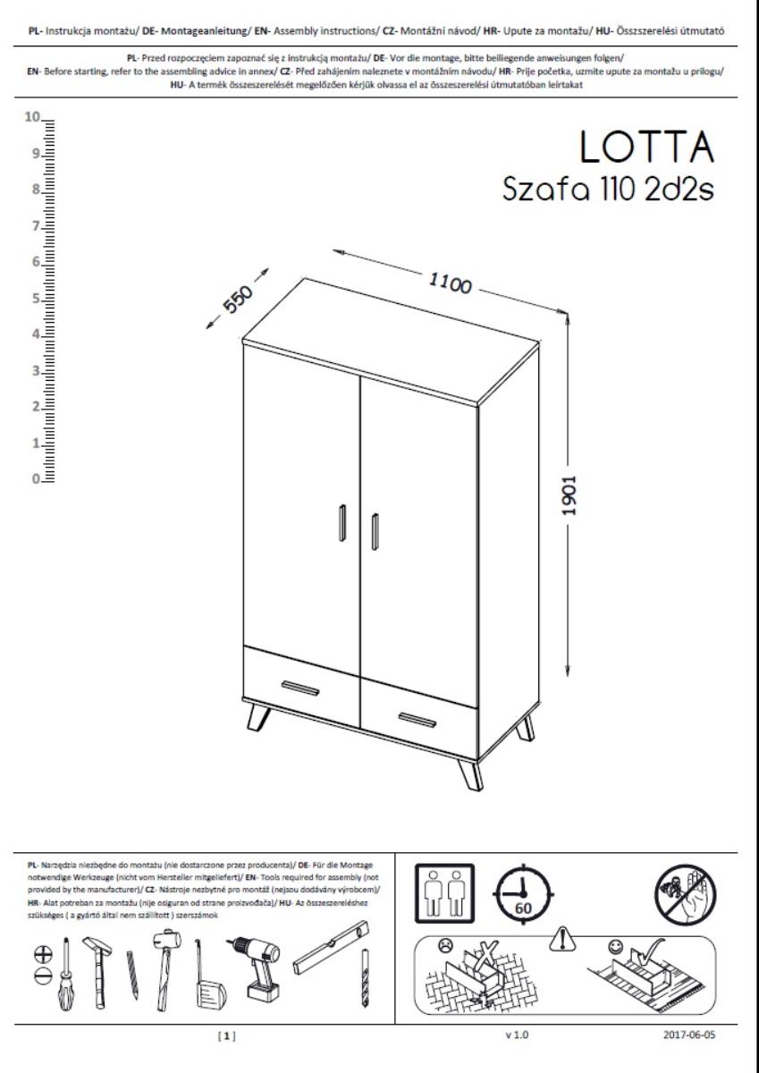 Die Gesamtabmessungen des Schranks betragen 110 × 55 × 190 cm (Breite × Tiefe × Höhe). Die Höhe der Beine beträgt 15 cm, was eine einfache Reinigung des Bodens unter dem Schrank ermöglicht und dem Raum ein luftiges Erscheinungsbild verleiht. Zwei Türen und zwei praktische Schubladen ermöglichen eine übersichtliche Aufbewahrung von Kleidung, Accessoires und anderen persönlichen Gegenständen. Aufgrund seiner Höhe bietet der Schrank auch ausreichend Platz für Kleiderbügel, Regale oder Boxen für saisonale Kleidung.