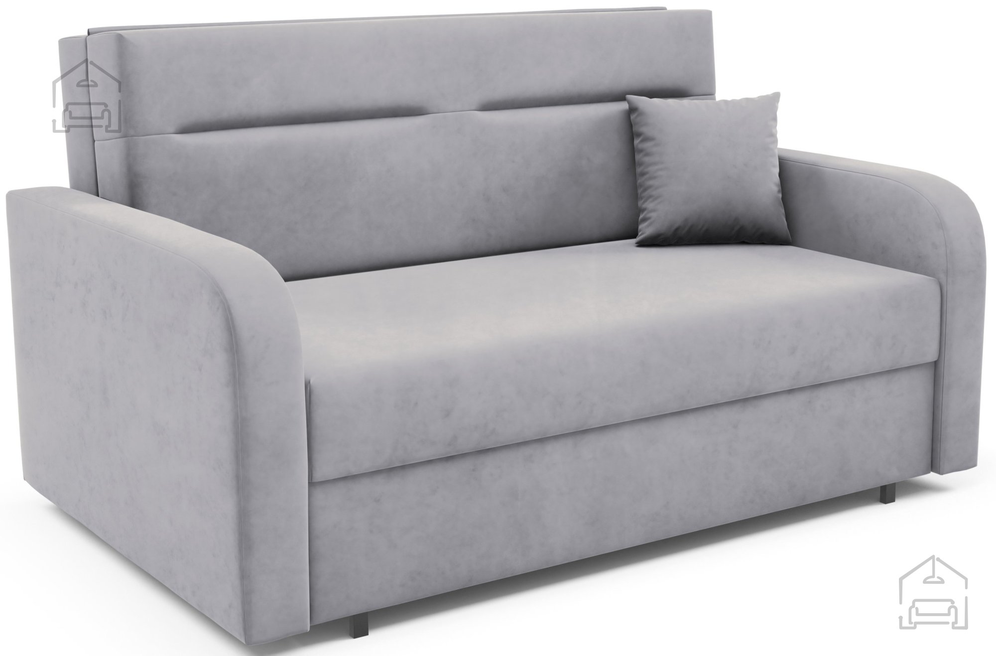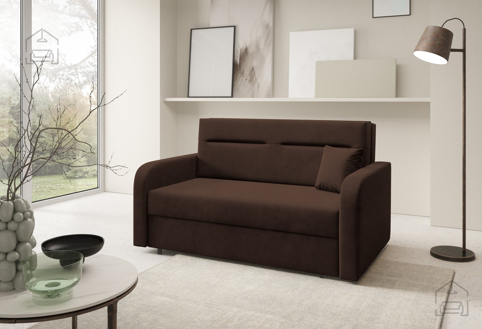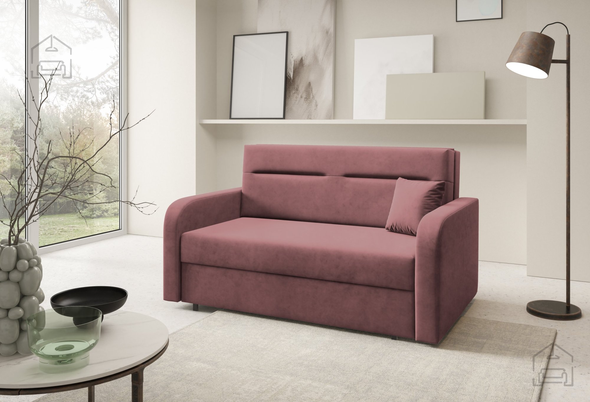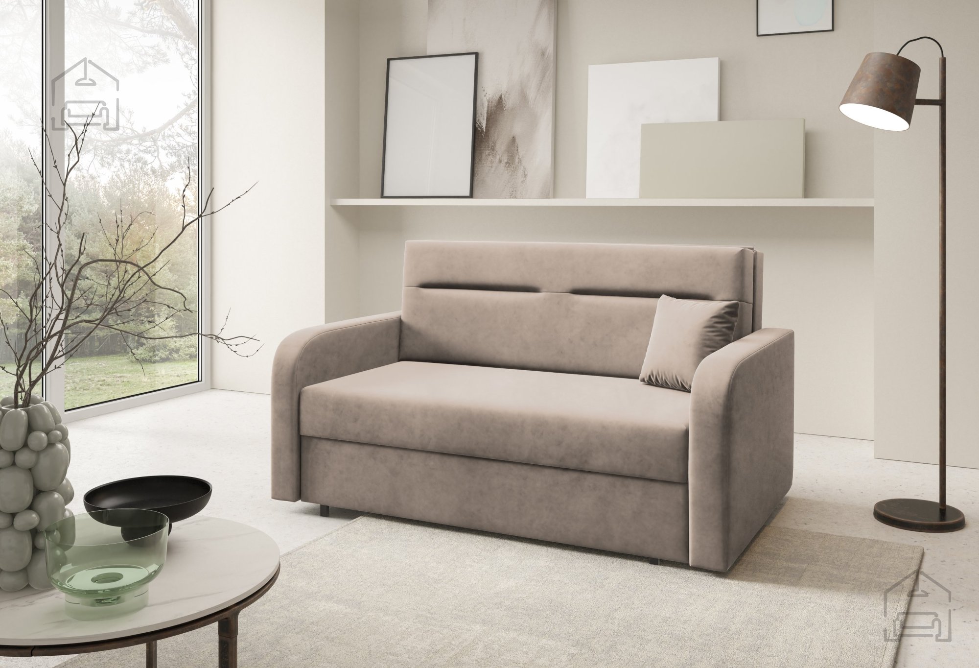 Auf dem Foto ist der Zweisitzer im Stoff Kronos 46 dargestellt, der in Aussehen und Haptik an Samt erinnert und dem Raum eine angenehme Wärme verleiht. Das Modell ist in mehreren Farbvarianten erhältlich, sodass es sich leicht an die bestehende Inneneinrichtung anpassen lässt. Aufgrund seiner kompakten Größe und seines neutralen Designs passt es sowohl in Kinder- als auch in Jugendzimmer, kleinere Wohnzimmer oder Ferienhäuser.