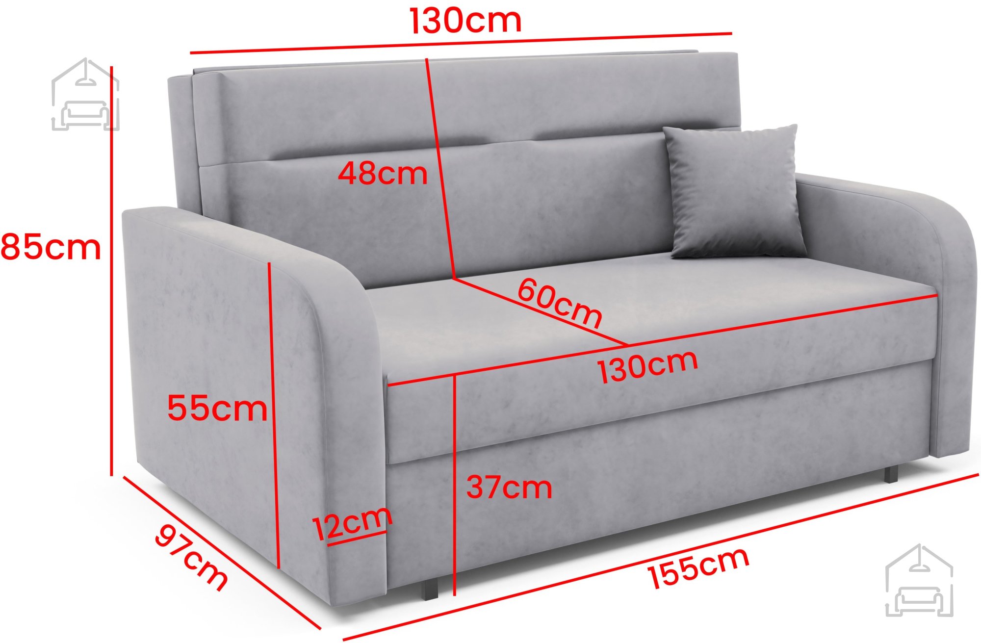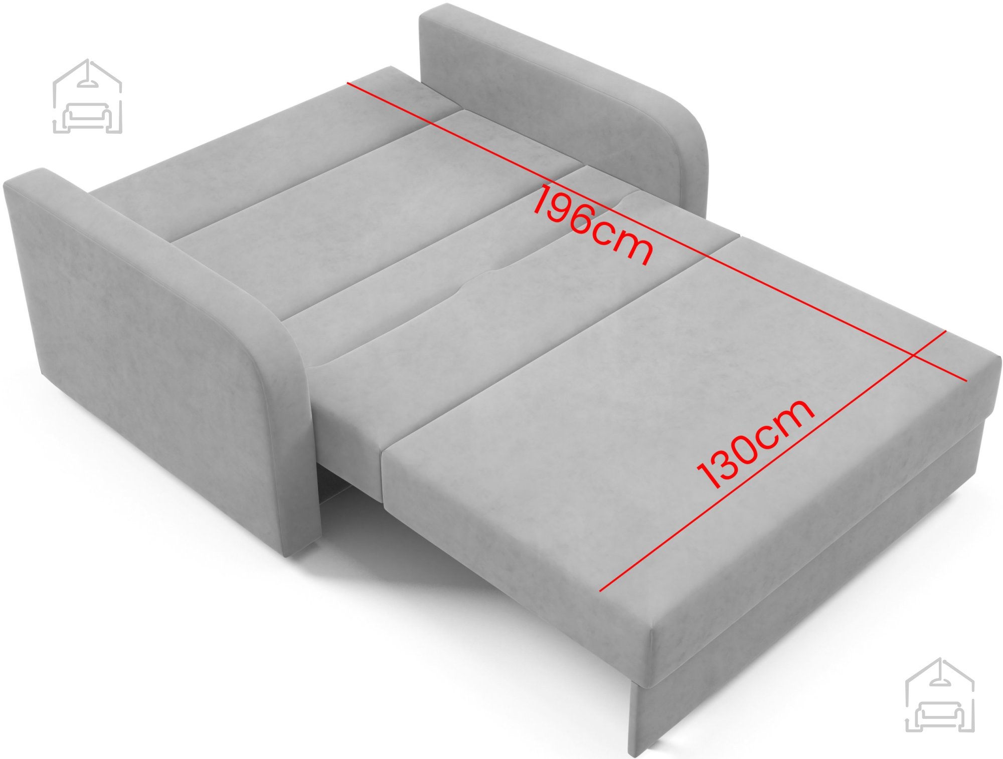 Die Liegefläche misst 130x196 cm und bietet ausreichend Platz für einen Erwachsenen oder zwei Kinder. Der Zweisitzer ist für den täglichen Gebrauch konzipiert, da seine Konstruktion stabil und robust ist. Der Rahmen besteht aus Holz, was eine lange Haltbarkeit gewährleistet, während das Innere mit hochwertigem Schaumstoff gepolstert ist, der ein weiches, aber dennoch stützendes Sitzen bietet. Die maximale Belastbarkeit beträgt 125 kg, was die Zuverlässigkeit des Produkts zusätzlich bestätigt.
