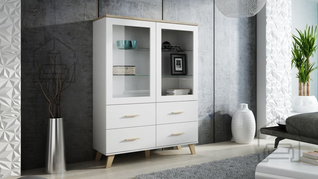 Der Korpus der Vitrine besteht aus 16 mm matter Spanplatte, ebenso die Fronten der Türen und Schubladen. Dieses Material gewährleistet Festigkeit, Stabilität und eine lange Lebensdauer der Möbel. Die obere Platte ist etwas dicker, misst 22 mm und betont zusätzlich die Robustheit und das ausgewogene Design des gesamten Stücks. Beine und Griffe bestehen aus lackiertem Holz in einem warmen Farbton von Sonoma-Eiche matt, was das helle weiße Gehäuse ergänzt und der Vitrine einen Hauch von Natürlichkeit verleiht.