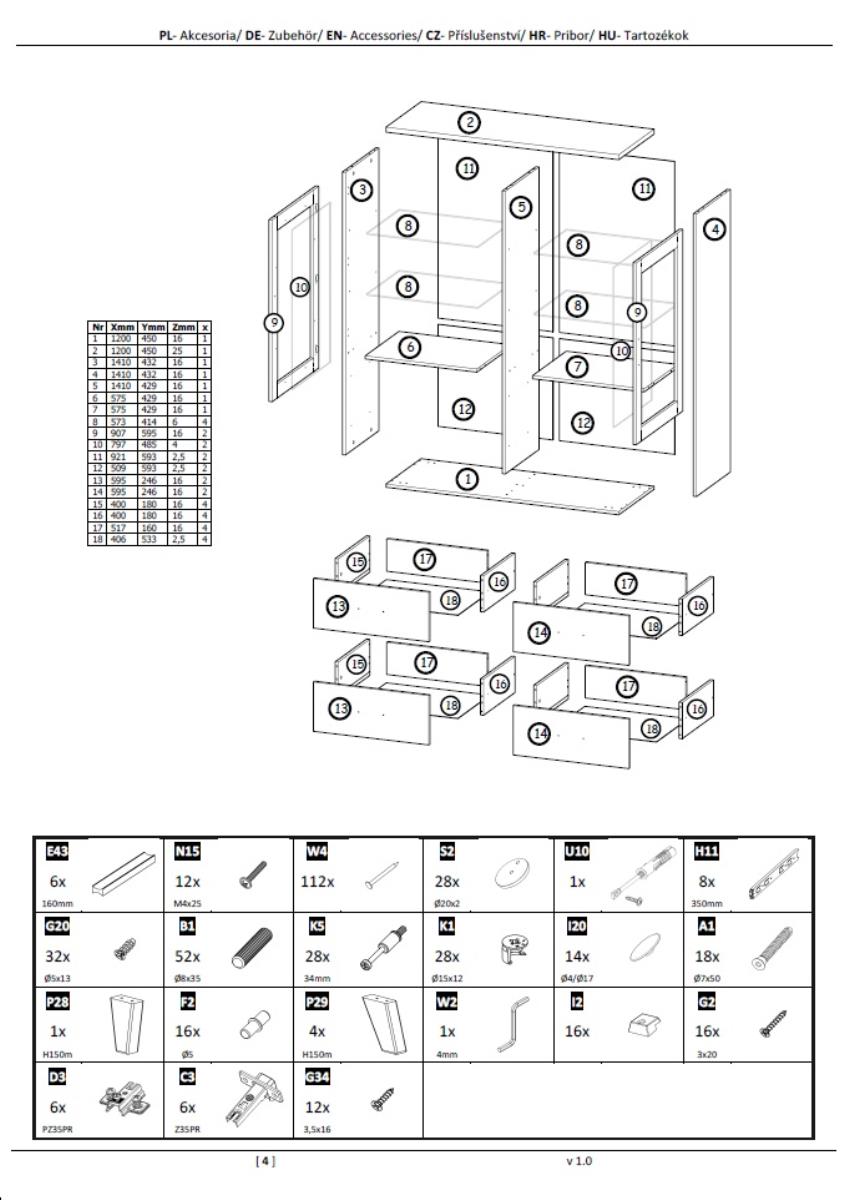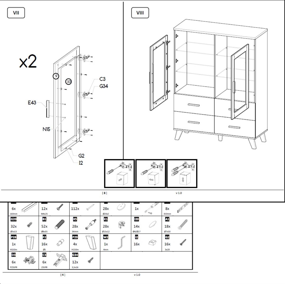 Die Gesamtabmessungen der Vitrine betragen 120 × 45 × 160 cm (Breite × Tiefe × Höhe), was bedeutet, dass sie viel Stauraum bietet und gleichzeitig nicht zu viel Platz im Wohnzimmer, Esszimmer oder Flur einnimmt. Die Innenaufteilung umfasst eine Kombination aus zwei Türen (2D) und vier Schubladen (4S), was eine organisierte Aufbewahrung verschiedener Gegenstände ermöglicht – von Geschirr und Glas über dekorative Accessoires bis hin zu Dokumenten.