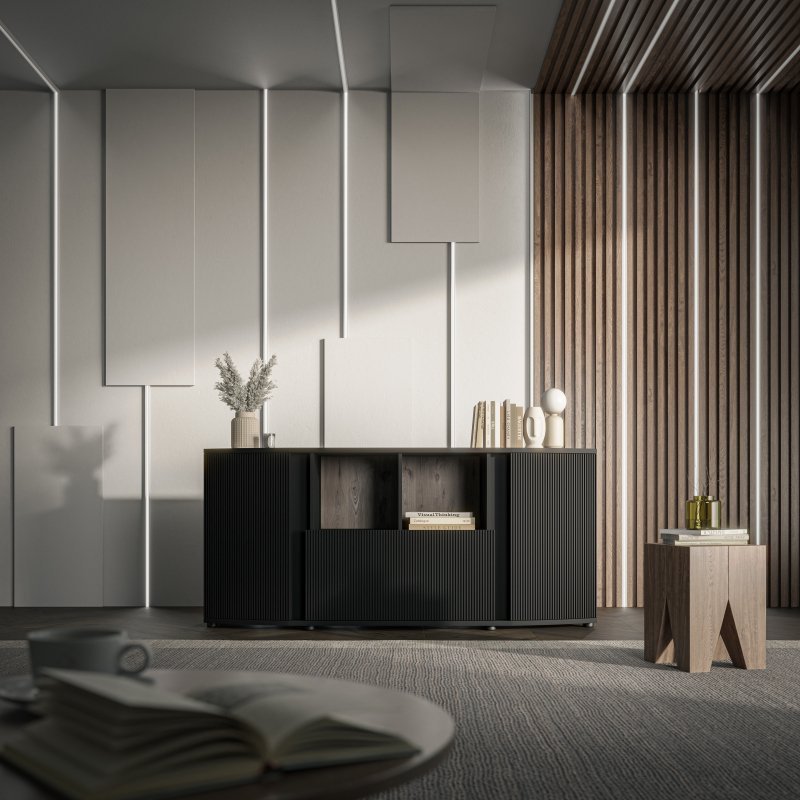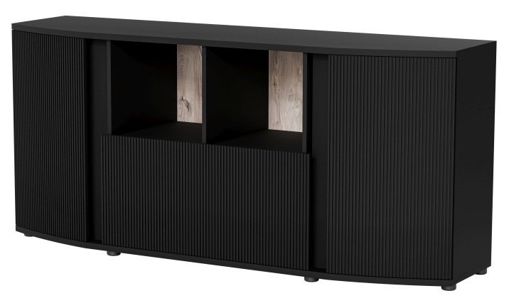 Der Korpus der Kommode besteht aus einer laminierten Spanplatte mit einer Stärke von 16 mm, was Stabilität und Widerstandsfähigkeit gegen täglichen Gebrauch gewährleistet. Die Fronten aus laminierter MDF-Platte messen ebenfalls 16 mm und sind zusätzlich mit sichtbaren Nuten gestaltet, die eine subtile Textur und visuelle Tiefe erzeugen. Diese Materialkombination sorgt dafür, dass die Oberfläche leicht zu reinigen und gleichzeitig angenehm zu berühren ist. Laminierte Platten behalten ihre Farbbeständigkeit, was bedeutet, dass die Kommode auch nach Jahren der Nutzung wie neu aussieht.