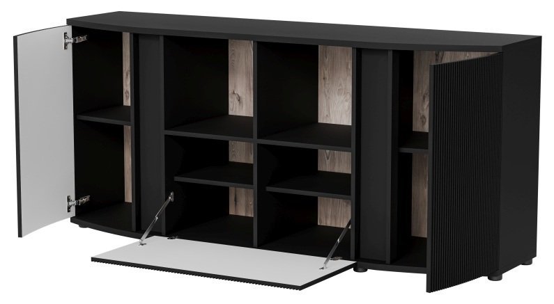 Eines der Hauptmerkmale des Modells Michelle ist das Fehlen von Griffen. Die grifflos ausgeführte Konstruktion betont klare Linien und einen minimalistischen Gestaltungsansatz. Das Öffnen erfolgt durch ein sanftes Ziehen entlang der Kanten der Fronten, was zu einem einheitlichen, fast monolithischen Erscheinungsbild beiträgt. Ein solches Design passt hervorragend zu modernen Innenräumen, in denen glatte Flächen, einfache Formen und eine ausgewogene Farbpalette dominieren. Schwarz und Eiche Viking erzeugen zusammen ein Gefühl von Raffinesse und bewahren gleichzeitig die Wärme eines häuslichen Ambientes.