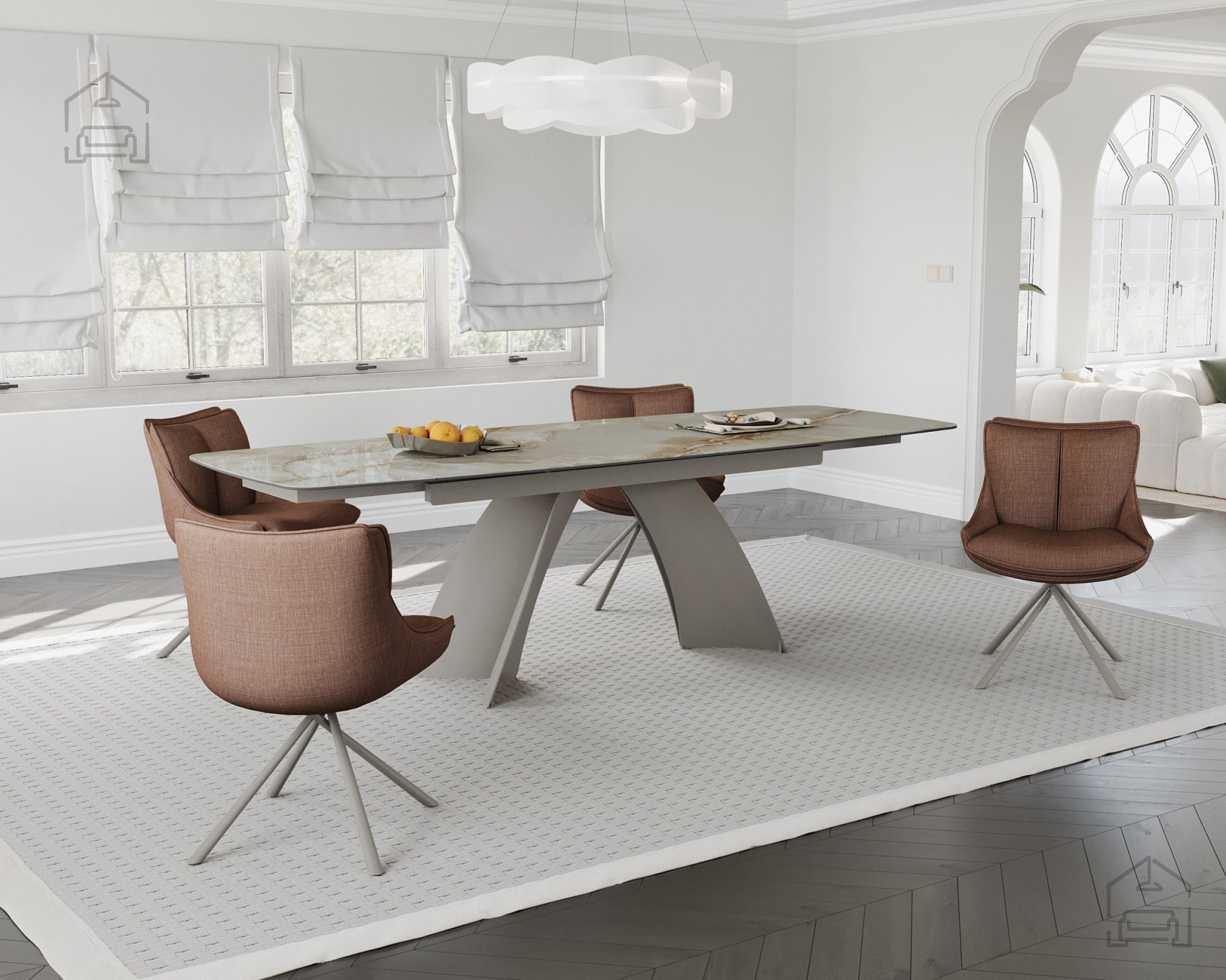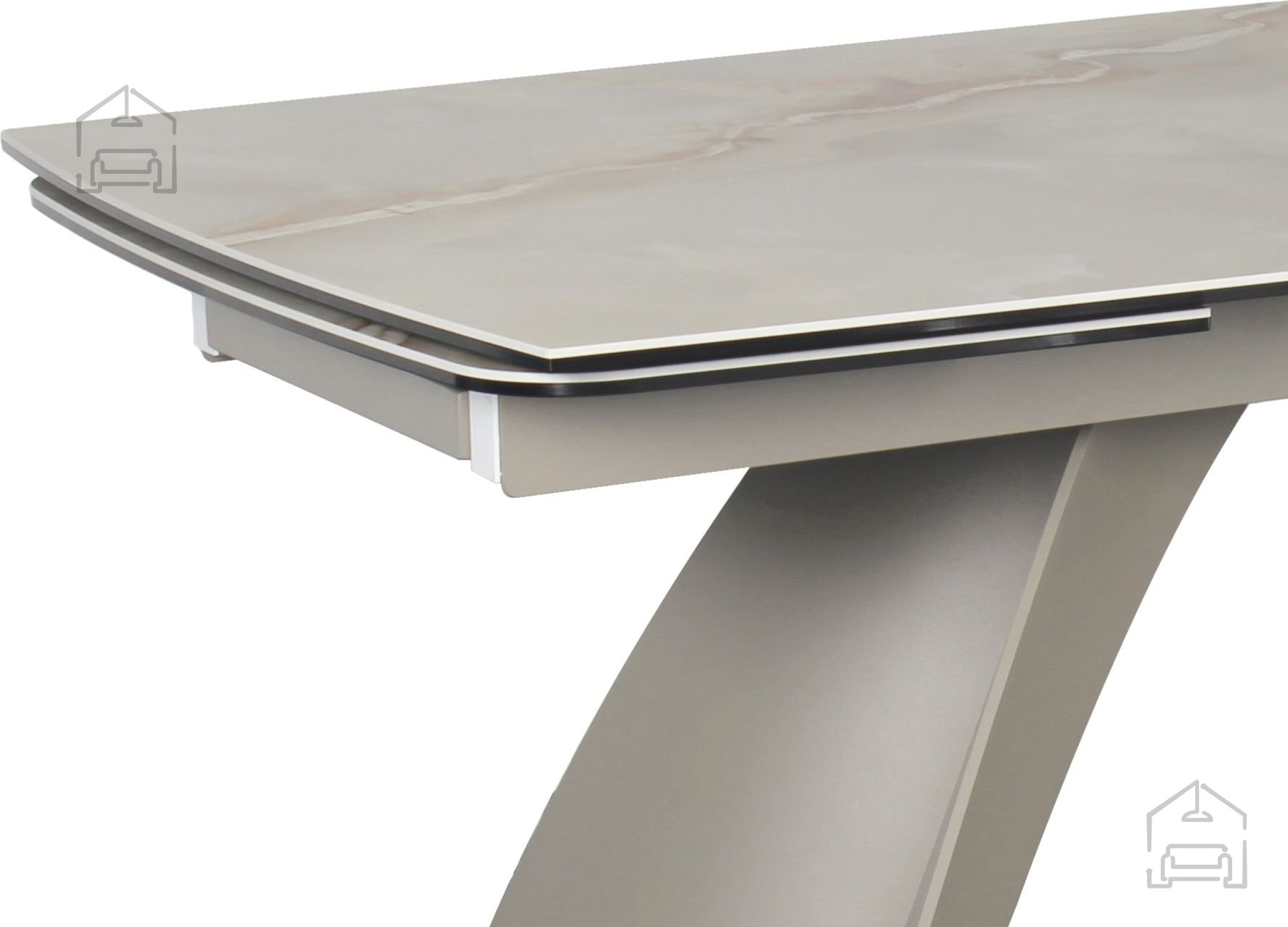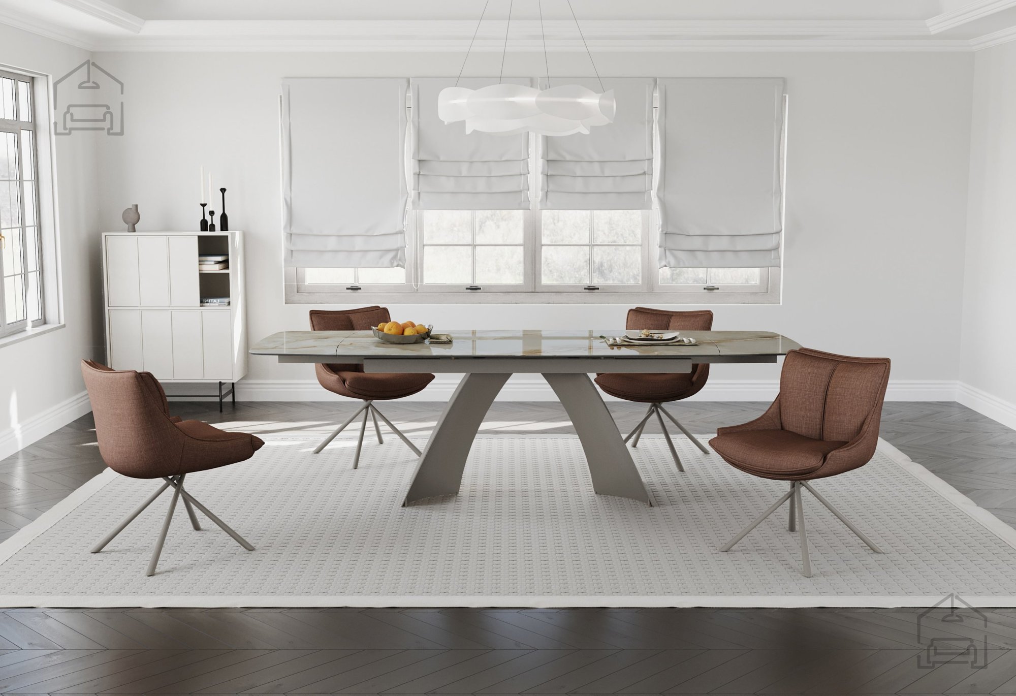 Die Tischplatte besteht aus einer Kombination von Keramik und gehärtetem Glas, was eine langlebige, elegante und pflegeleichte Oberfläche schafft. Die obere Schicht aus Keramik mit brauner Marmoroptik vermittelt das Gefühl von natürlichem Stein mit reicher Textur und Tiefe, während die untere Glasschicht Stabilität und zusätzliche Stoßfestigkeit gewährleistet. Diese hybride Konstruktion reduziert die thermische Ausdehnung, erhält die Maßstabilität und ermöglicht eine einfache Reinigung der Oberfläche. Die Farbkombination aus braunem Marmor und neutralem grauen Untergestell schafft ein ausgewogenes und modernes Erscheinungsbild, das für verschiedene Einrichtungsstile geeignet ist – von minimalistisch bis industriell.
