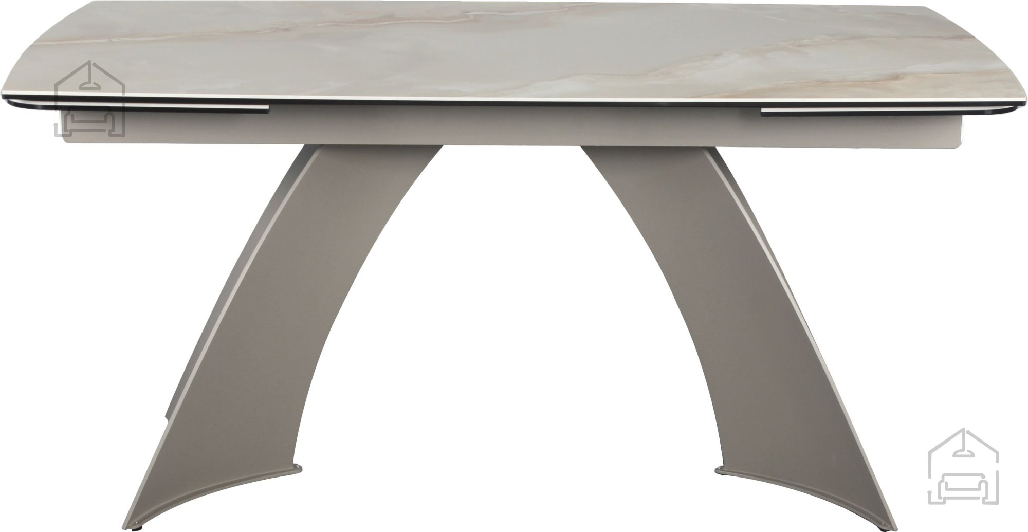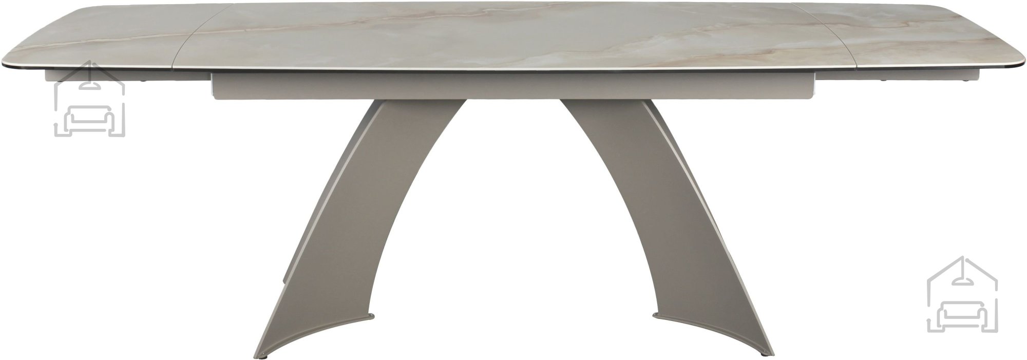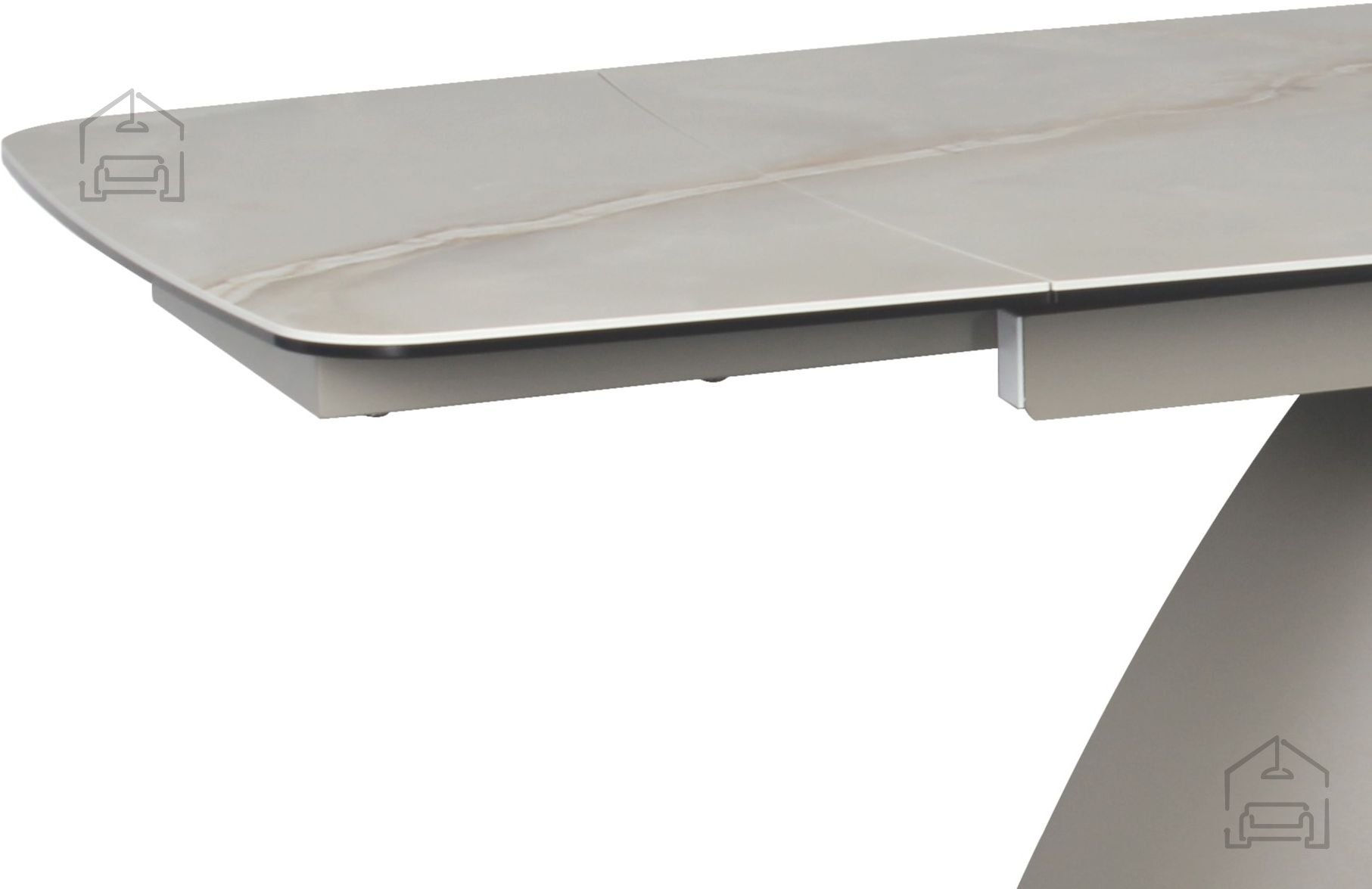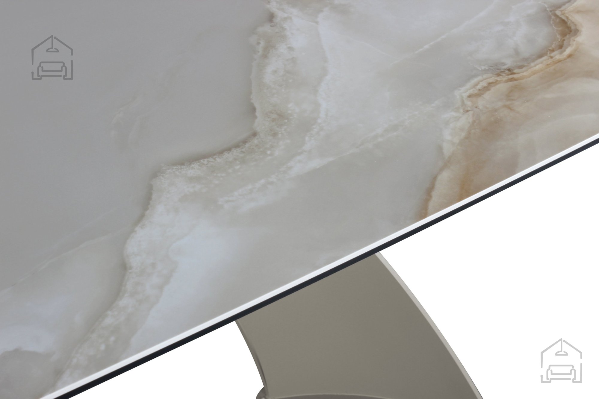 Die Tischplatte besteht aus einer Kombination von Keramik und gehärtetem Glas, was eine langlebige, elegante und pflegeleichte Oberfläche schafft. Die obere Schicht aus Keramik mit brauner Marmoroptik vermittelt das Gefühl von natürlichem Stein mit reicher Textur und Tiefe, während die untere Glasschicht Stabilität und zusätzliche Stoßfestigkeit gewährleistet. Diese hybride Konstruktion reduziert die thermische Ausdehnung, erhält die Maßstabilität und ermöglicht eine einfache Reinigung der Oberfläche. Die Farbkombination aus braunem Marmor und neutralem grauen Untergestell schafft ein ausgewogenes und modernes Erscheinungsbild, das für verschiedene Einrichtungsstile geeignet ist – von minimalistisch bis industriell.