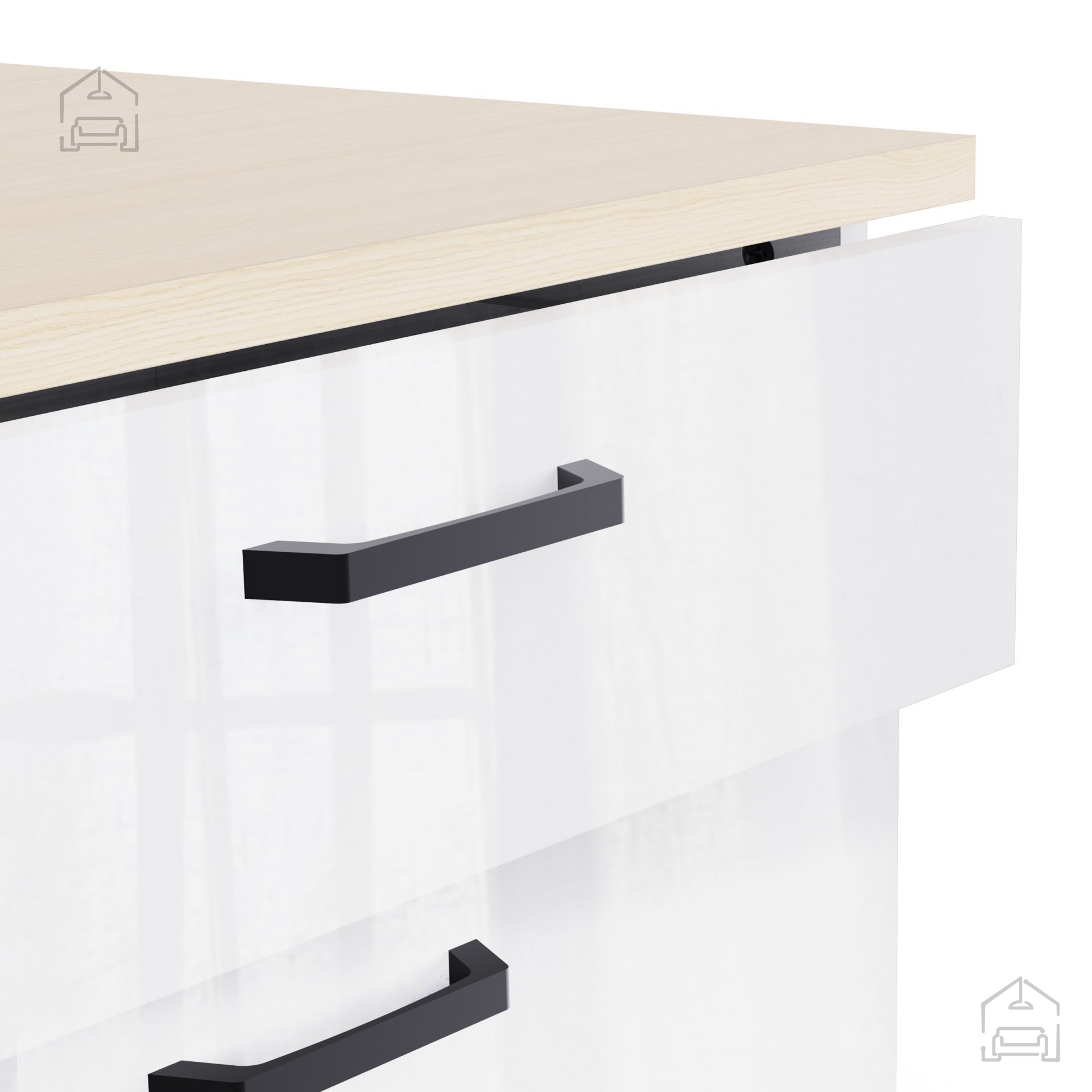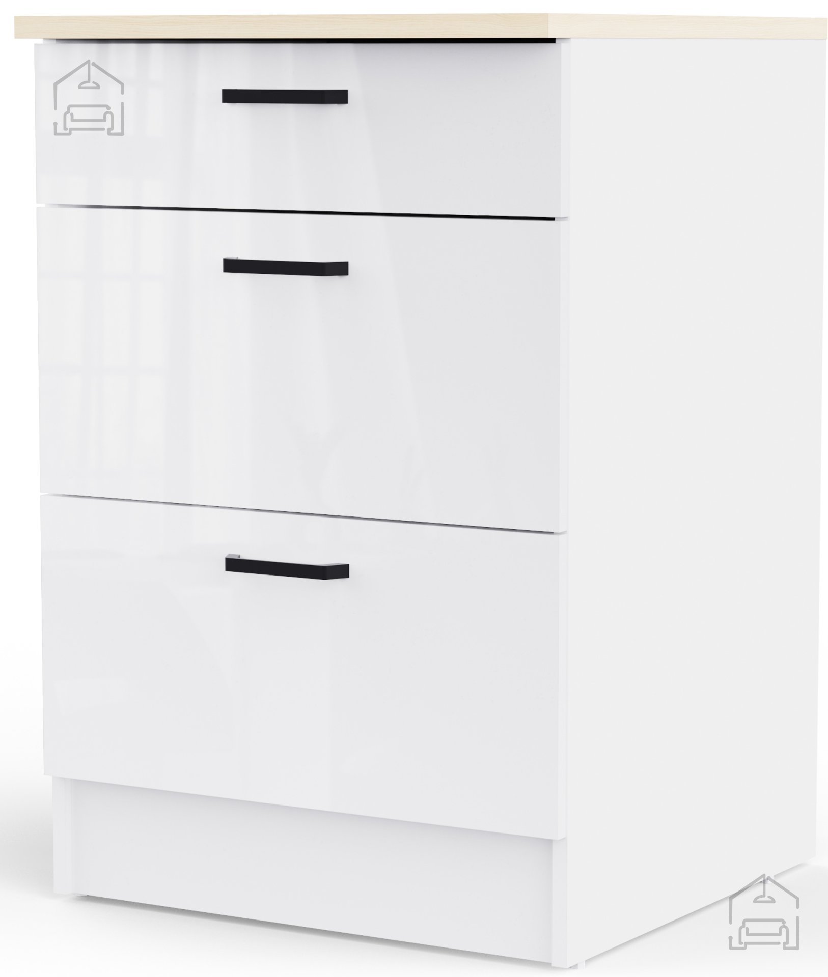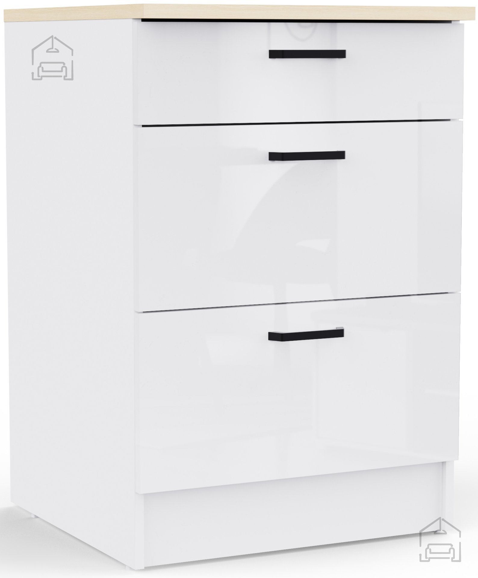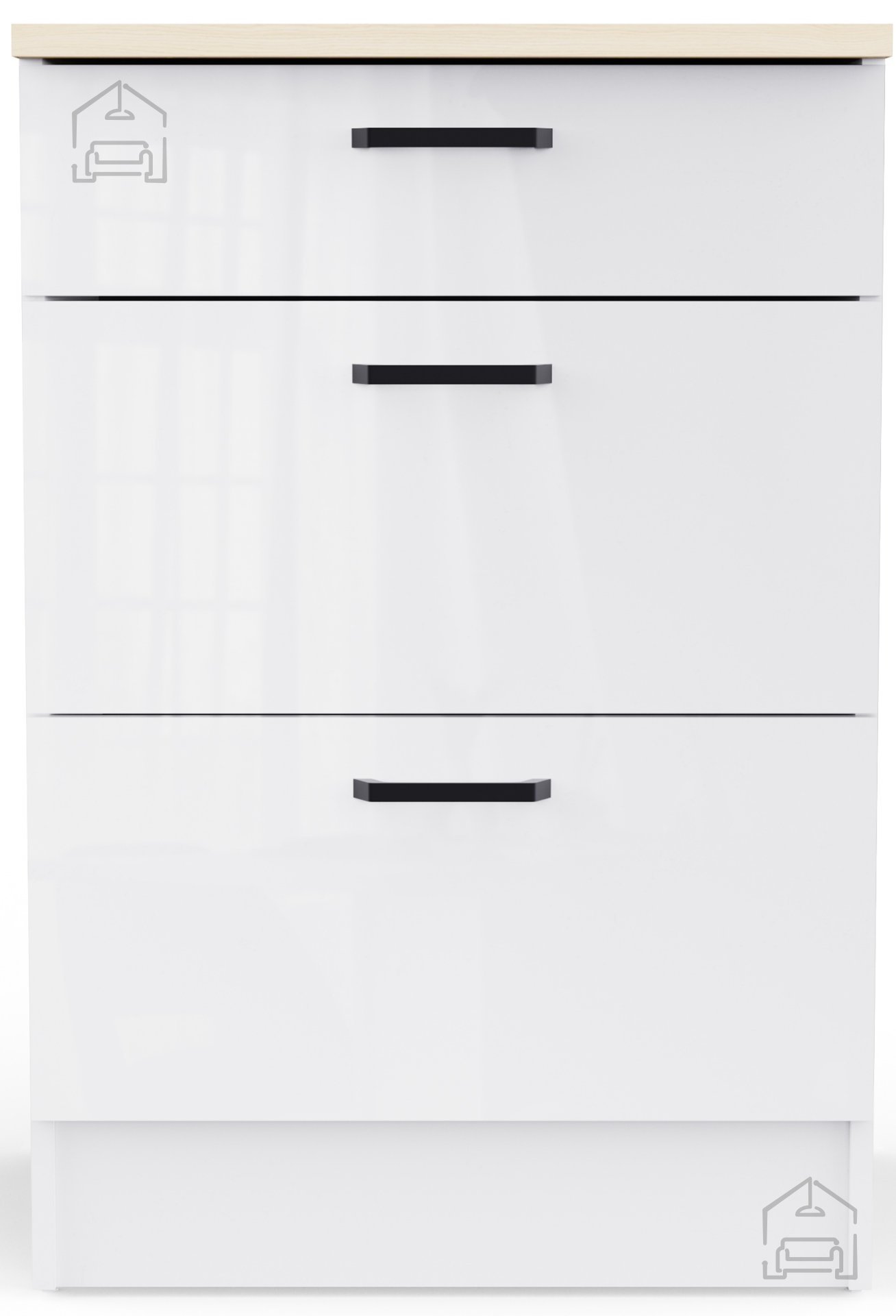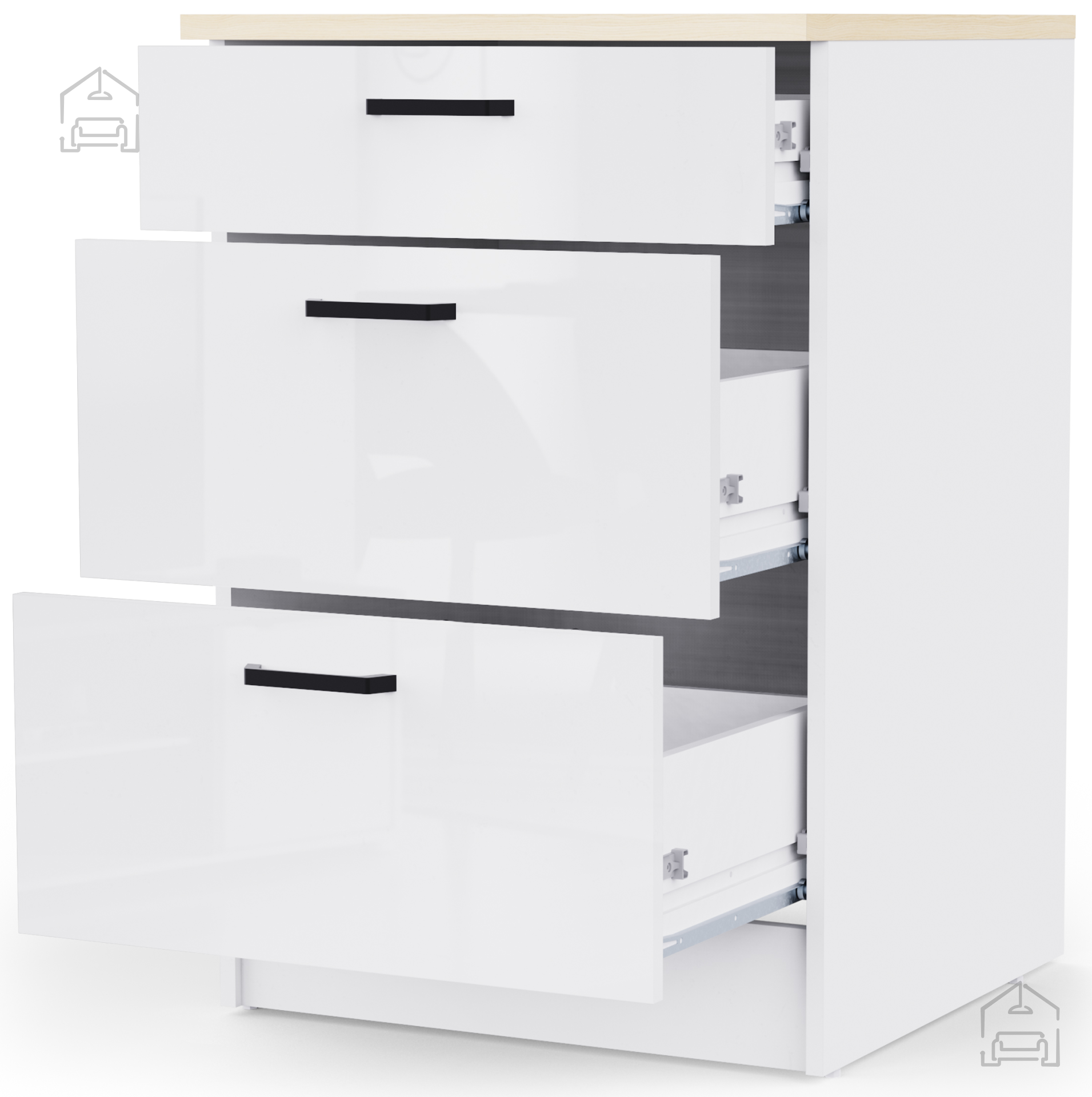 Der Unterschrank Bianco 3 verfügt über drei großzügige Schubladen in zwei unterschiedlichen Größen, die ein übersichtliches Verstauen verschiedener Küchenutensilien ermöglichen. Zwei größere Schubladen mit den Maßen 52x39 cm und einer Höhe von 14,6 cm eignen sich ideal für Töpfe, Pfannen oder anderes Kochgeschirr. Die obere, flachere Schublade mit einer Höhe von 6,6 cm ist perfekt für Besteck, Kochlöffel oder kleinere Küchenhelfer, die man gerne griffbereit hat. Diese Aufteilung sorgt für Ordnung und erleichtert den schnellen Zugriff auf den Inhalt.