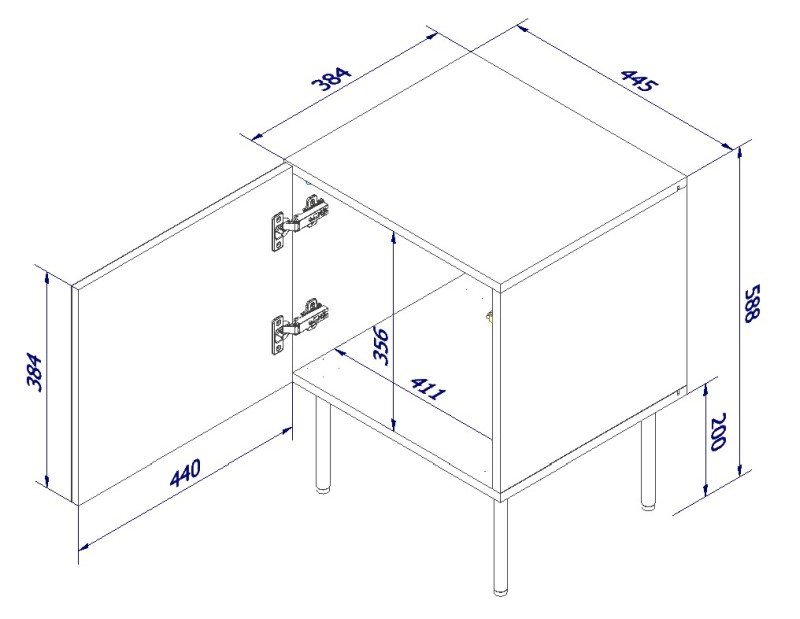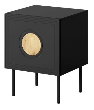 Das Gehäuse aus 16 mm starker laminierter Platte ist robust und widerstandsfähig gegen tägliche Beanspruchung, während die MDF-Front für eine glatte Oberfläche und einen eleganten Look sorgt. Die matte Beschichtung reduziert sichtbare Fingerabdrücke und Staub, was die Pflege erleichtert. Schwarze Metallbeine runden das Gesamtbild harmonisch ab, verleihen Leichtigkeit und zusätzliche Stabilität. Das PUSH-CLICK-System ermöglicht ein sanftes Öffnen und Schließen der Türen ohne Griffe – einfach durch leichtes Drücken auf die Front.