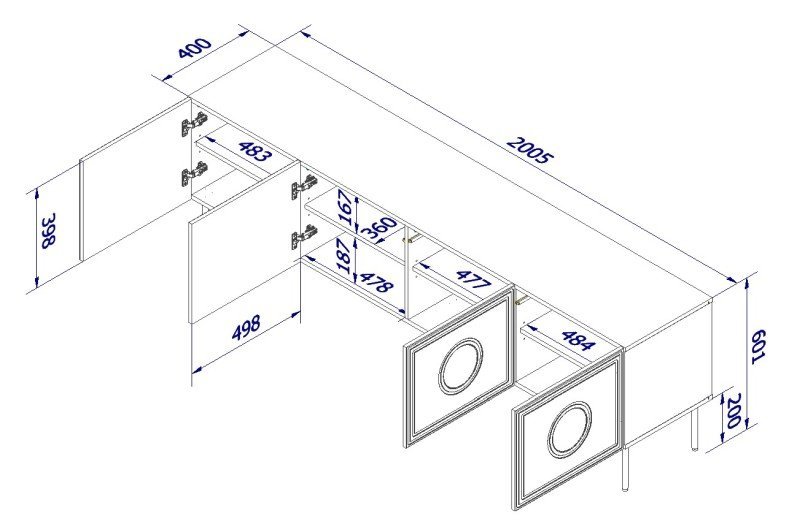 Mit ihrer Länge von 200 cm bietet die Kommode ausreichend Platz für Fernseher mit größerer Bildschirmdiagonale, während darunter Raum für zusätzliche Geräte oder Deko‑Elemente bleibt. Die Tiefe von 42 cm sorgt für Stabilität und ein ausgewogenes Verhältnis zwischen Geräumigkeit und Kompaktheit – ideal auch für kleinere Wohnzimmer. Durch die Höhe von 60 cm ergibt sich ein angenehmer Blickwinkel vom Sofa aus.