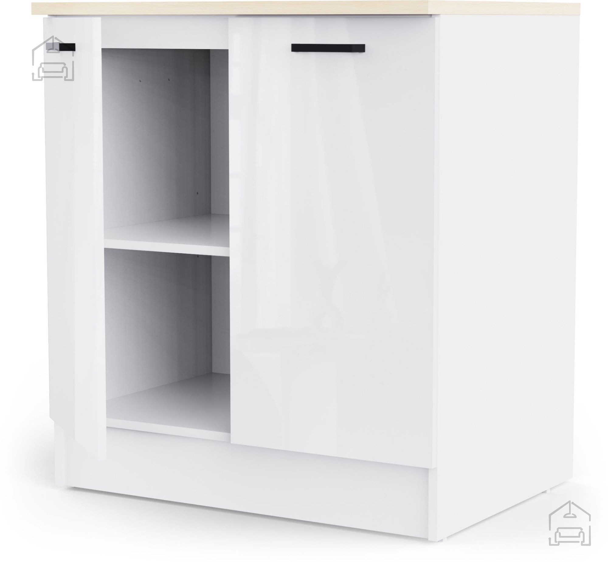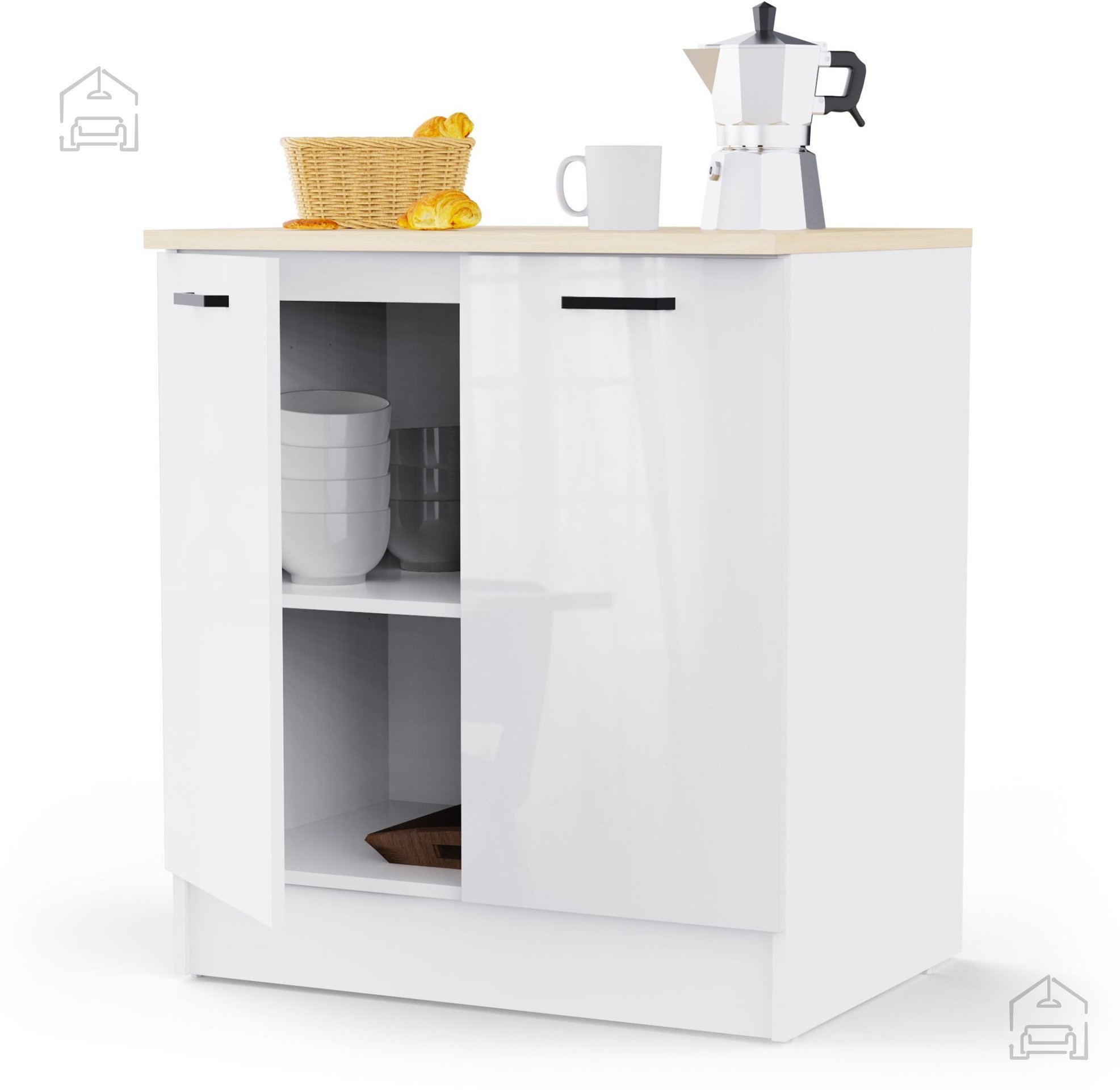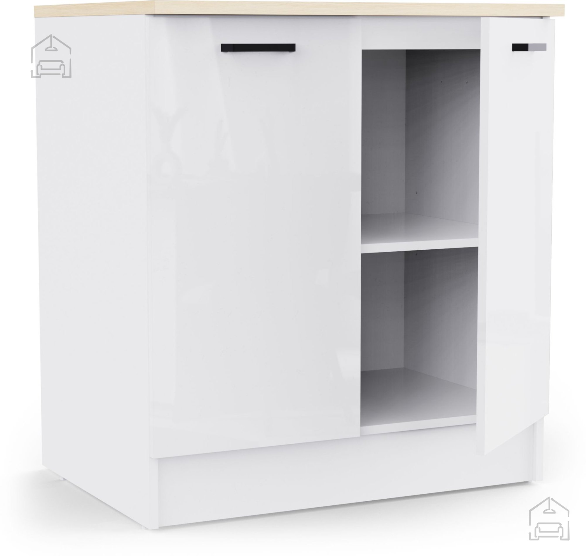 Der Korpus besteht aus 16 mm starker Spanplatte, was für Stabilität und Langlebigkeit sorgt. Die 22 mm starke Arbeitsplatte in Eichenoptik ergänzt mit ihrem warmen Holzton die glänzenden weißen Fronten perfekt. Die Oberfläche ist robust genug für den täglichen Gebrauch – sei es zur Essensvorbereitung oder zum Abstellen kleiner Küchengeräte. Der Schrank kann einzeln genutzt oder als Teil einer größeren Küchenkombination eingesetzt werden.