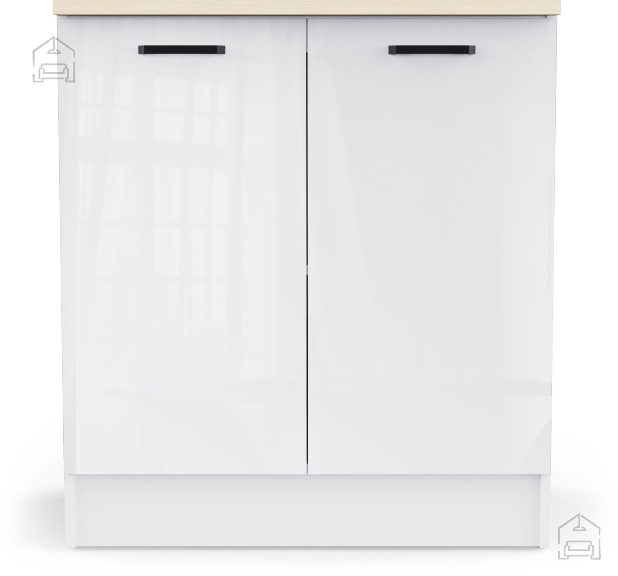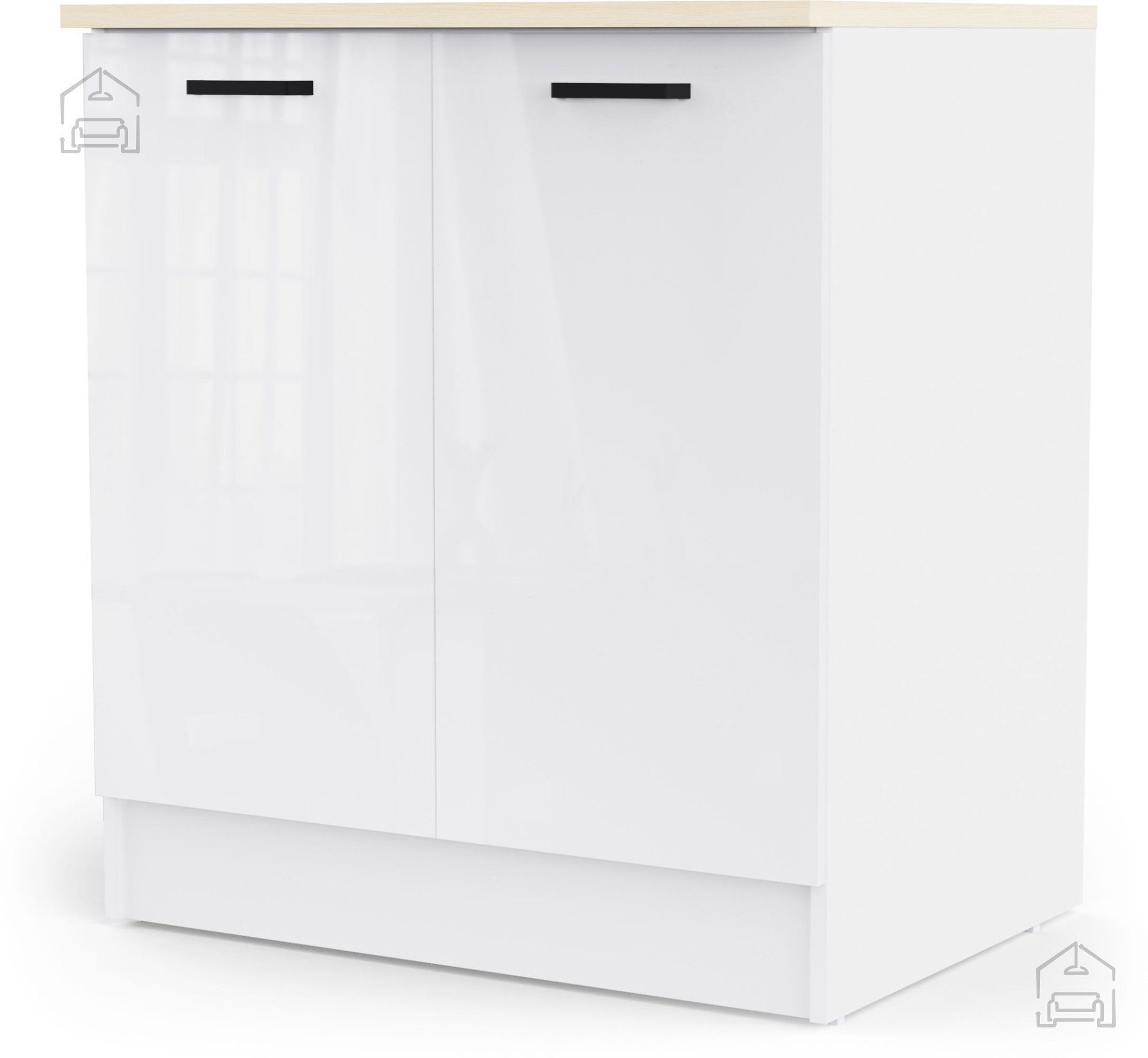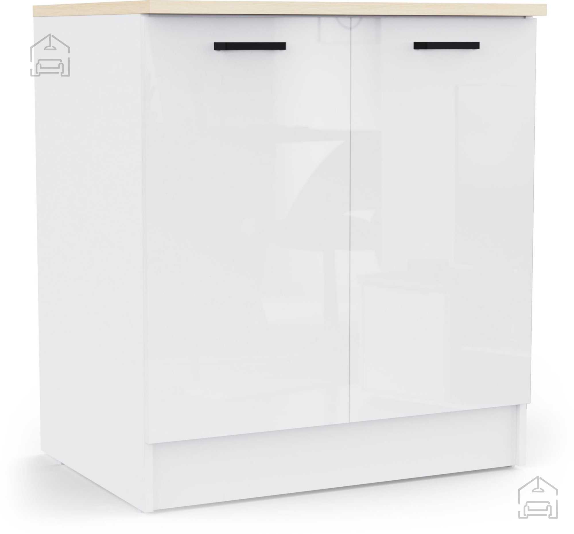 Der Korpus besteht aus 16 mm starker Spanplatte, was für Stabilität und Langlebigkeit sorgt. Die 22 mm starke Arbeitsplatte in Eichenoptik ergänzt mit ihrem warmen Holzton die glänzenden weißen Fronten perfekt. Die Oberfläche ist robust genug für den täglichen Gebrauch – sei es zur Essensvorbereitung oder zum Abstellen kleiner Küchengeräte. Der Schrank kann einzeln genutzt oder als Teil einer größeren Küchenkombination eingesetzt werden.