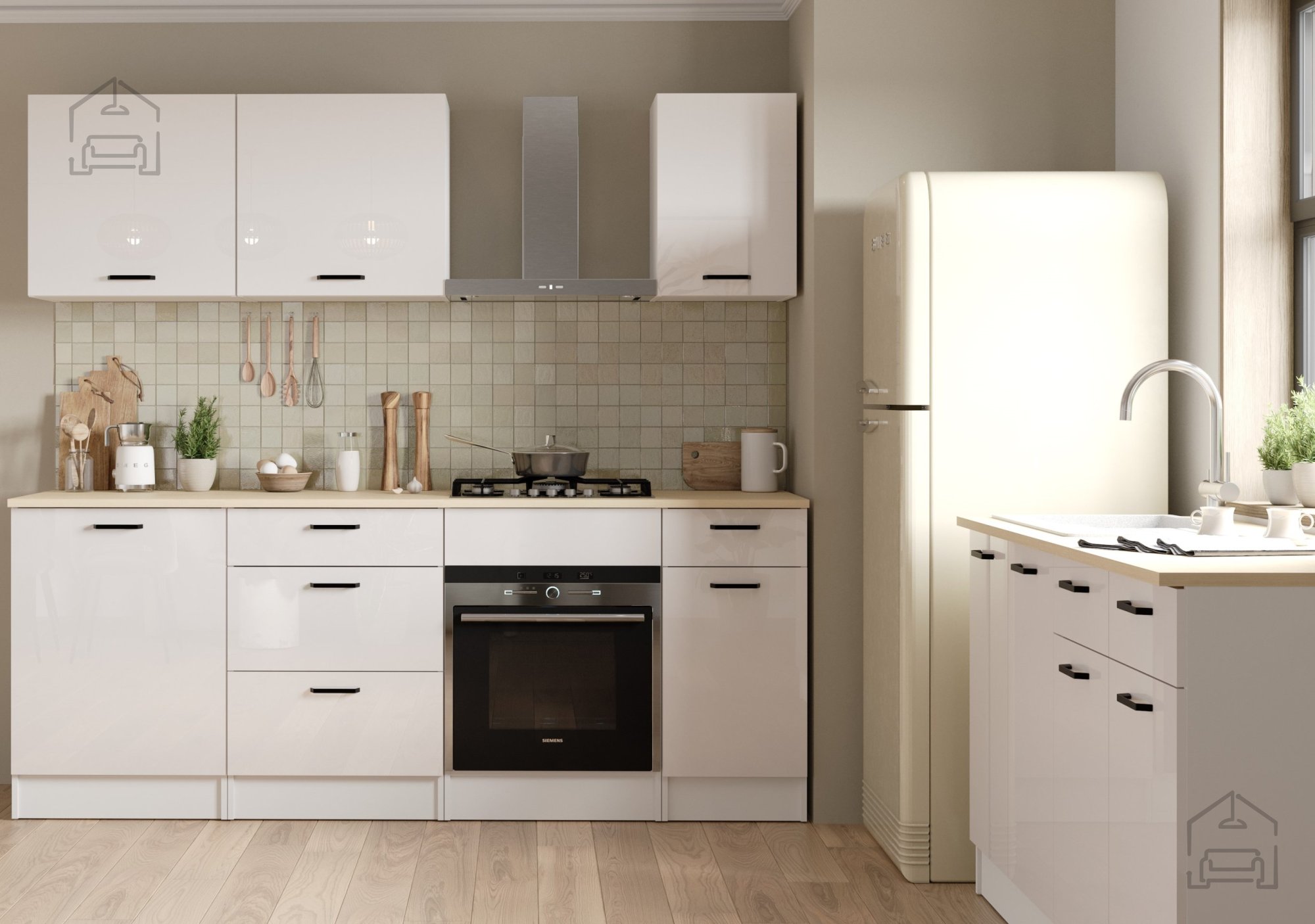 Das Modell eignet sich sowohl für kleinere Küchen, in denen jeder Zentimeter zählt, als auch für größere Küchenkompositionen, wo die harmonische Optik und der Glanz der Oberflächen besonders gut zur Geltung kommen. Klare Linien, dezente Griffe und die schlichte Form sorgen für ein zeitloses Erscheinungsbild, das zu vielen Einrichtungsstilen passt – von skandinavisch bis hin zu modern-urban.