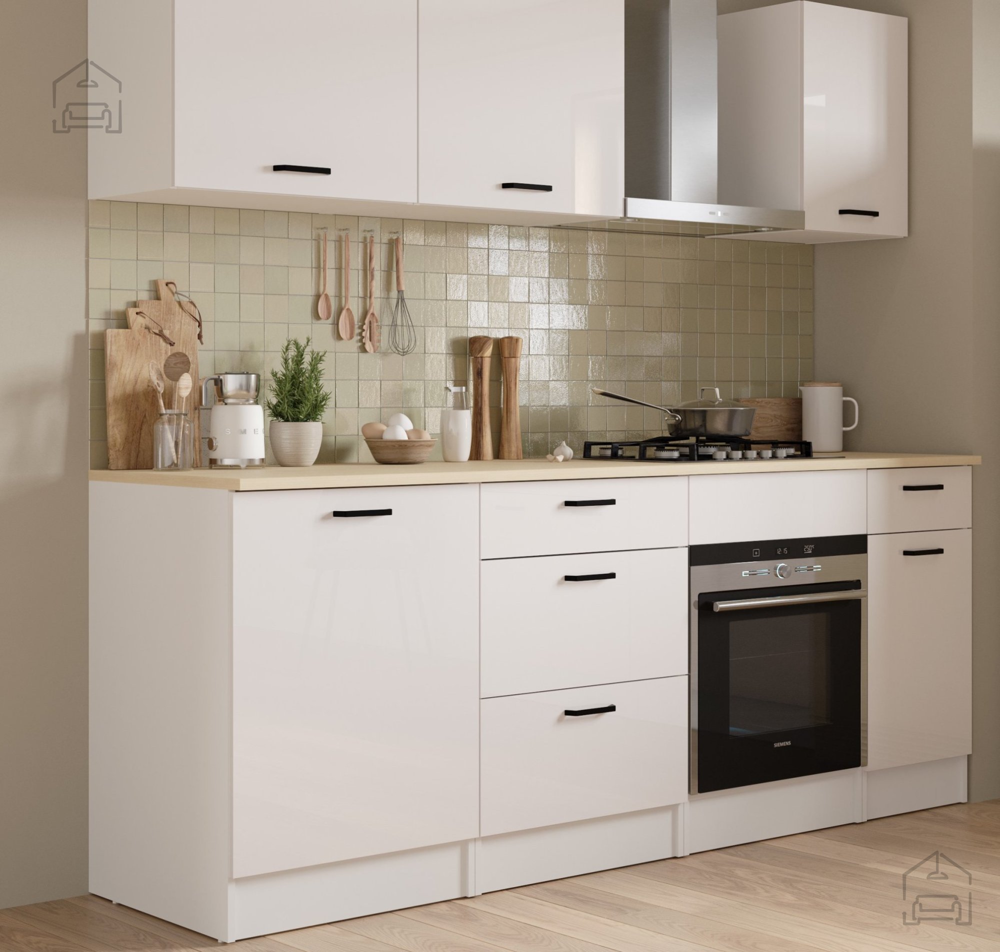 Der Schrank besteht aus hochwertiger 16 mm starker Spanplatte, die Stabilität und Langlebigkeit gewährleistet. Die Oberfläche ist mit einer Melaminbeschichtung versehen, die vor Feuchtigkeit, Hitze und alltäglichen Kratzern schützt. Die Seitenteile sind in mattem Weiß gehalten, während die Fronten im Hochglanz-Finish ausgeführt sind – das betont zusätzlich den hellen Charakter der Küche. Die Kombination aus matten und glänzenden Flächen sorgt für Tiefe und einen angenehmen visuellen Kontrast und macht die Reinigung besonders einfach.
