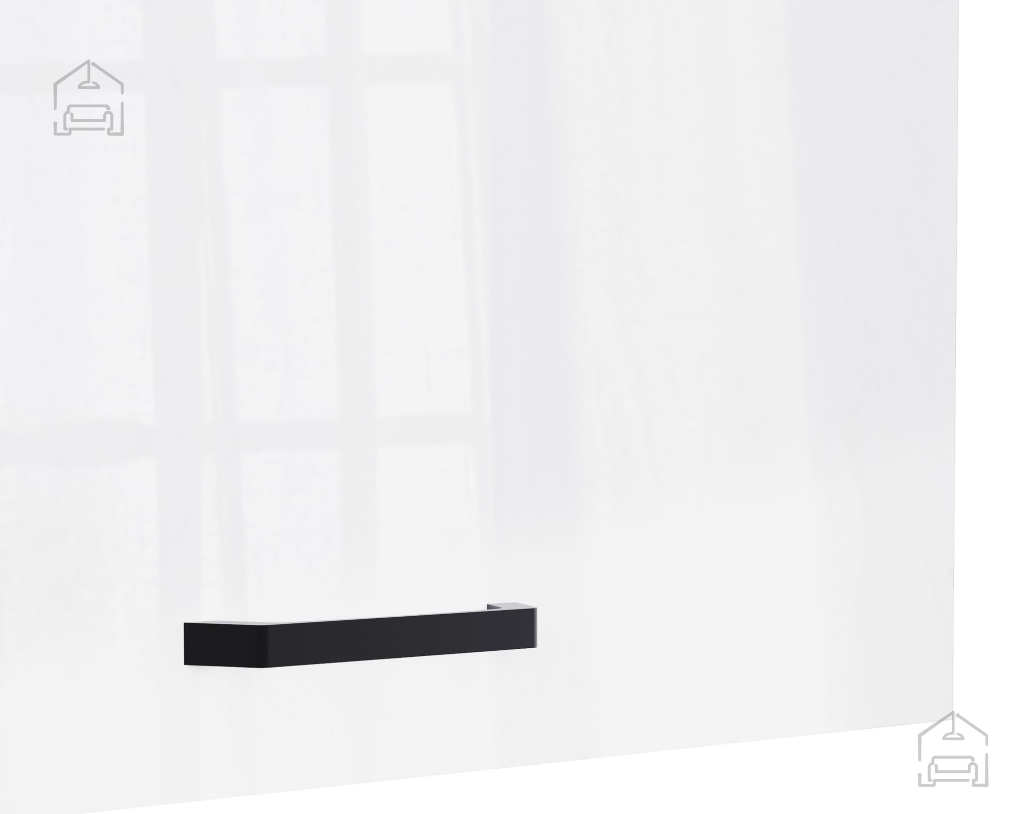 Der Schrank ist mit einem schwarzen Aluminiumgriff ausgestattet, der angenehm in der Hand liegt und zugleich das moderne Design unterstreicht. Der dunkle Griff bildet einen schönen Kontrast zur glänzenden weißen Oberfläche und betont die klaren Linien des Möbels. Die maximale Tragkraft des Innenraums beträgt 8 kg – ideal für die Aufbewahrung alltäglicher Küchenutensilien.