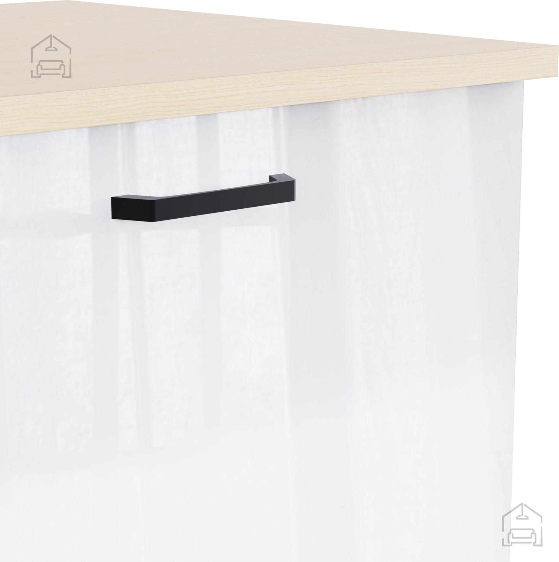Die Tür des Schranks ist mit einem schwarzen Aluminiumgriff ausgestattet, der in Kombination mit der weißen Hochglanzfront einen eleganten Kontrast bildet. Das Soft-Close-System sorgt für ein leises und sanftes Schließen, verhindert ein Zuschlagen und erhöht so die Lebensdauer des Möbels. Die Tür kann wahlweise links- oder rechtsseitig montiert werden, was zusätzliche Flexibilität bei der Platzierung bietet.