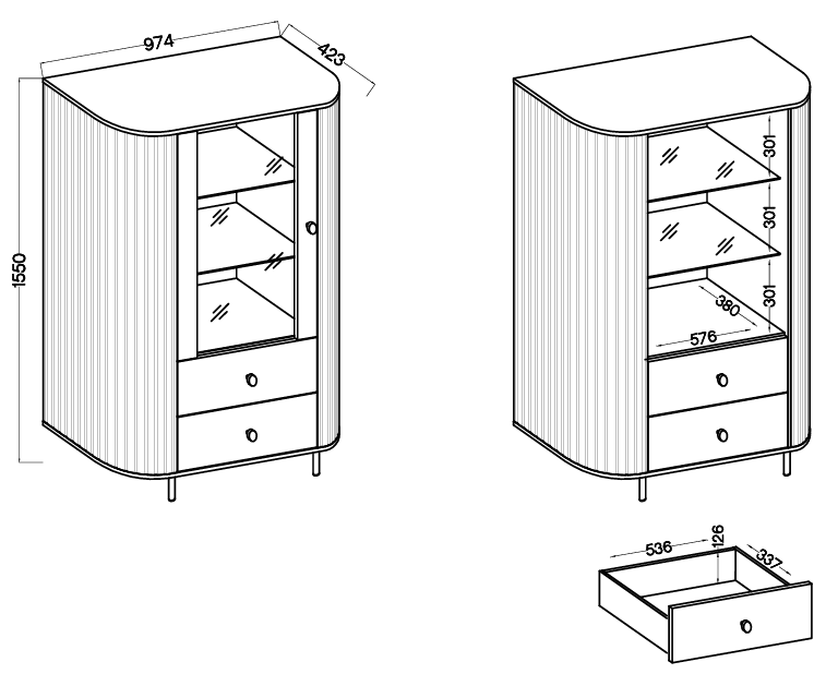 Mit den Abmessungen von 97,4 × 42,3 × 155 cm bietet die Vitrine großzügigen Stauraum, ohne dabei zu viel Platz zu beanspruchen. Die Höhe von 155 cm ermöglicht eine praktische Anordnung von Fächern und Laden und sorgt gleichzeitig für gute Erreichbarkeit aller Bereiche. Dank ihrer ausgewogenen Proportionen fügt sie sich harmonisch sowohl in bestehende Möbelensembles als auch in neue Wohn- oder Esszimmereinrichtungen ein.
