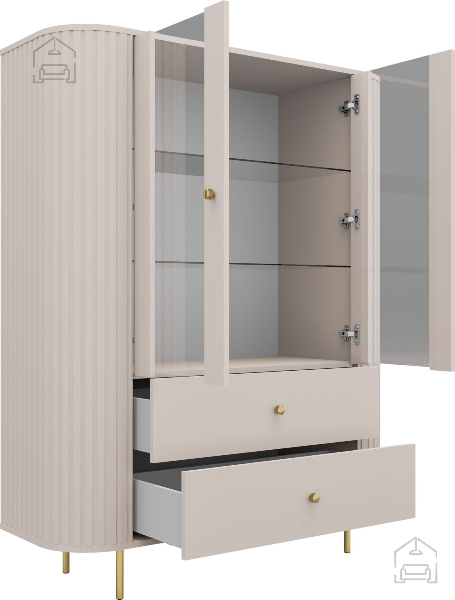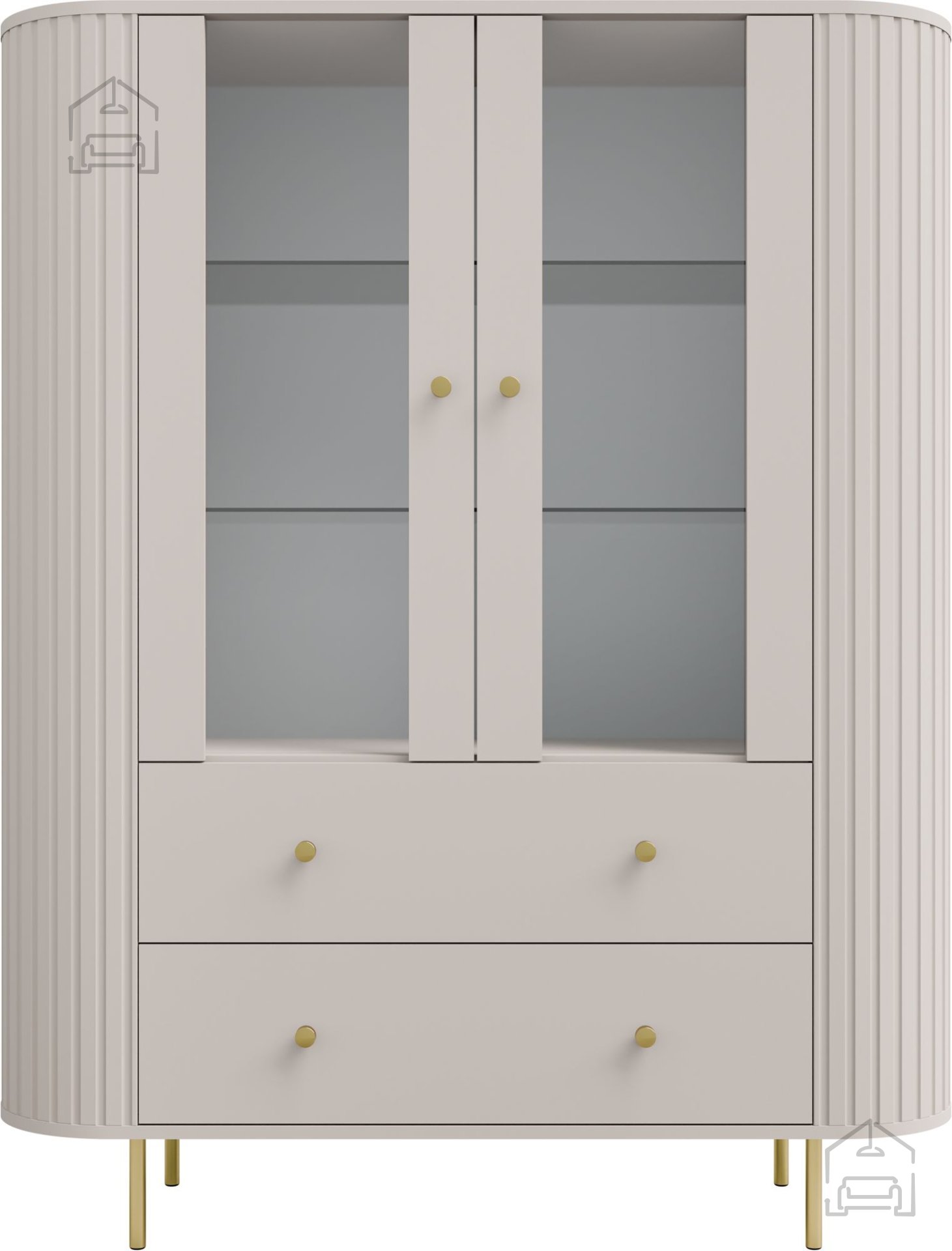 Die Vitrine 2F2S Ovalio verfügt über zwei Türen und zwei großzügige Schubladen, die eine übersichtliche Organisation ermöglichen. Im oberen Bereich lassen sich Dekoration, Gläser oder Bücher schön präsentieren, während der untere Teil Stauraum für weniger sichtbare Dinge bietet. Diese Aufteilung eignet sich ideal für Wohn- oder Esszimmer sowie für den Flur, wo Sie Ästhetik und Funktionalität miteinander verbinden möchten.