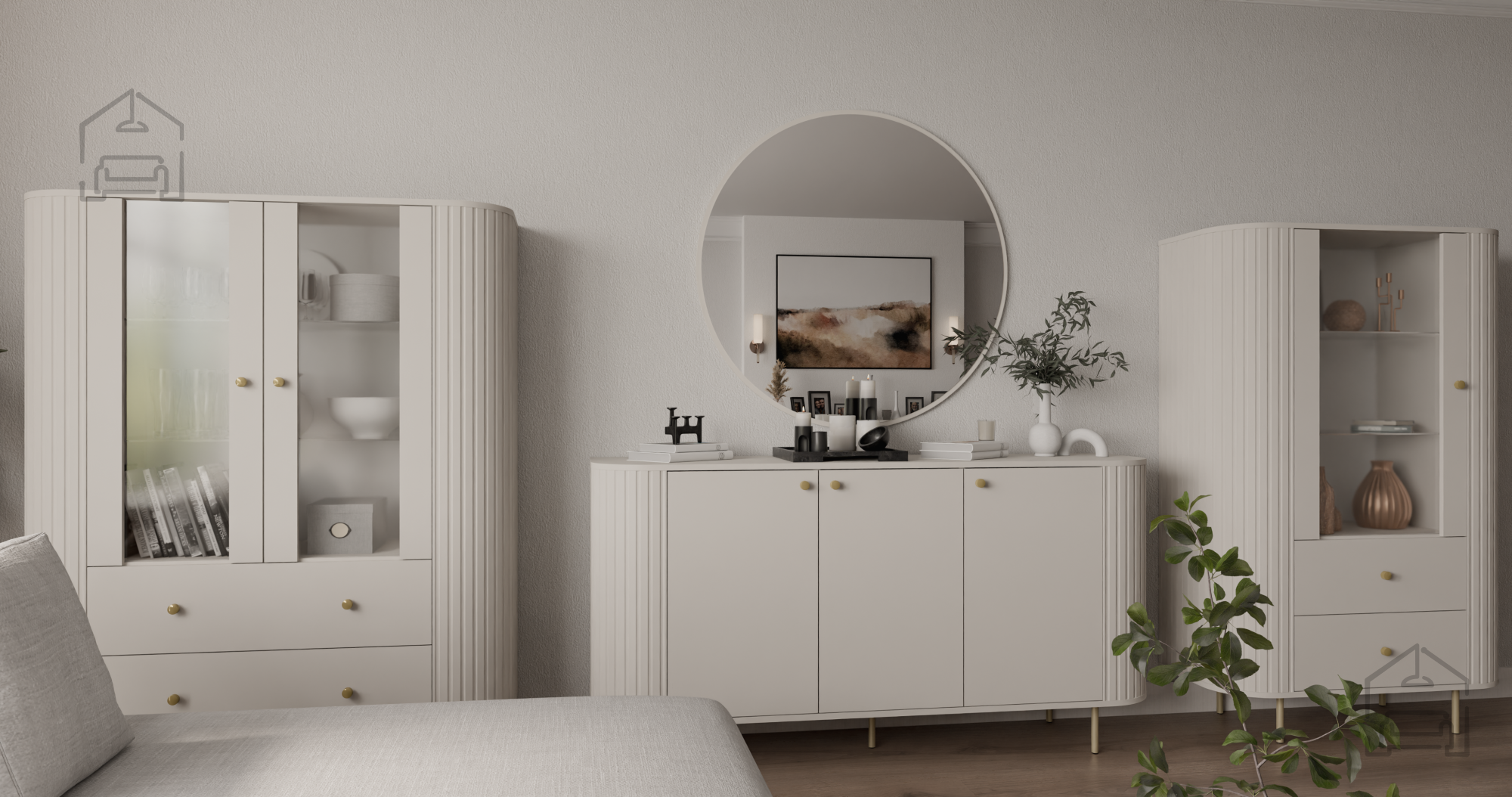 Die Vitrine 2F2S Ovalio kann als einzelnes Möbelstück als Blickfang dienen oder mit weiteren Elementen derselben Kollektion kombiniert werden. Durch den neutralen Farbton und die ausgewogenen Proportionen passt sie sowohl in minimalistisch als auch klassisch gestaltete Räume. Mit den Maßen 123 x 42,3 x 155 cm lässt sie sich ideal an der Wand platzieren, wo sie nicht wuchtig wirkt, sondern dem Raum zusätzliche Tiefe und Behaglichkeit verleiht.