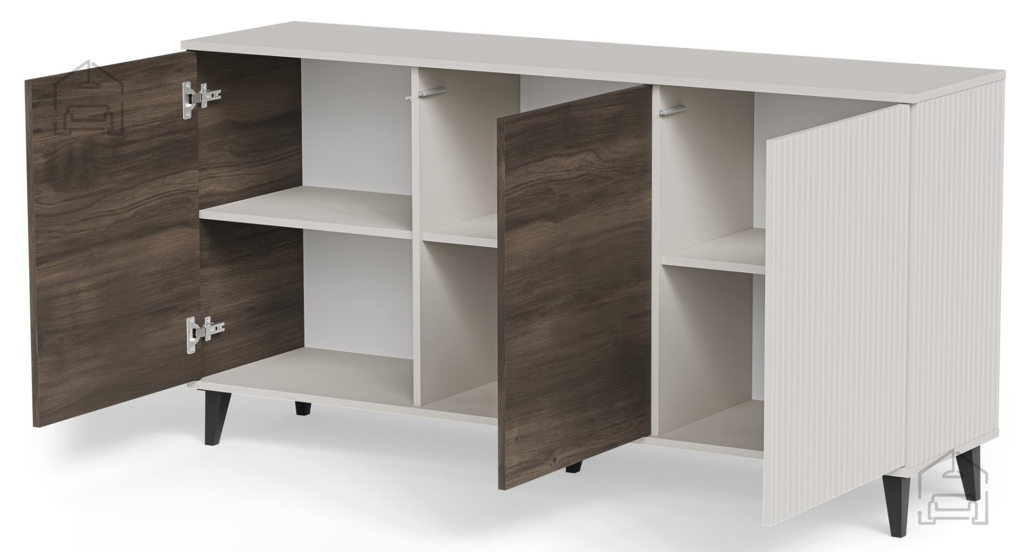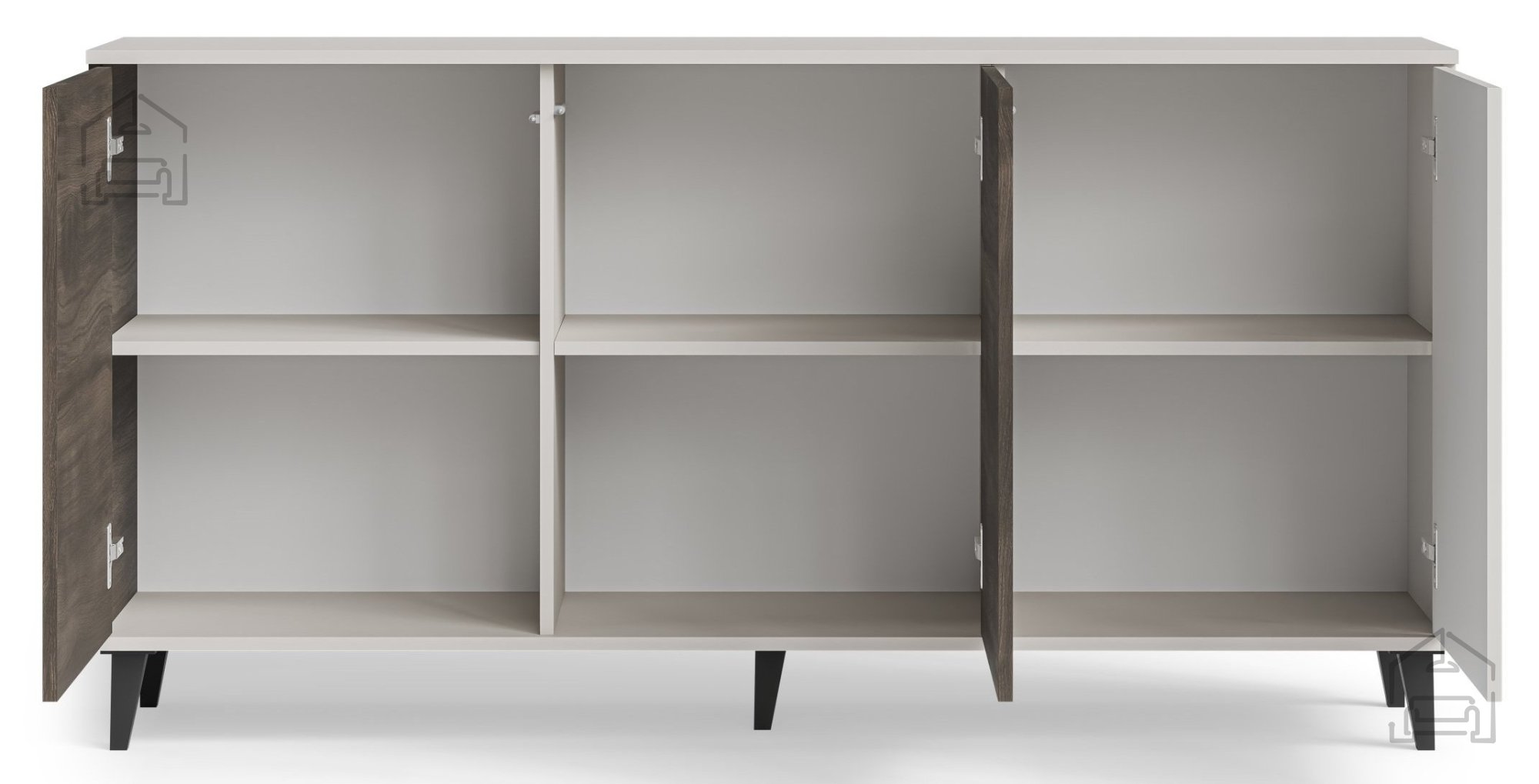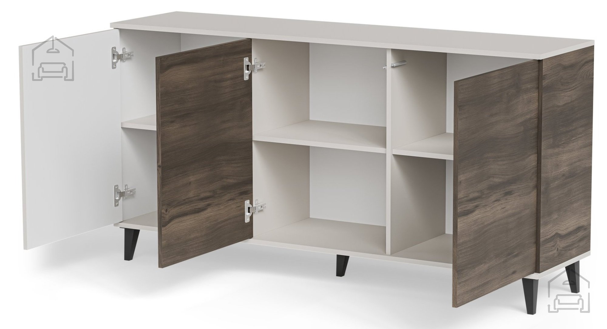 Egal, ob im Wohnzimmer, Essbereich oder Vorraum – dank der neutralen Farben und klaren Linien lässt sich die Kommode mühelos mit bestehendem Mobiliar kombinieren. Die warme Nussbaumfarbe verleiht dem Raum Behaglichkeit, der Cashmere-Ton bringt eine sanfte Note, und die schwarzen Akzente setzen einen modernen Kontrast. Die Kommode Random 2 KM-1 lässt sich vielseitig kombinieren – entweder mit weiteren Möbelstücken aus derselben Serie oder als stilvoller Solitär.
