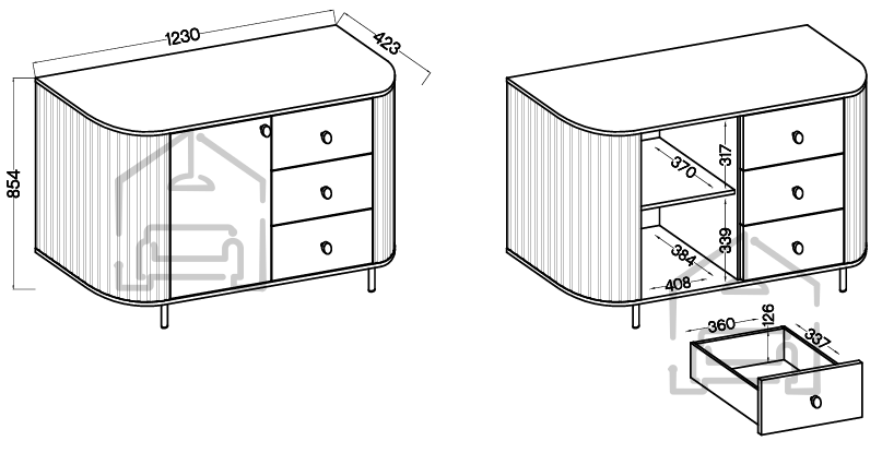 Die Maße der Kommode betragen 123 × 42,3 × 85,4 cm – ein ideales Verhältnis zwischen Geräumigkeit und kompakter Form. Dank der ausgewogenen Abmessungen lässt sie sich problemlos an der Wand im Wohnzimmer, im Flur oder im Schlafzimmer aufstellen, ohne zu viel Platz einzunehmen. Die obere Ablagefläche bietet zusätzlichen Raum für Dekorationen wie Vasen, Bilderrahmen oder Lampen.