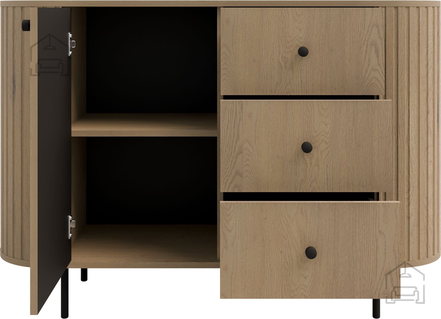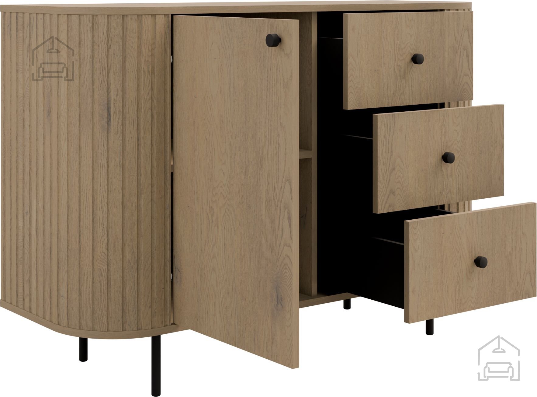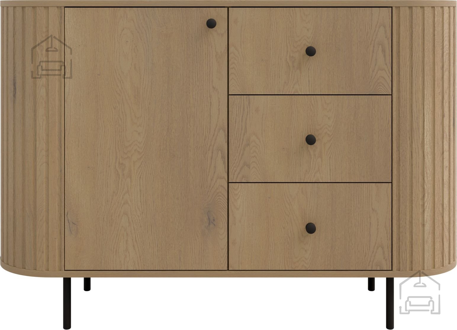Die Kommode 1F3S Ovalio in der Farbe Cremona Eiche verbindet die warme, natürliche Ausstrahlung von Holz mit verlässlicher Funktionalität. Sie besteht aus einer hochwertigen, 16 mm starken laminierten Platte, die Stabilität, Robustheit und eine lange Lebensdauer gewährleistet. Durch das durchdachte Design und die sorgfältige Verarbeitung fügt sich die Kommode harmonisch in verschiedenste Wohnbereiche ein – ob in moderne Interieurs oder klassisch eingerichtete Wohn- und Schlafzimmer.