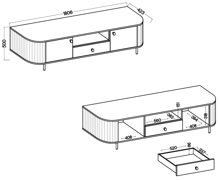 Der warme Cremona-Eichen-Ton betont die natürliche Holzstruktur und bildet einen angenehmen Kontrast zu modernen Elementen wie Metallakzenten, Glastischen oder hellen Tapeten. Das TV-Lowboard 2F1S Ovalio kann als Einzelstück oder Teil einer größeren Möbelserie in derselben Farbvariante eingesetzt werden, wodurch ein harmonisches Gesamtbild entsteht. Dank der klaren Formgebung lässt es sich sowohl an der Wand platzieren als auch als zentraler Blickfang unter dem Fernseher verwenden – stets mit stimmigem optischem Gleichgewicht.