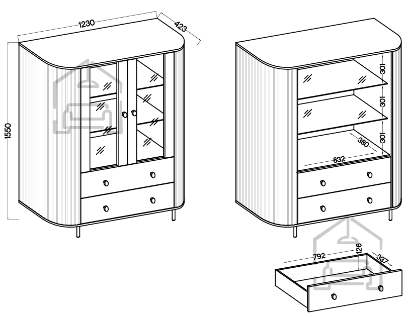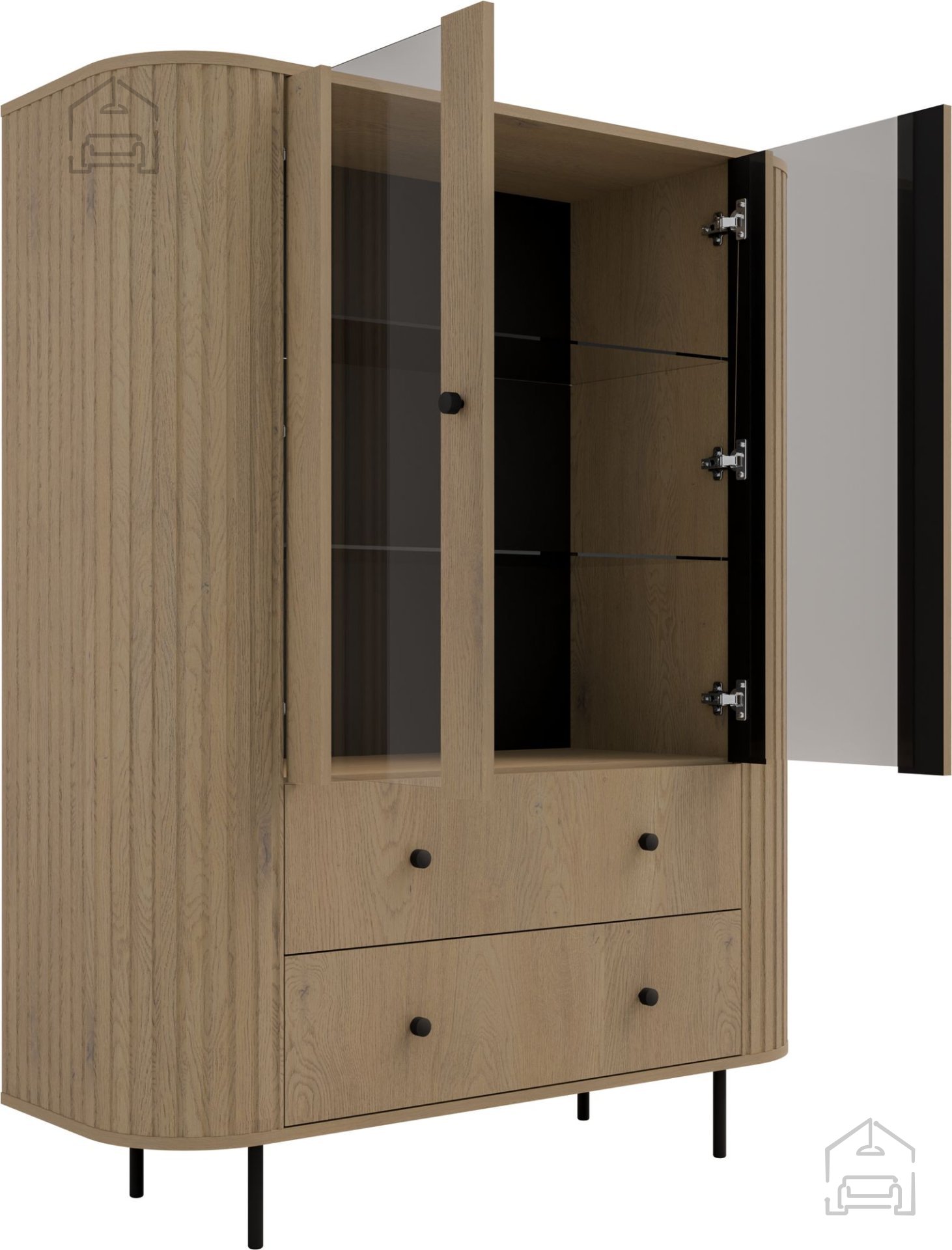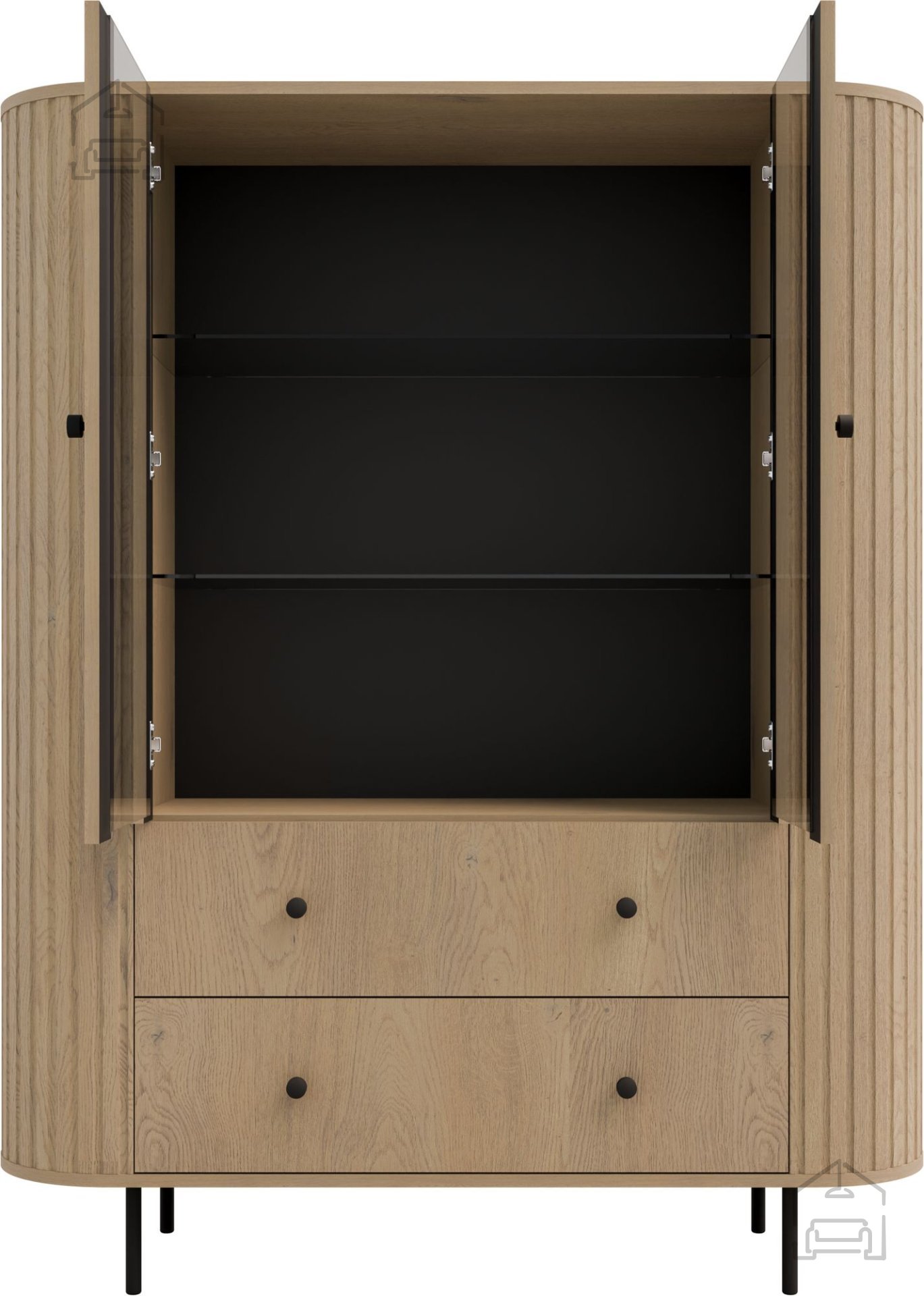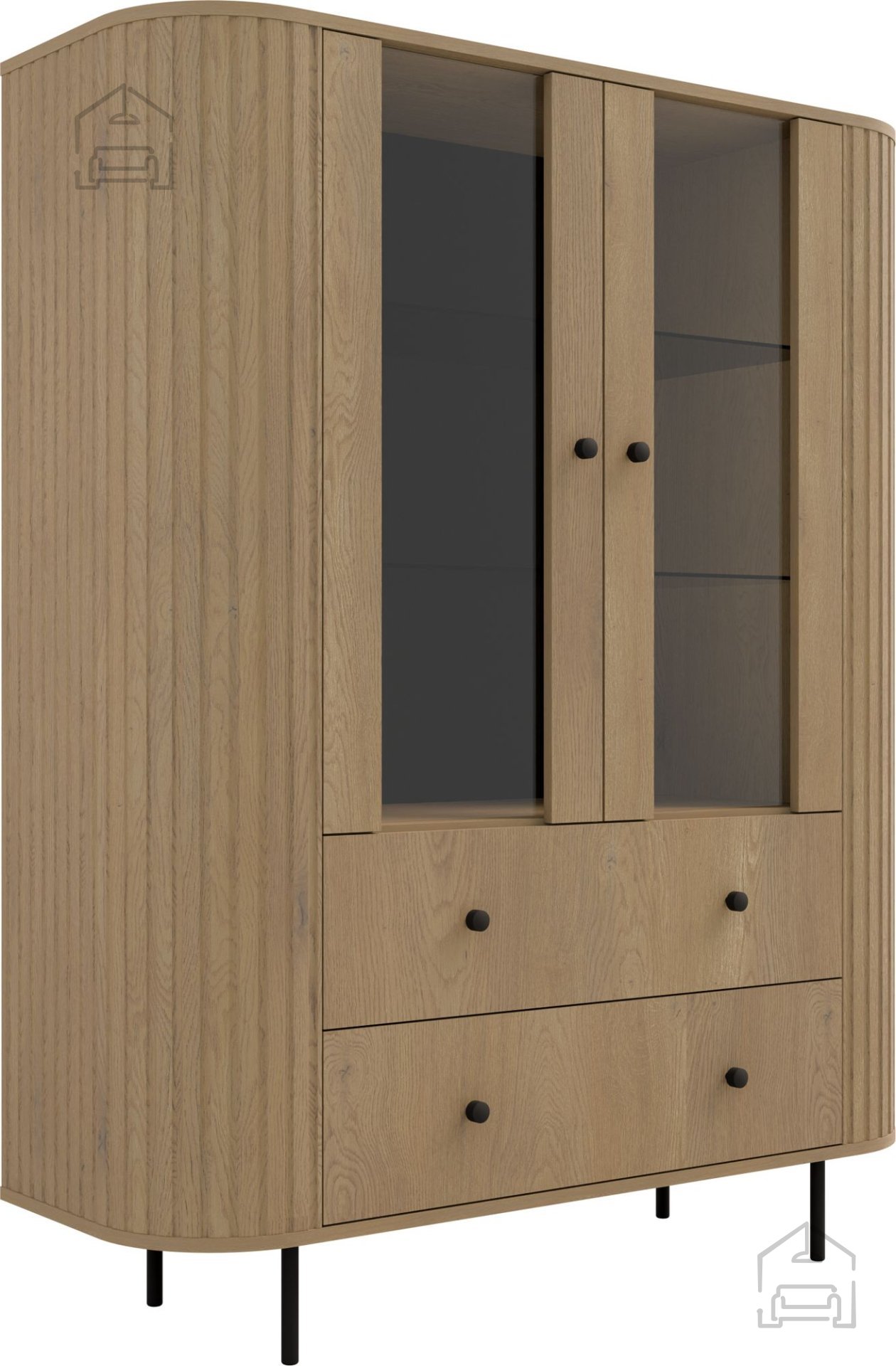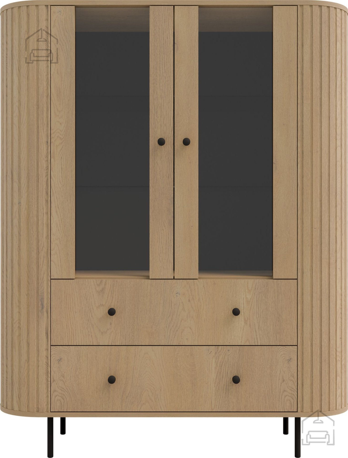 Die Konstruktion mit zwei Türen und zwei Schubladen (2F2S) ermöglicht vielseitige Aufbewahrungsmöglichkeiten. Hinter den Glastüren befindet sich Platz, um dekorative Objekte, Porzellan oder Gläser stilvoll zu präsentieren. Die unteren Bereiche mit Schubladen sind ideal, um Textilien, Unterlagen oder kleinere Gegenstände ordentlich zu verstauen – griffbereit, aber nicht sichtbar. Diese Aufteilung sorgt dafür, dass die Vitrine sowohl funktional als auch optisch überzeugt.