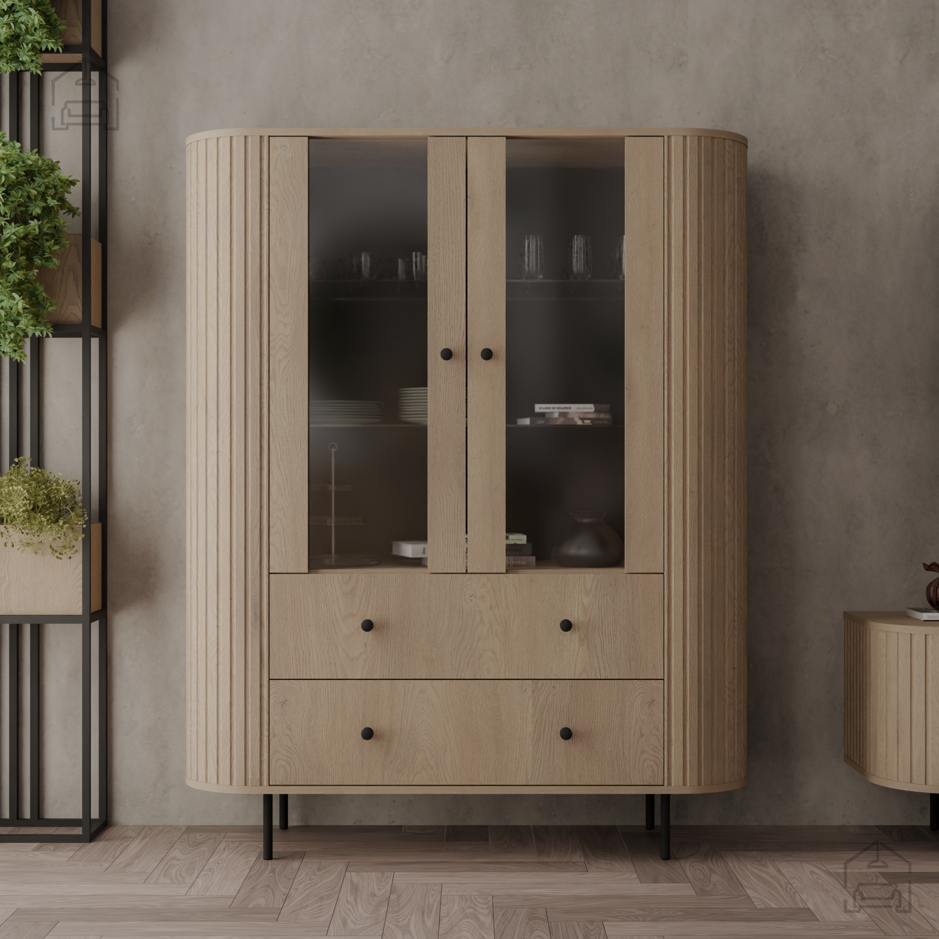 Dank ihrer ausgewogenen Maße fügt sich die Vitrine 2F2S Ovalio harmonisch in verschiedenste Räume ein. Im Wohnzimmer dient sie als stilvoller Blickfang, im Esszimmer als praktischer Stauraum für Geschirr und Besteck, und im Vorraum als nützliche Kombination aus offenem und geschlossenem Stauraum. Die Höhe bietet zudem Platz, um auf der oberen Fläche Pflanzen, Bilderrahmen oder eine Lampe zu platzieren.