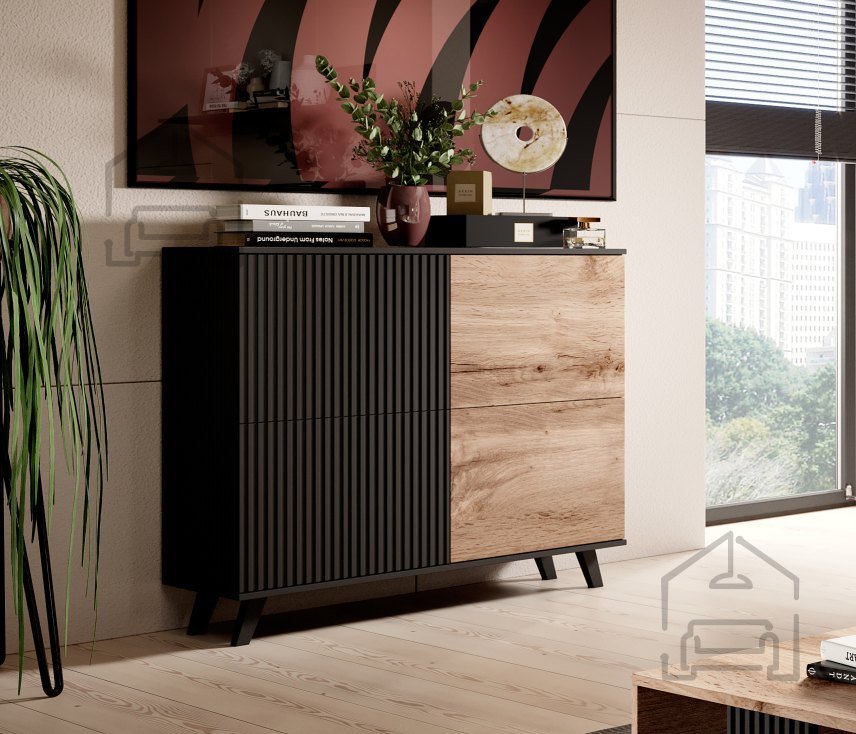 Die Wohnwand Random – Halmar ist ein modernes Möbelset, das für all jene entworfen wurde, die Wert auf ein harmonisches Erscheinungsbild, Funktionalität und die Wärme natürlicher Materialien legen. Gefertigt wird es in der polnischen Manufaktur Halmar, wo handwerkliche Qualität auf zeitgemäßes Design trifft. Die Farbkombination aus Eiche Votan und Schwarz schafft einen ausgewogenen Kontrast, der zu unterschiedlichsten Einrichtungsstilen passt – von minimalistisch bis klassisch.