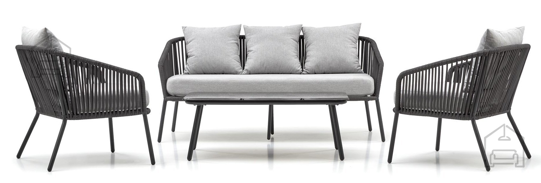 Das Set Rocca ist in der Farbkombination Dunkelgrau – Hellgrau erhältlich, die sich harmonisch mit vielen Einrichtungsstilen im Außenbereich kombinieren lässt. Dunkelgraue Aluminiumrahmen schaffen eine stabile optische Basis, während der hellgraue Stoff Frische und Leichtigkeit verleiht. Diese Farbgestaltung ermöglicht eine einfache Abstimmung mit anderen Materialien – ob Holz, Stein oder Metall.