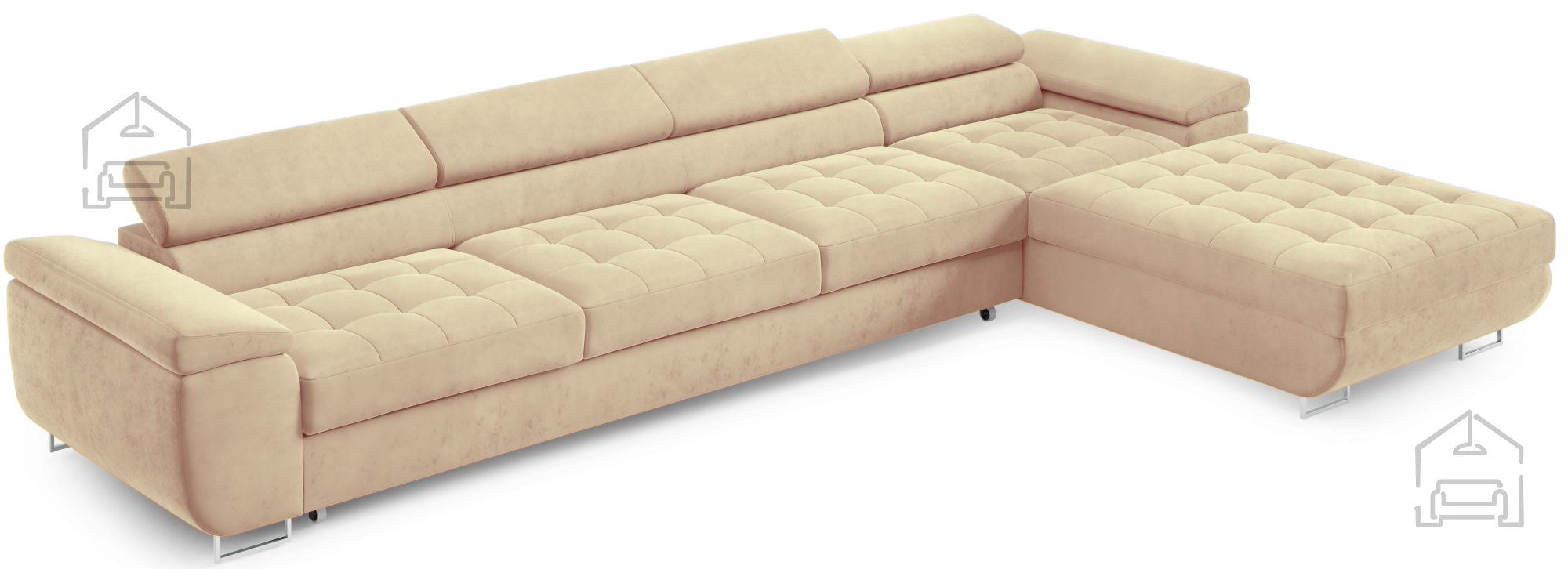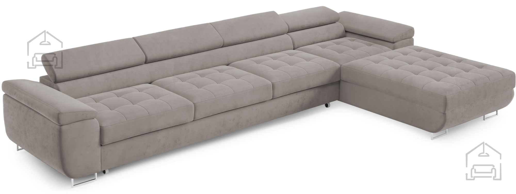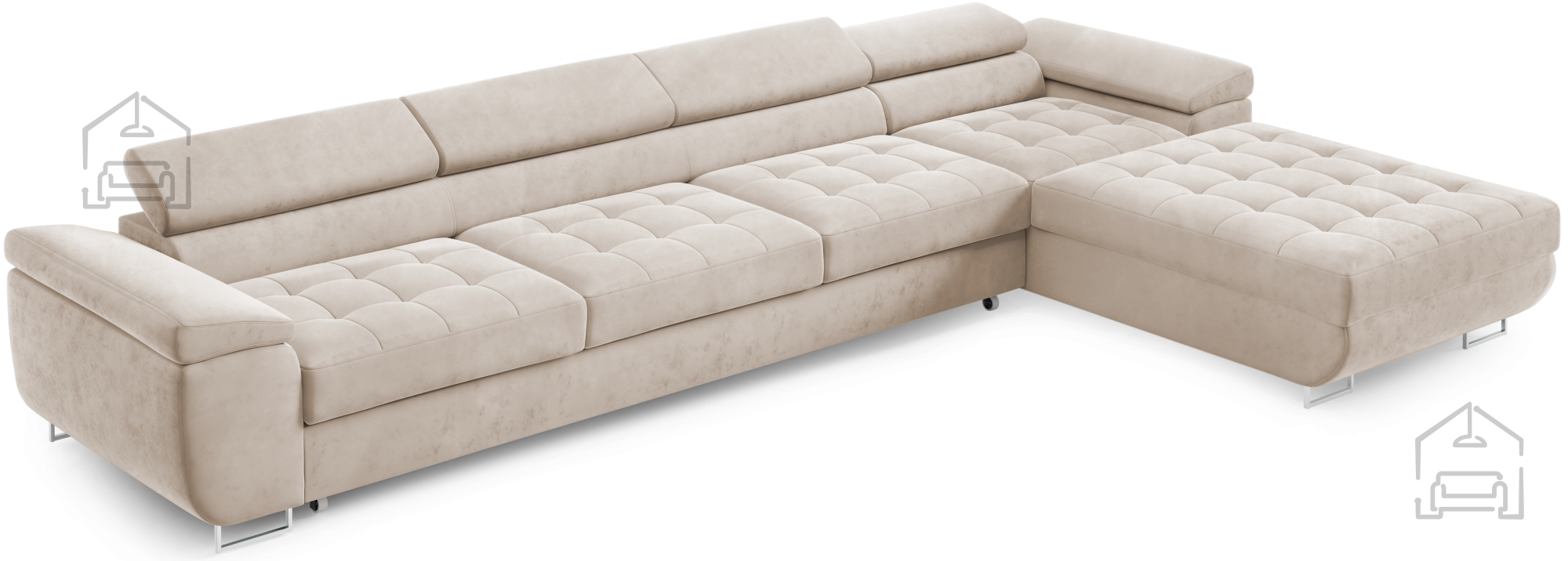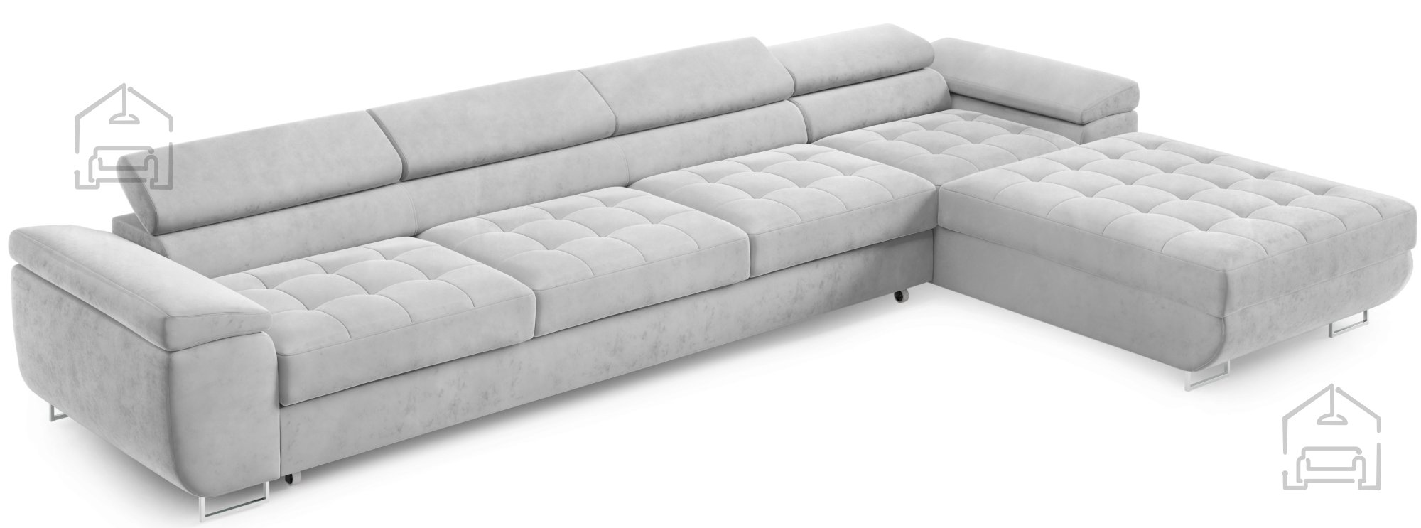 Für zusätzlichen Komfort im Alltag sorgen die verstellbaren Kopfstützen, mit denen sich Höhe und Neigung individuell anpassen lassen. So findet jeder seine ideale Position zum Entspannen, Fernsehen oder Lesen. Durchdacht in der Gestaltung, verfügt die Garnitur außerdem über einen großzügigen Bettkasten, in dem sich Decken, Kissen oder andere Accessoires praktisch verstauen lassen – besonders nützlich in kleineren Wohnungen, wo Stauraum immer willkommen ist.