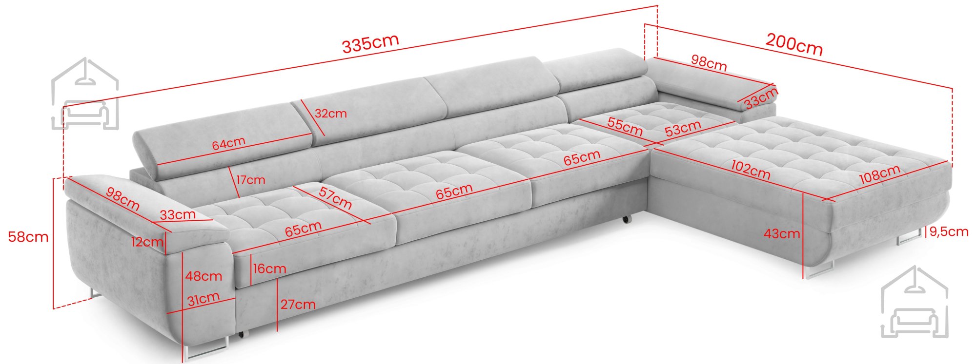 Die Eckcouch Benjamin 155 XL ist in einer linken oder rechten Ausführung erhältlich und kann somit optimal an die Raumaufteilung in Ihrem Wohnzimmer angepasst werden. Dank ihrer Größe und Form nutzt sie den vorhandenen Platz effizient und schafft gleichzeitig eine gemütliche Ecke zum Zusammensitzen oder Entspannen. Die Höhe beträgt 72 cm; mit hochgeklappten Kopfstützen erreicht sie 92 cm, was die ergonomische Gestaltung und Vielseitigkeit unterstreicht. Die maximale Belastbarkeit liegt bei 300 kg – ein weiteres Zeichen für die solide Konstruktion und die hochwertigen Materialien.