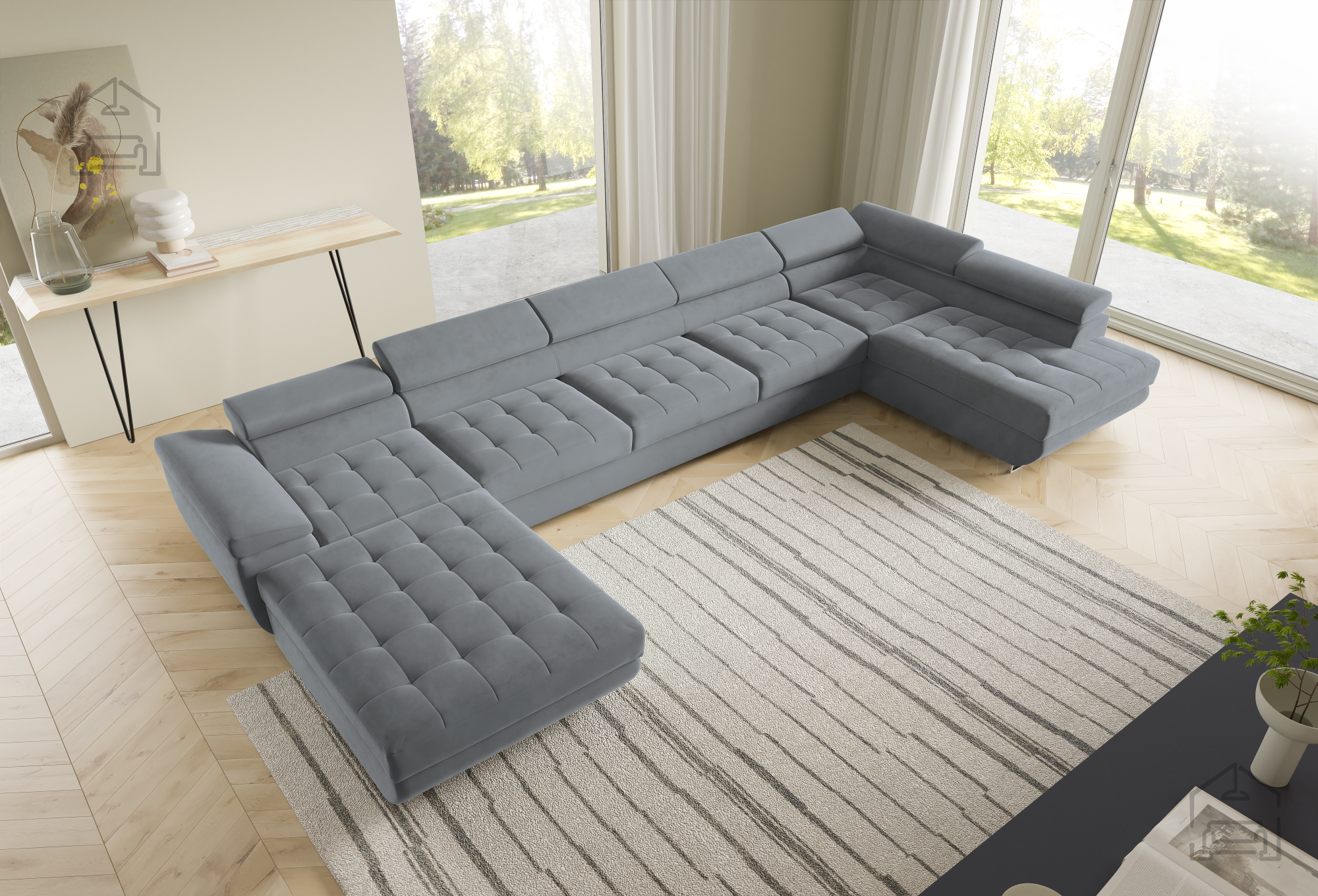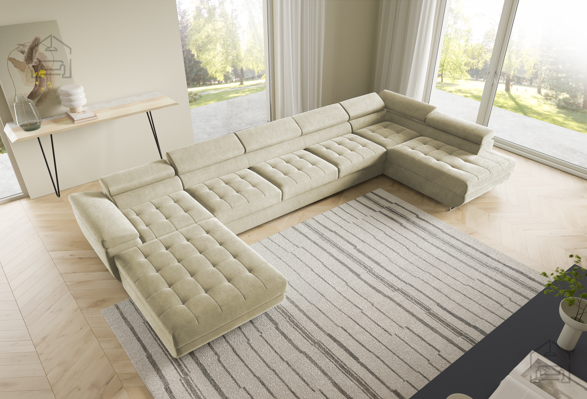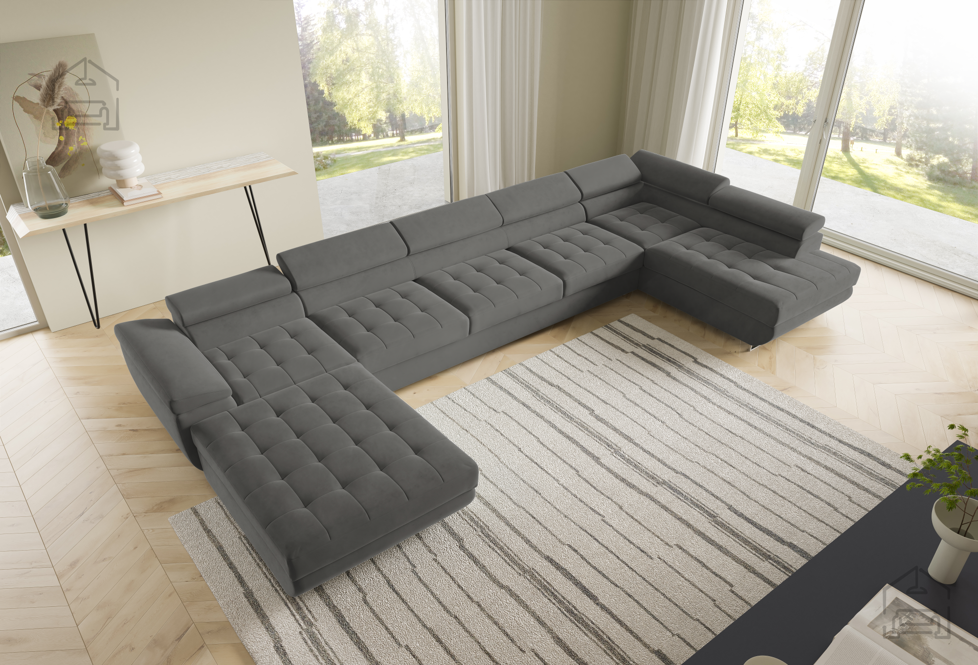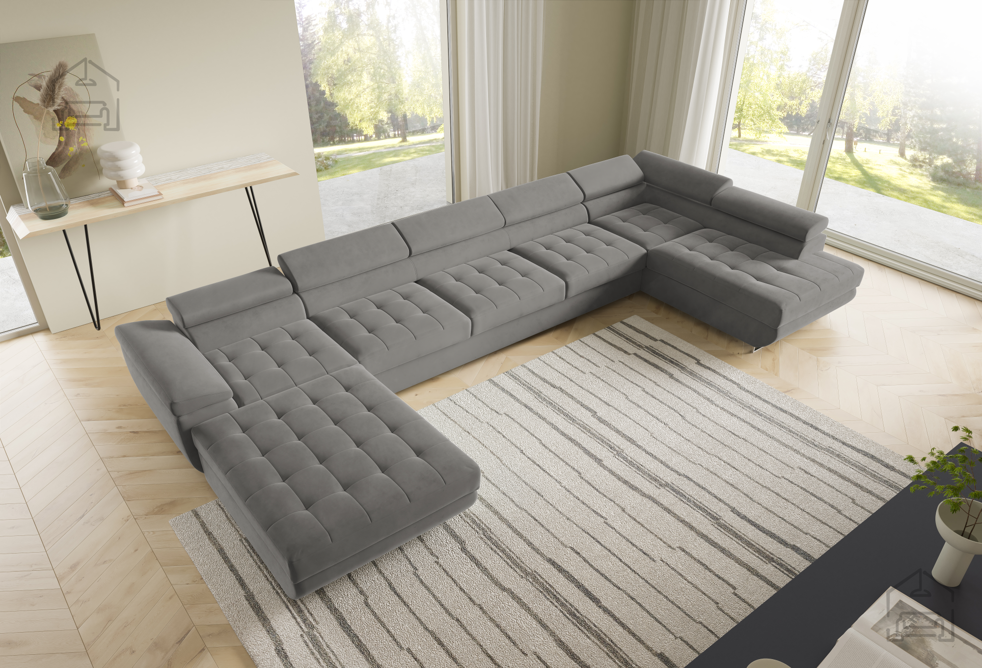 Die U-Form ermöglicht eine flexible Platzierung in größeren Wohnräumen. Der Mittelteil lädt zum gemütlichen Beisammensein ein, während die seitlichen Elemente ideal zum Entspannen sind. Durch die klaren Linien und sorgfältig ausgewählten Materialien wirkt die Wohnlandschaft Benjamin 275 XL elegant und zugleich wohnlich. Der Holzrahmen in Kombination mit dem Stoff Kronos 31 harmoniert wunderbar mit verschiedensten Bodenbelägen und Möbeln und lässt sich mühelos in bestehende Einrichtungen integrieren.