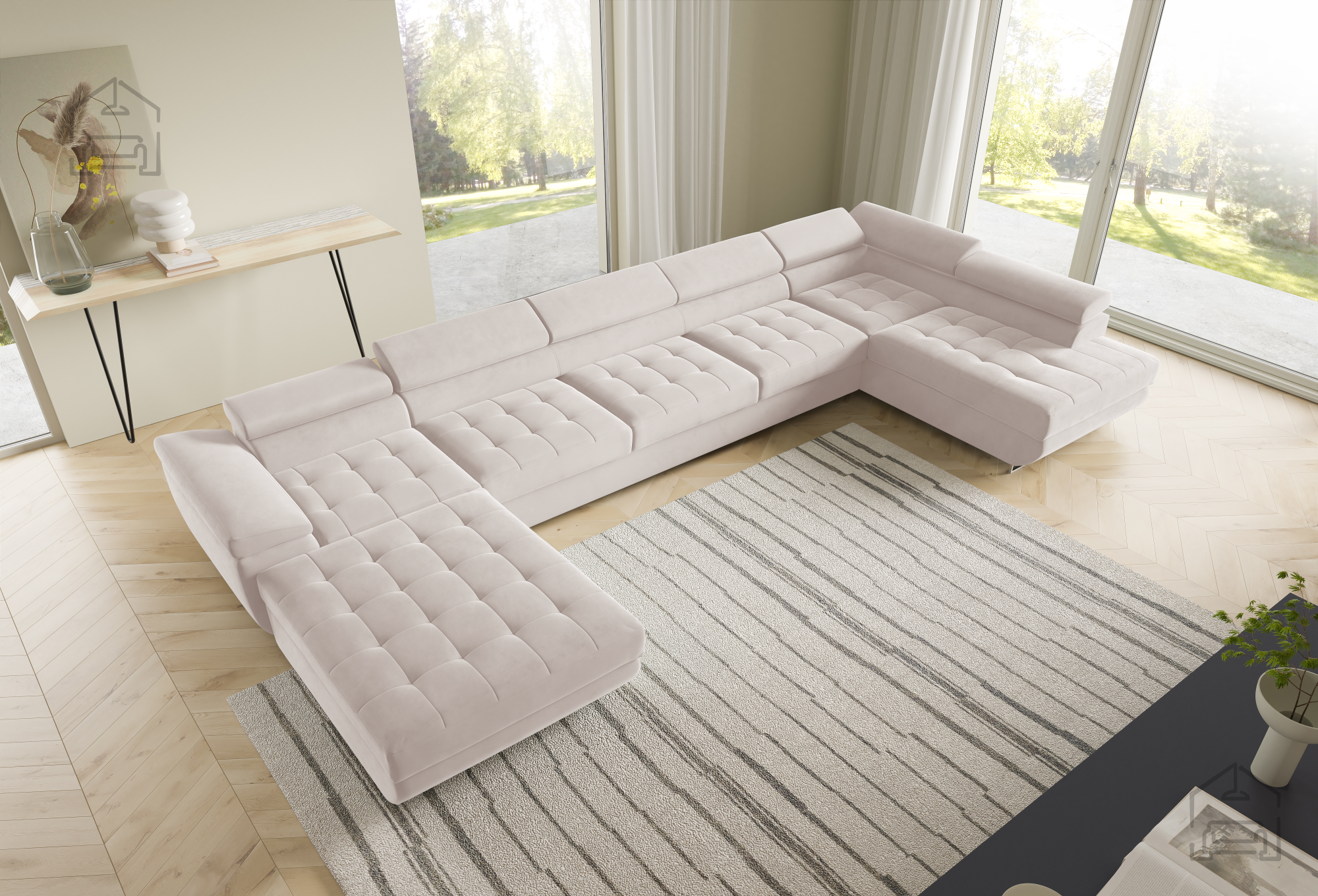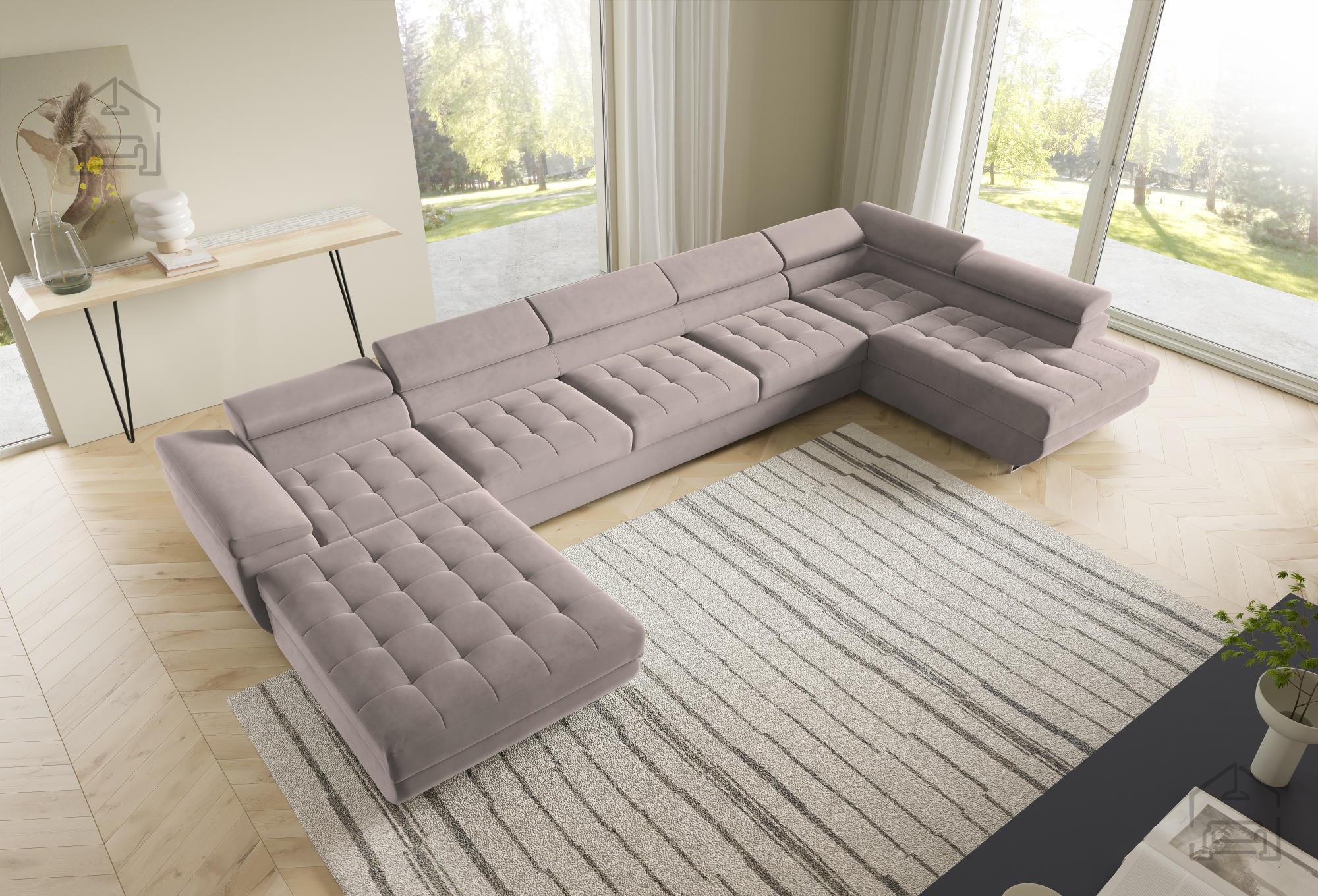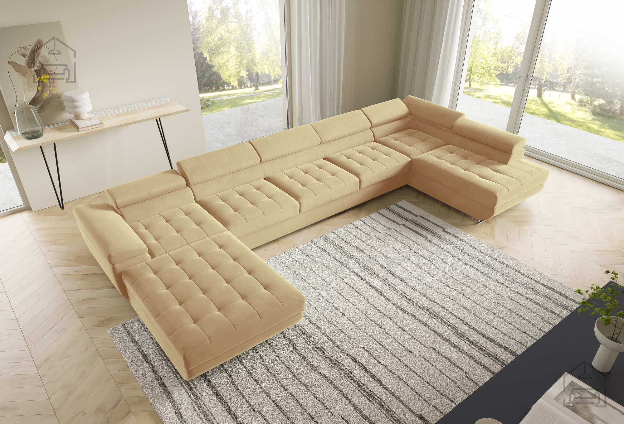 Die U-Form ermöglicht eine flexible Platzierung in größeren Wohnräumen. Der Mittelteil lädt zum gemütlichen Beisammensein ein, während die seitlichen Elemente ideal zum Entspannen sind. Durch die klaren Linien und sorgfältig ausgewählten Materialien wirkt die Wohnlandschaft Benjamin 275 XL elegant und zugleich wohnlich. Der Holzrahmen in Kombination mit dem Stoff Kronos 31 harmoniert wunderbar mit verschiedensten Bodenbelägen und Möbeln und lässt sich mühelos in bestehende Einrichtungen integrieren.