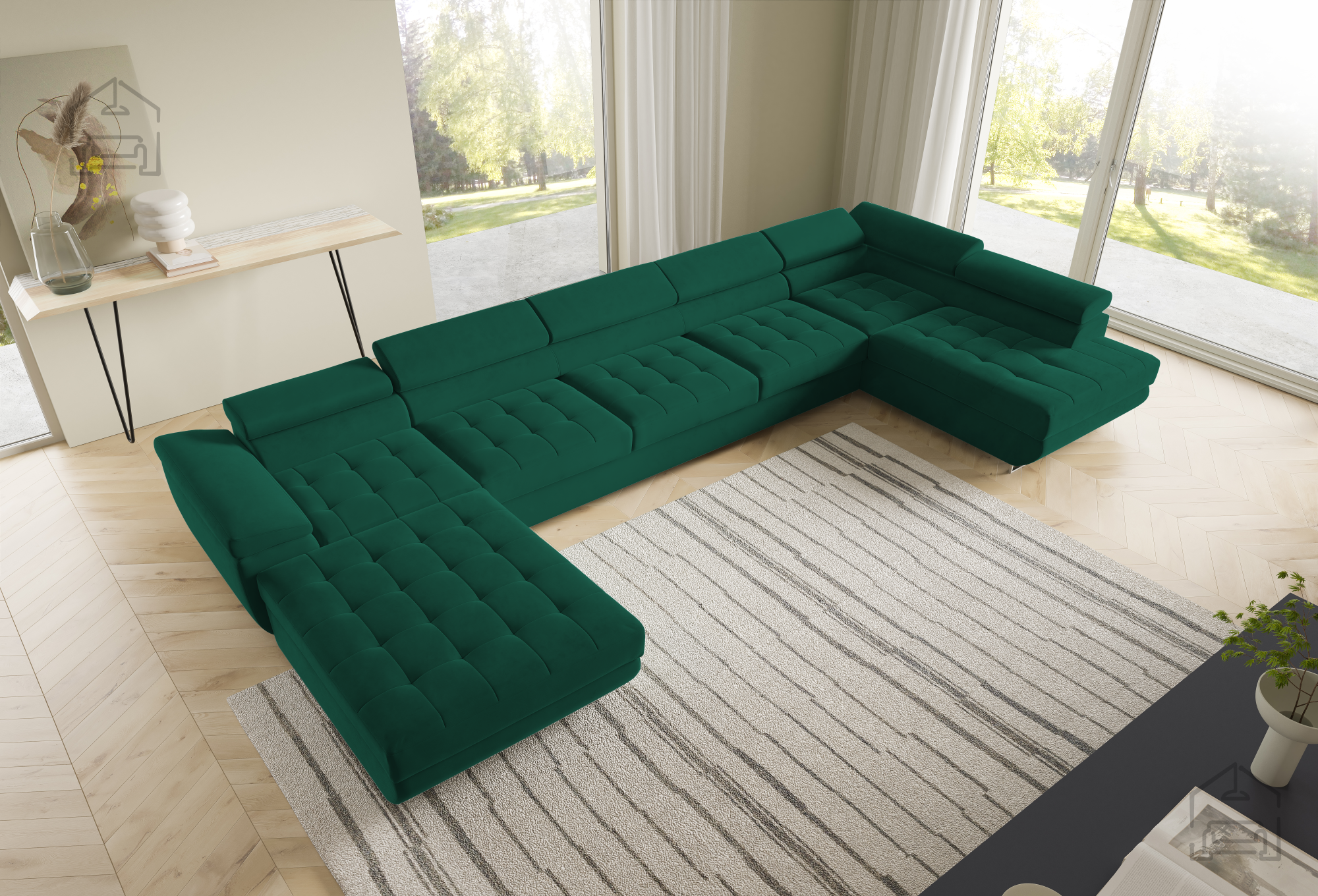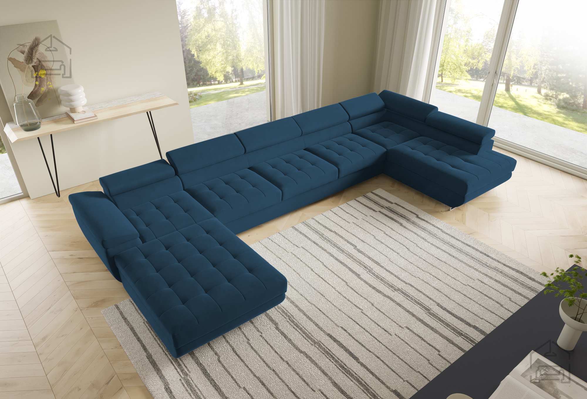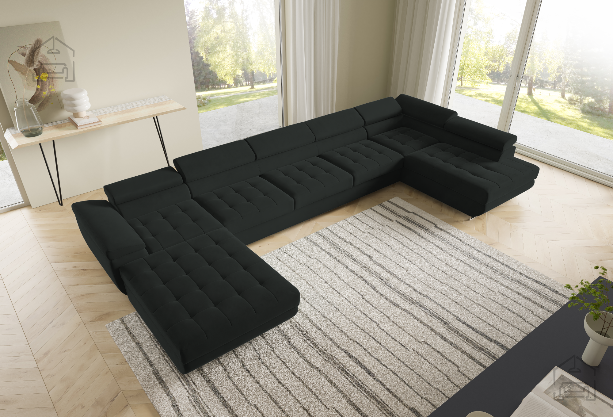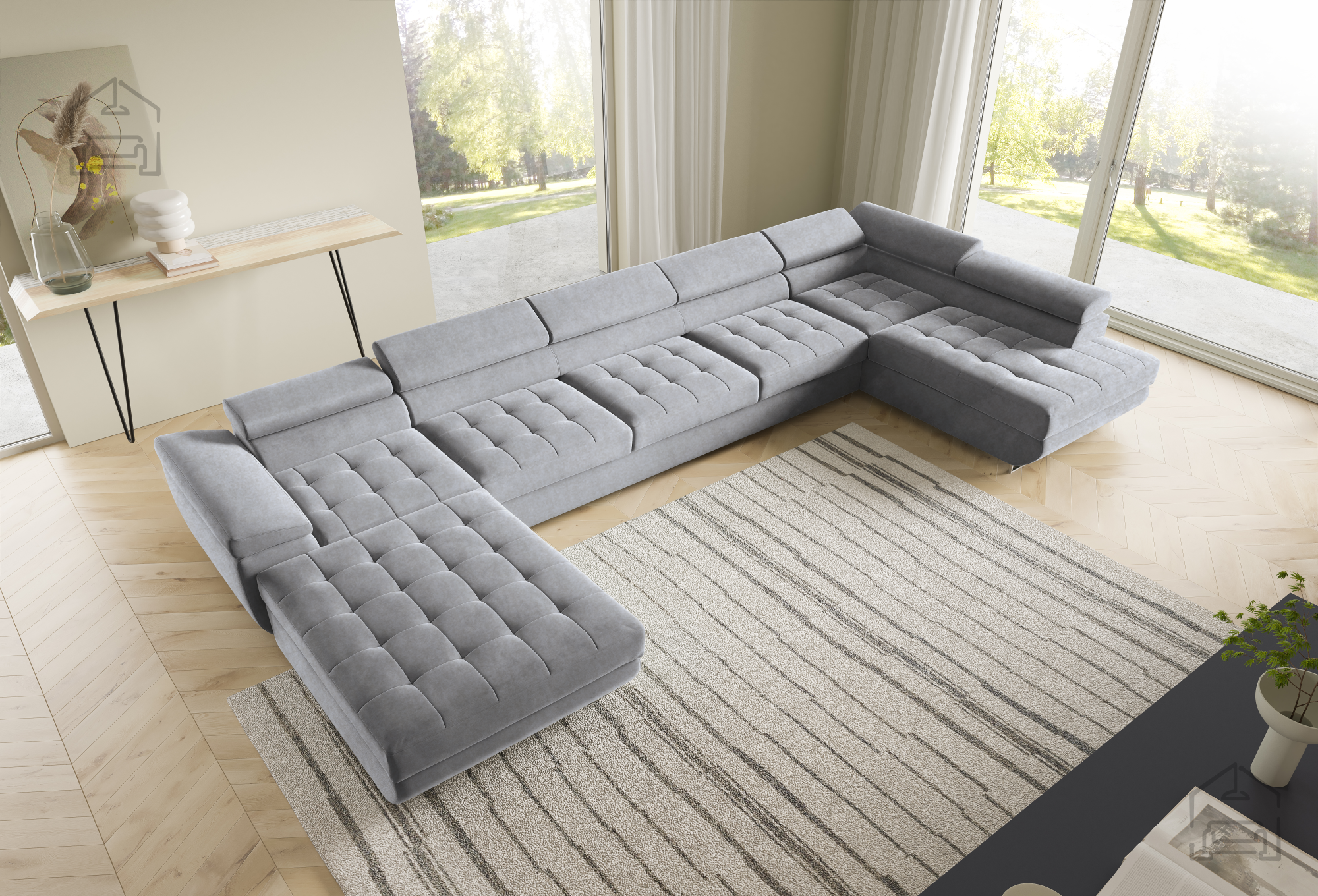 Die U-Form ermöglicht eine flexible Platzierung in größeren Wohnräumen. Der Mittelteil lädt zum gemütlichen Beisammensein ein, während die seitlichen Elemente ideal zum Entspannen sind. Durch die klaren Linien und sorgfältig ausgewählten Materialien wirkt die Wohnlandschaft Benjamin 275 XL elegant und zugleich wohnlich. Der Holzrahmen in Kombination mit dem Stoff Kronos 31 harmoniert wunderbar mit verschiedensten Bodenbelägen und Möbeln und lässt sich mühelos in bestehende Einrichtungen integrieren.